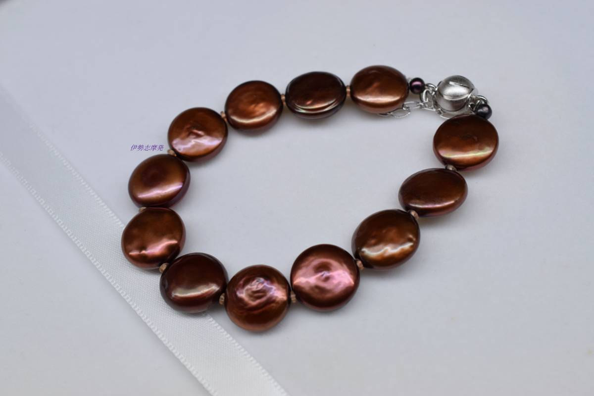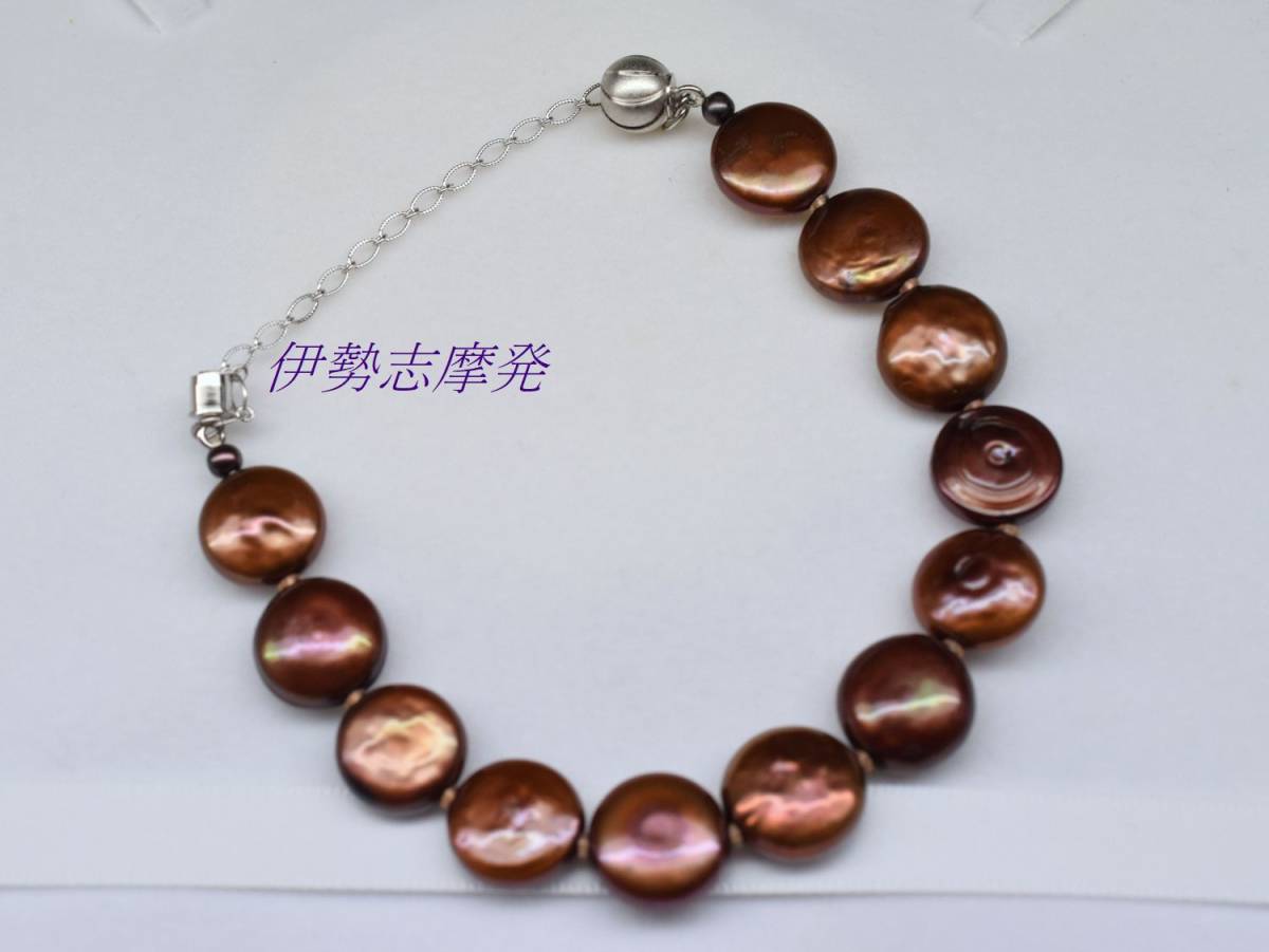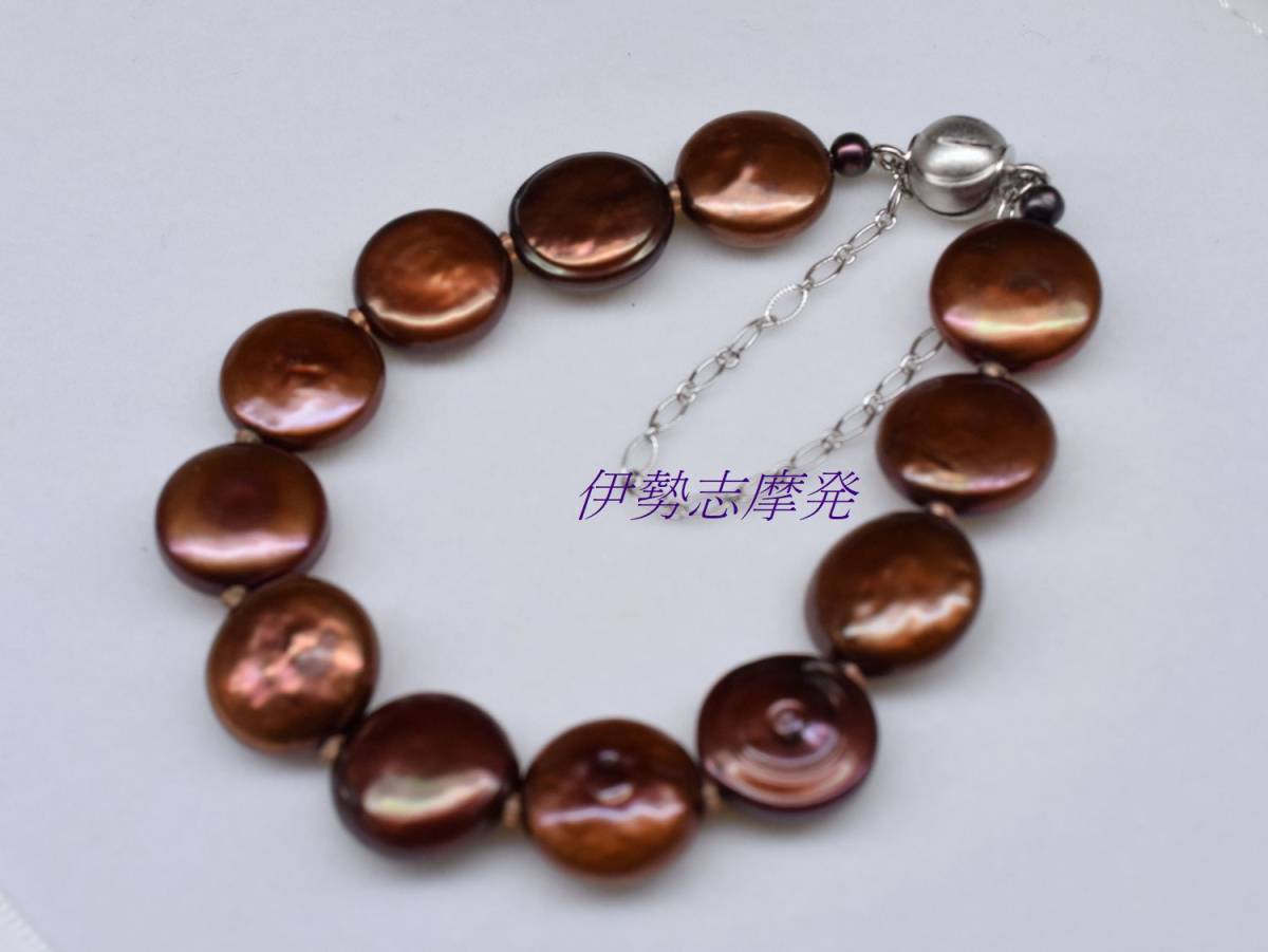 【真珠の種類】 淡水真珠 【珠サイズ】 12,8㎜ー11,9㎜ 【珠の形状】 特大コイン型 【色】 ブロンズゴールド 【巻き】 非常に良い◎ 【照り】 非常に良い◎ 【キズ】 巻き過ぎから出る巻きじわ 【エクボ】 少し・突起 【金具の材質】 シルバーチェーン 【デザインの大きさなど】17,5cm ◆深みのある大人カラーのブロンズゴールド色、季節に関係なくお使い頂けるお洒落なブレスレットをお作りしました◆ コイン型の淡水真珠はサイズも大きく12,8㎜から端の小さな物でも11,9㎜のボリュームのある高級コインです。 大変強い照り光沢に浮かぶブロンズカラーが、大人の女性のお洒落を際立たせてくれる素敵なブレスレット♪大きなコインなので仕上げが硬くならない様、コインとコインの間にはシリコンクッションを挟んで丁寧に組み上げました。 シルバーチェーン仕上げで端には同色の小粒も挟んで、脱着も簡単に行えますようマグネット式のクラスプで仕上げました。プレゼントにも美しいブレスは如何でしょうか。 | ||||||||