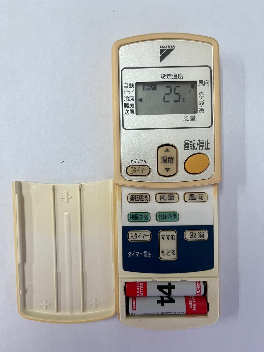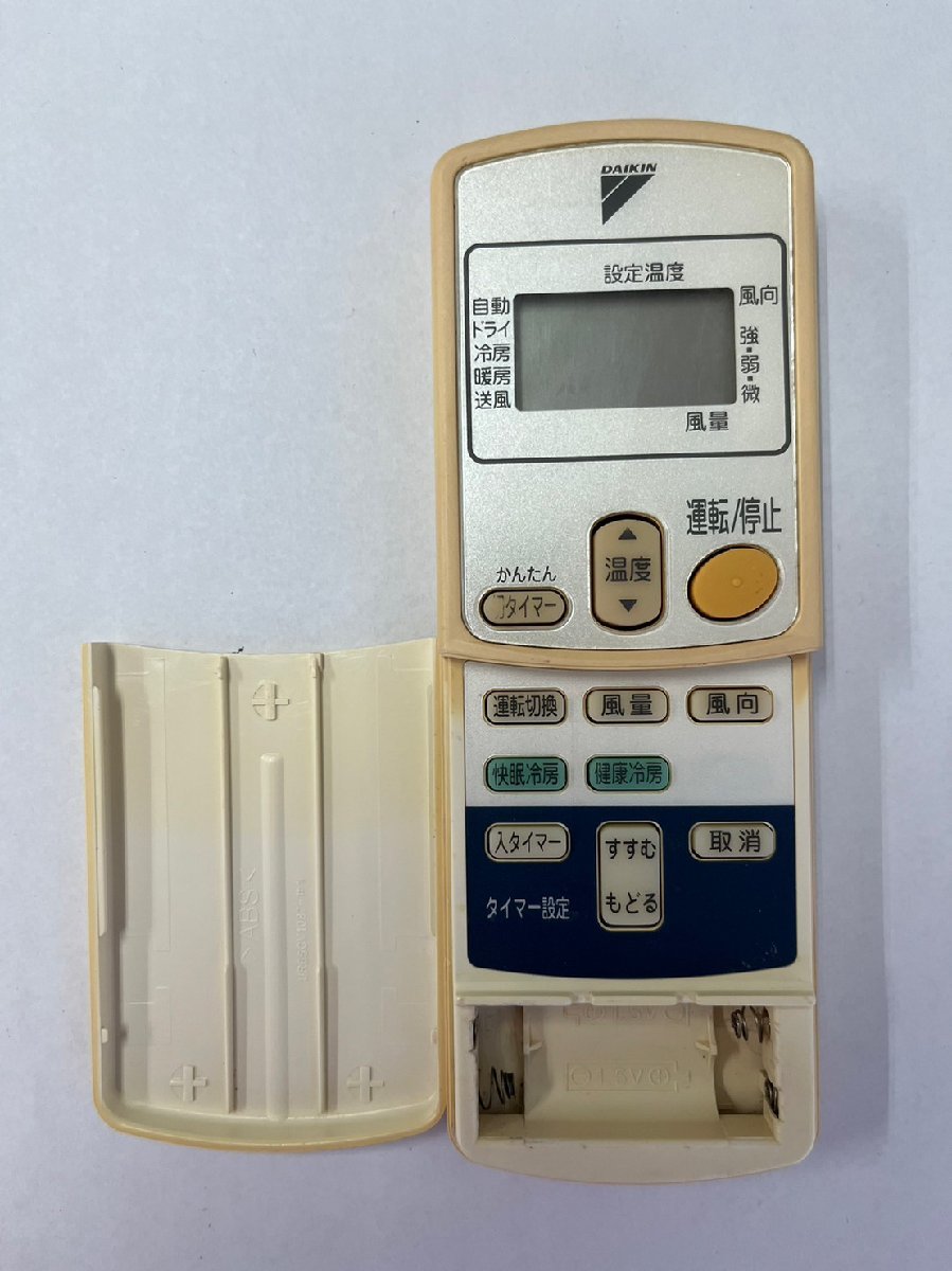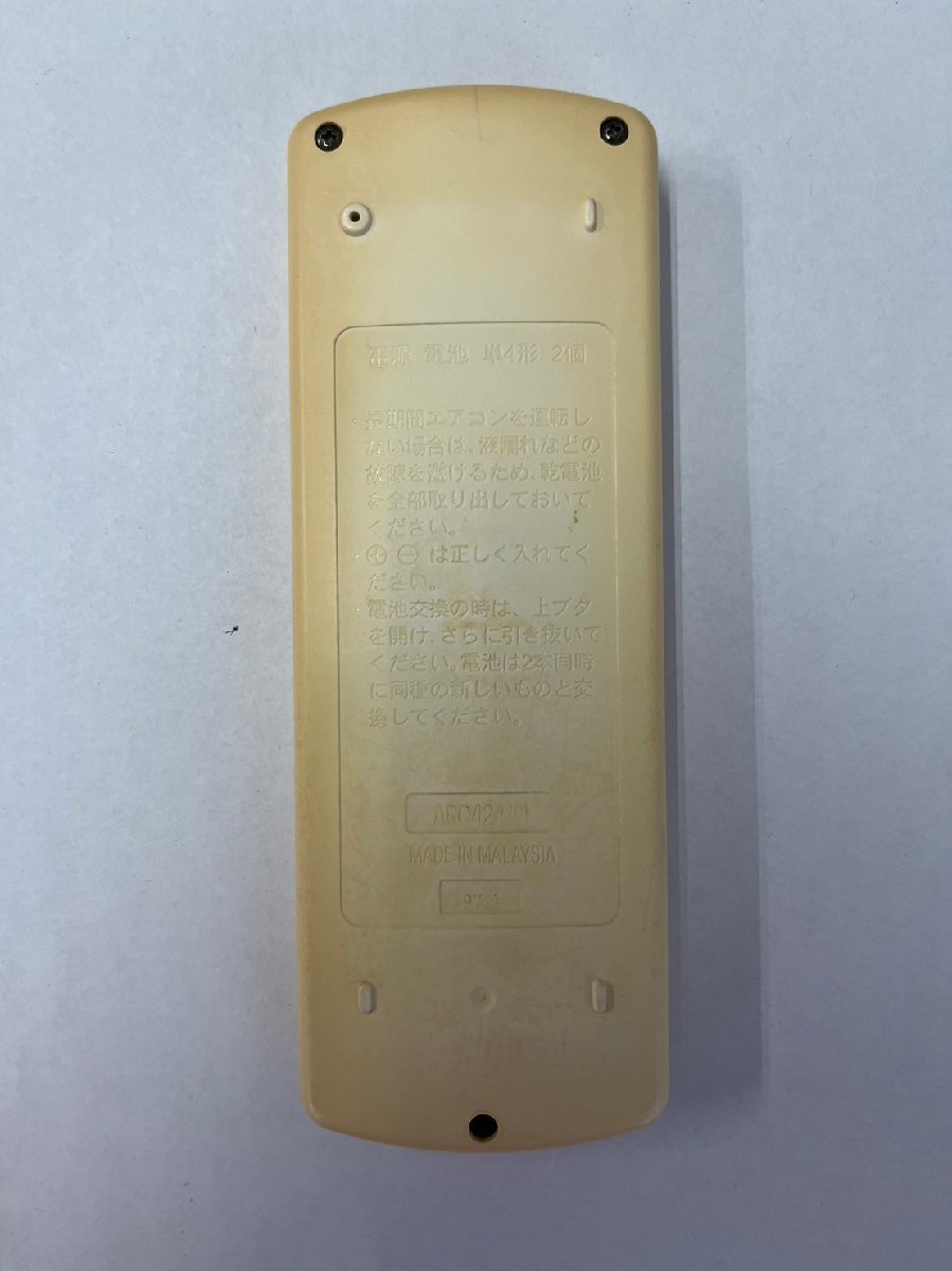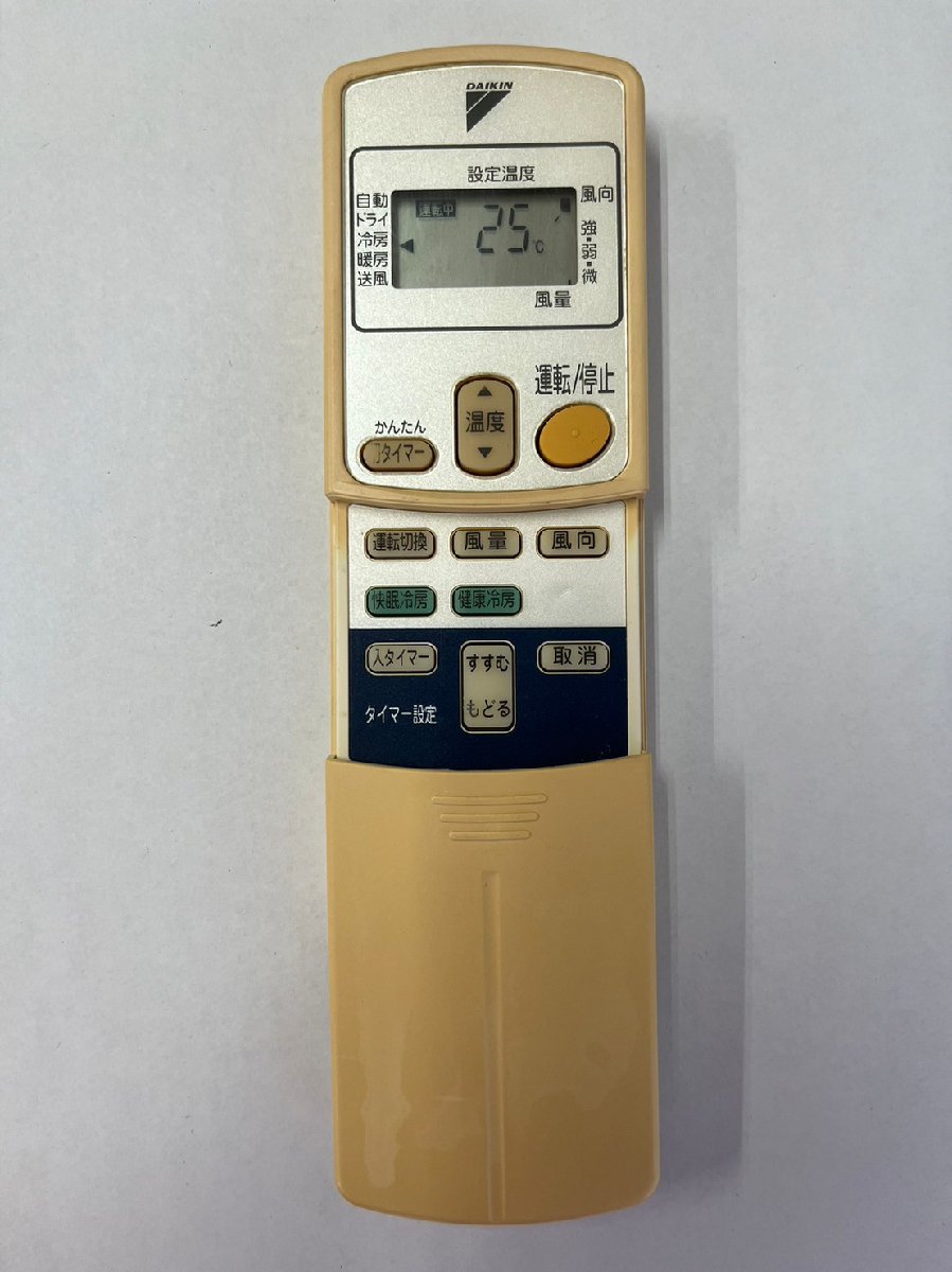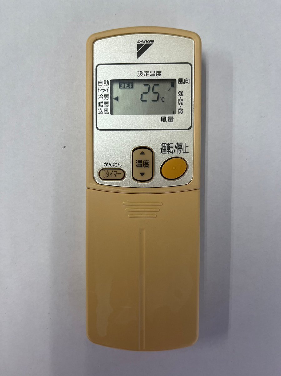 【DAIKIN ARC424A1 電池付き】リモコンのみの販売です。赤外線チェック済/クリーニング済。 経年による色あせや目立ったキズもなく、全体的にきれいな商品ですが中古商品という事をご理解のうえご購入ください。 商品が全体的にヤケがあるのと、赤外線部分が少し割れてます。 電池を入れて到着したらすぐ使えるようにしてお送りします。電池は接触しないように紙を挟んでおりますので、到着したら引き抜いてからご利用ください。電池や設定の問題を解決し、使用できるようになっています。 使用できない場合は到着後3日以内にまずストアにご相談をお願いします。 設定の問題、対応機種間違い、本体側の問題等、商品説明に書いてある不良を除き保証対象外です。対応機種についてのご質問はお答えできかねます。 各メーカーへお問い合わせいただくか、検索から各機種の取扱説明書をご確認ください。 中古リモコンは現品限りとなりますので、ご希望の商品がございましたらお早めにご購入ください。 ※他店でもこちらと同じ中古リモコンを販売しております。そのため他店でお客様より先に購入があった際は、大変申し訳ございませんがご購入いただいた商品はキャンセルとさせていただきます。あらかじめご承知ください。