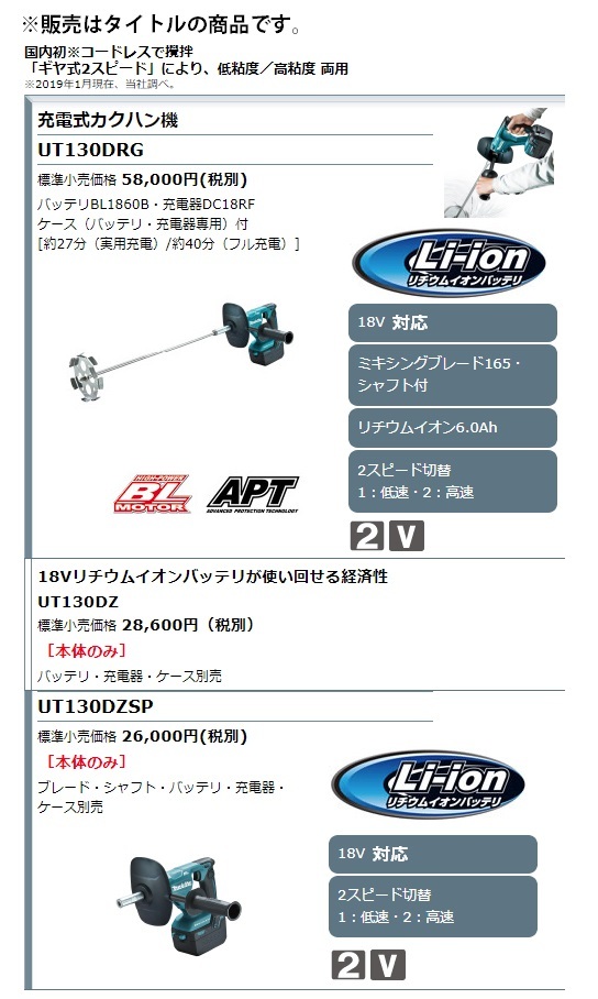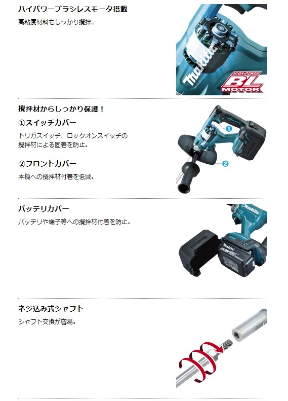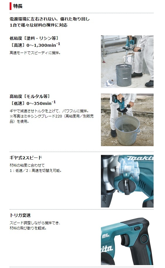 マキタ makita充電式かくはん機UT130D※販売はタイトルの商品です。■電源環境に左右されない、優れた取り回し1台で様々な材料の攪拌に対応・低粘度[塗料・リシン等] [高速]0~1,300min-1 高速モードでスピーディに攪拌。・高粘度[モルタル等] [低速]0~350min-1 ギヤで減速させトルクを上げて、パワフルに攪拌。■ギヤ式2スピード 材料の粘度に合わせて 1:低速/2:高速を切替え可能。■トリガ変速 スピード調整しながら攪拌でき、材料の飛び散りを軽減。■ハイパワーブラシレスモータ搭載 高粘度材料もしっかり攪拌。■攪拌材からしっかり保護!(1)スイッチカバー トリガスイッチ、ロックオンスイッチの攪拌材による固着を防止。(2)フロントカバー 本機への攪拌材付着を低減。■バッテリカバー バッテリや端子等への攪拌材付着を防止。■サビにくいステンレス製ブレード&シャフト ミキシングブレード165[低粘度用]付※UT130DZSPは除く■「アプト」防滴・防じん本製品は水や粉じんに対する影響が抑えられる様に 設計されていますが、 水や粉じんによって 故障しないことを保証するものではありません。
