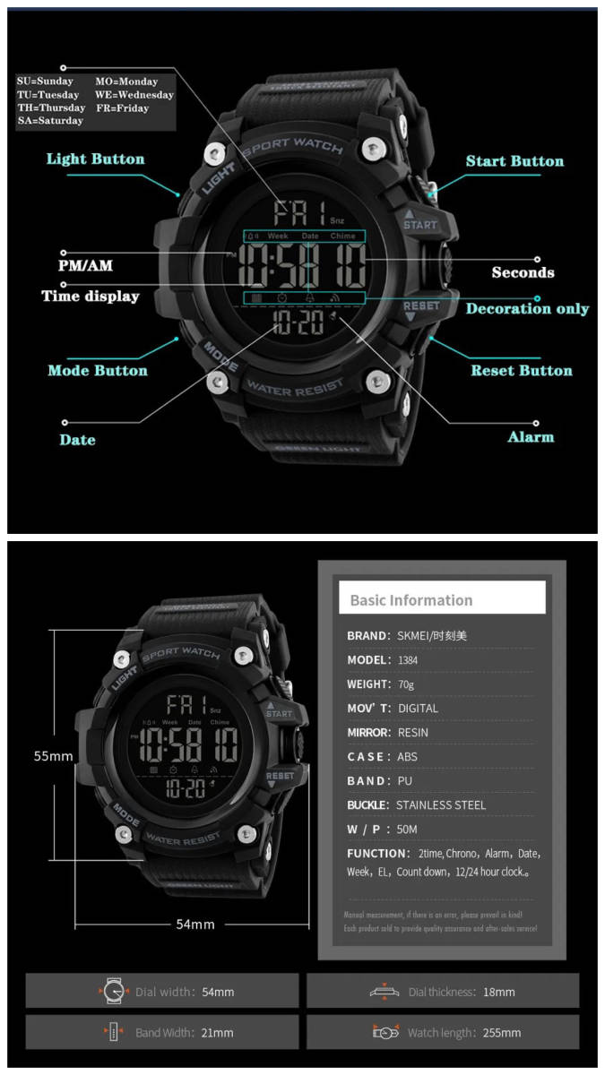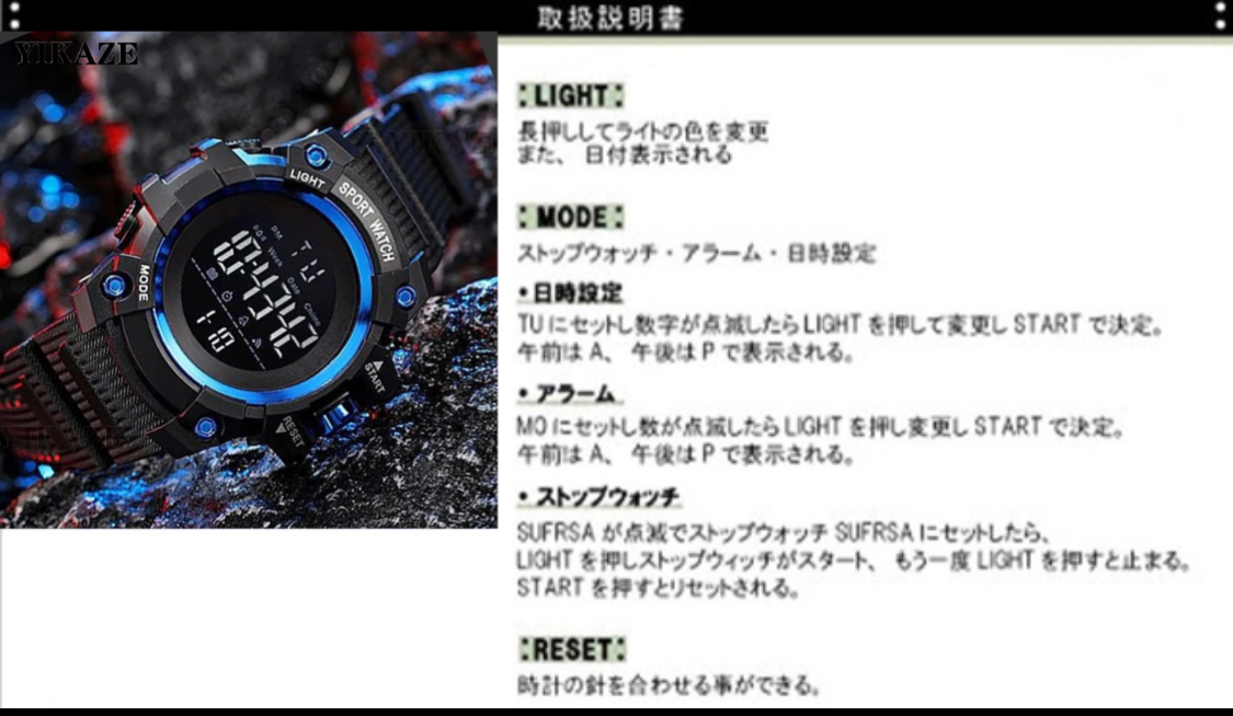 時間、曜日と日付のLEDディスプレイ ・アラームと時報 ・12/24Hフォーマットオプション ・ストップウォッチなど多機能ウォッチでございます。
