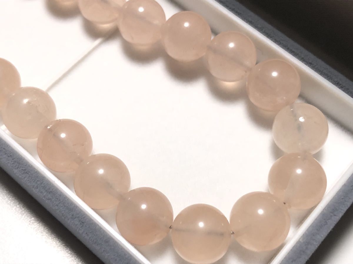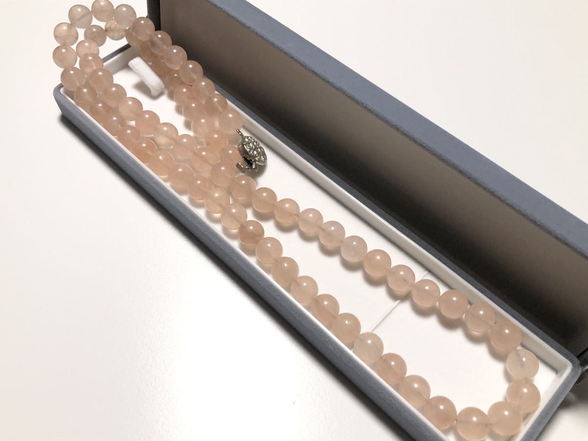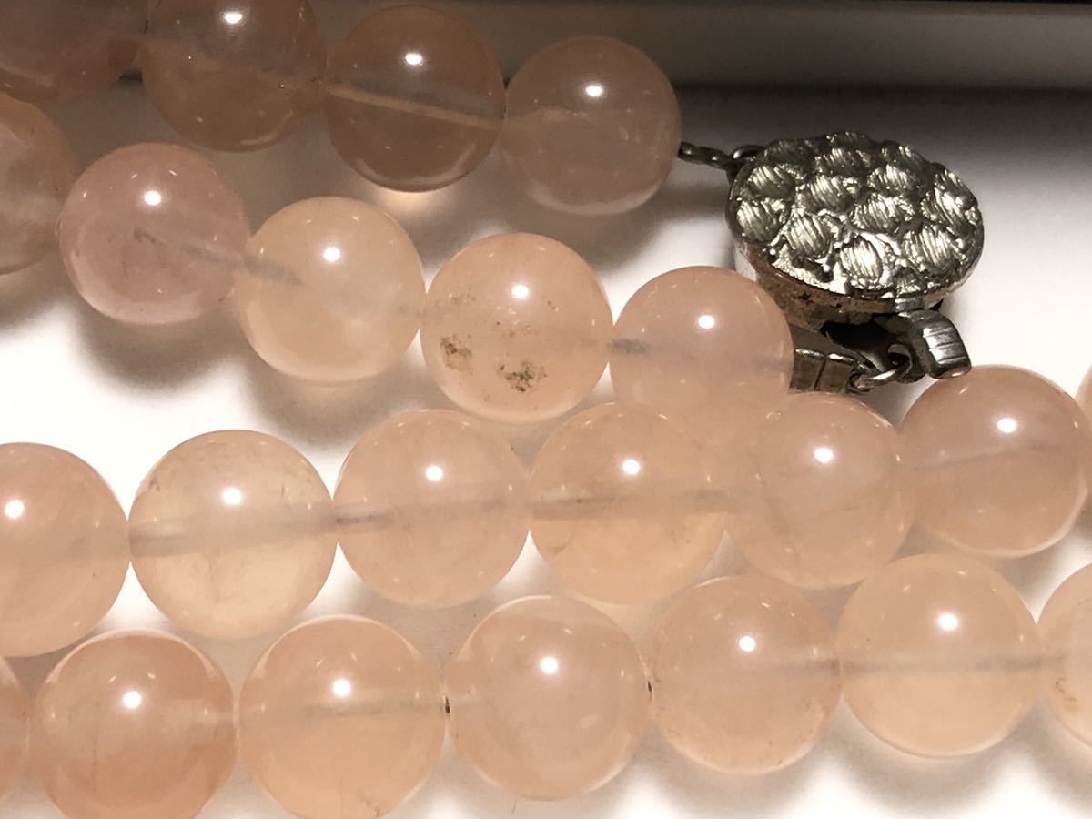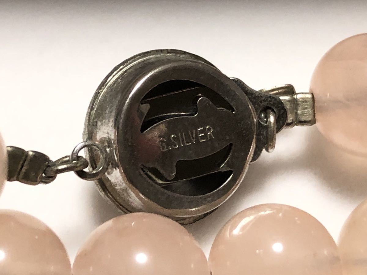 ローズクォーツを使用した、1.0㎝玉のロングネックレスです。金具部分には、GSILVERの刻印があります。