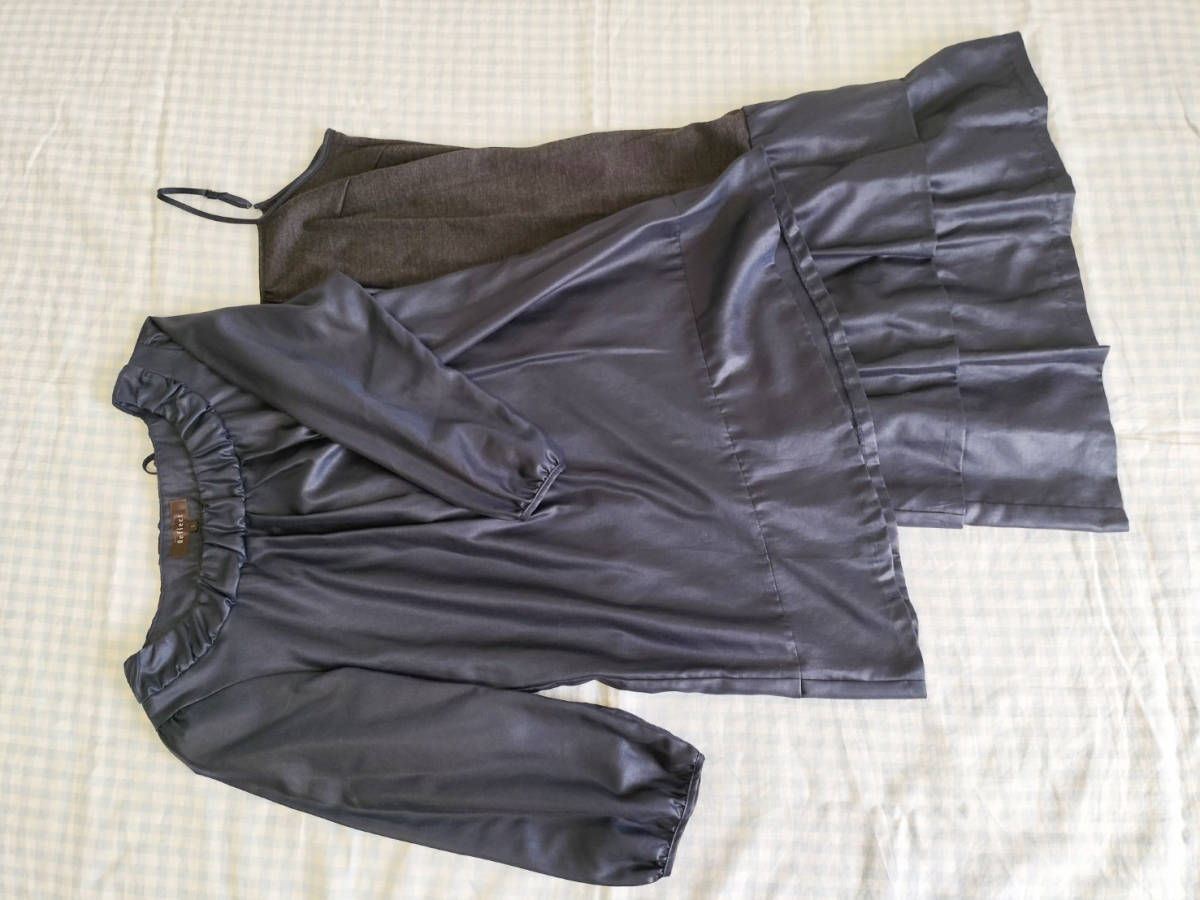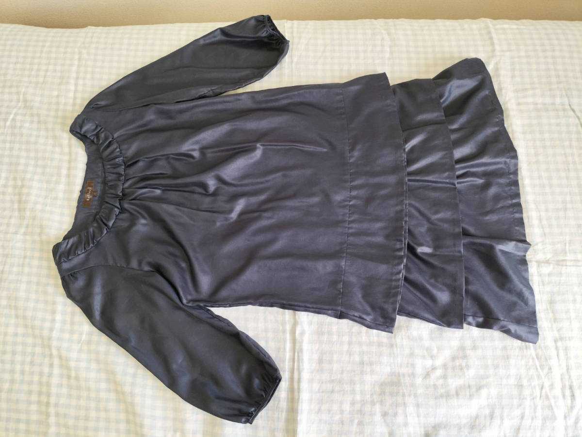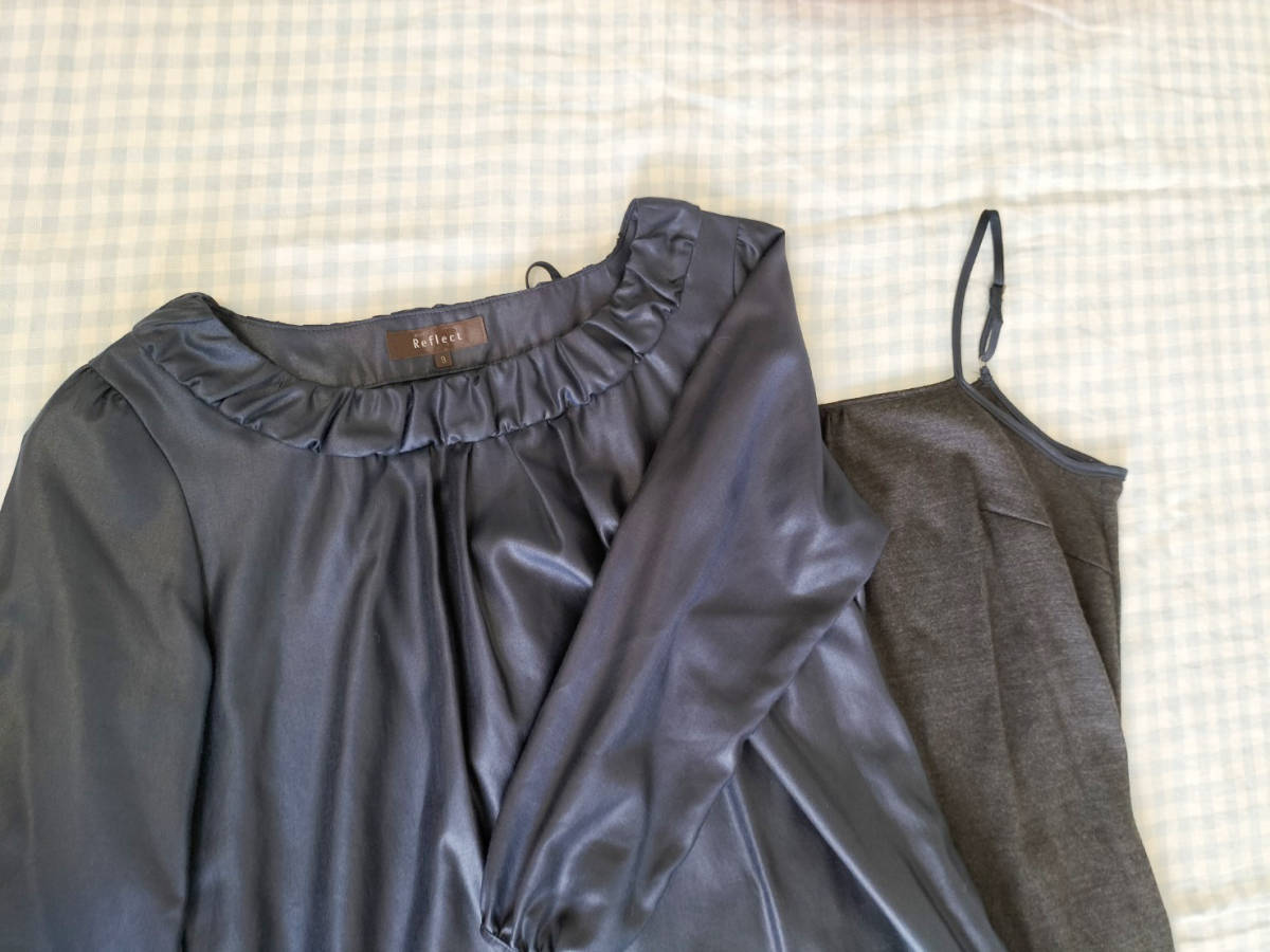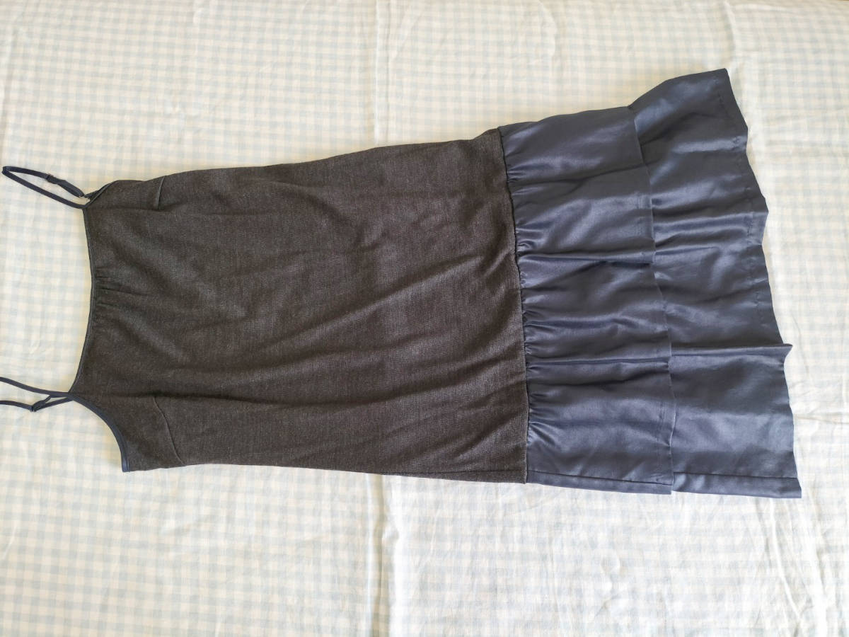 色は紺 キャミソール部分は濃いグレー 2枚重ねで着るタイプです。 素材:毛100%(グレー)ポリエステル100% 日本製 サイズ9(M) チュニック:肩幅36cm胸幅50cm袖丈44cm着丈67cm ワンピース:肩幅24cm胸幅44cm着丈92cm前後(肩紐のアジャスターで調節できます。) 他にも洋服、バッグ、靴、小物、本を出品していますので見てください。