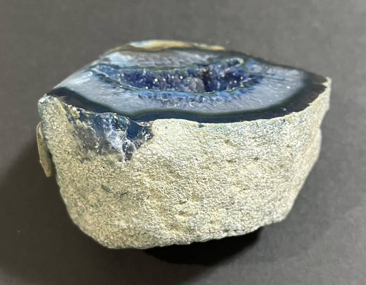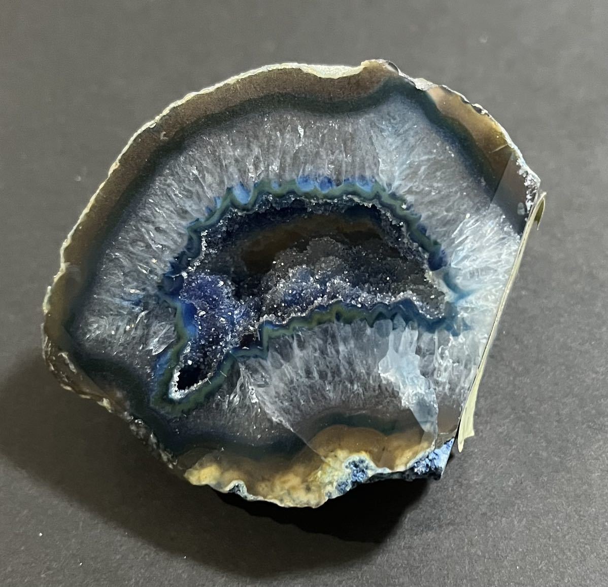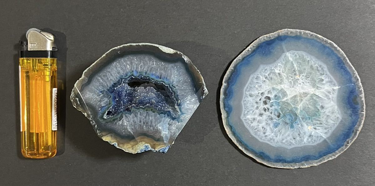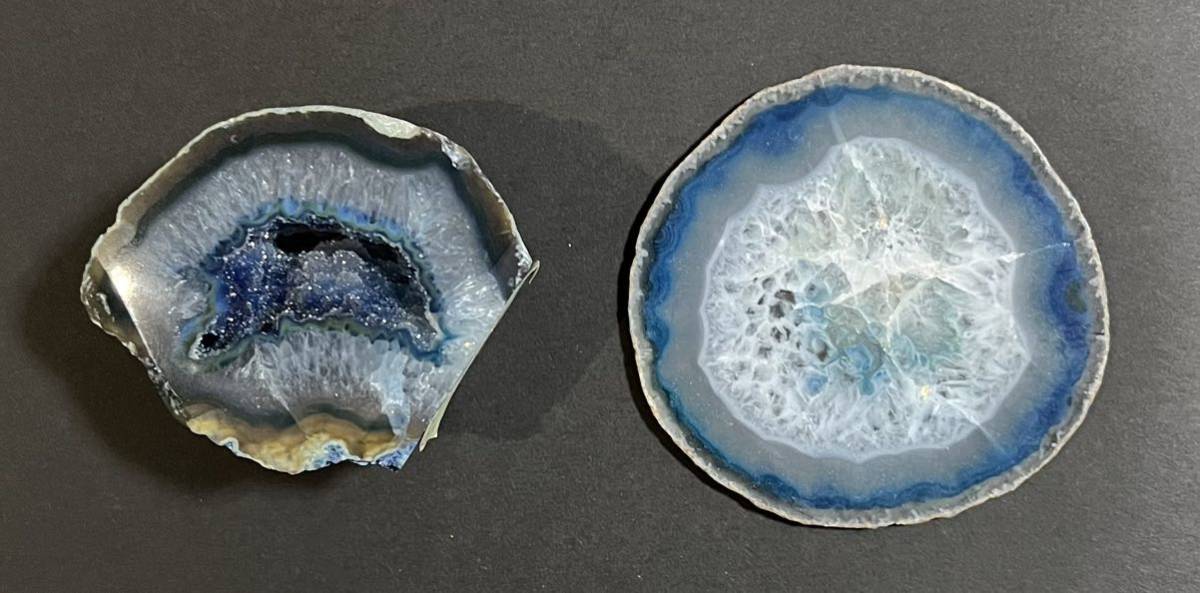 【2】「メノウ?スライス・ストーン」→同上の経緯の古物ですが、詳しく無いもので石の種類がよく分かりません。Googleで調べたメノウのスライス・ストーンや上記の原石によく似ているので「メノウ?」と表記しましたが、間違えておりましたらご容赦下さい。断面にいくつかの線が走っており、それが模様であるのかヒビであるのか素人の当方ではよく分かりません。ヒビだとしても破断してバラけてしまうような感じではありませんが、あくまでもオマケ扱いの品物ですのでご了承下さい。