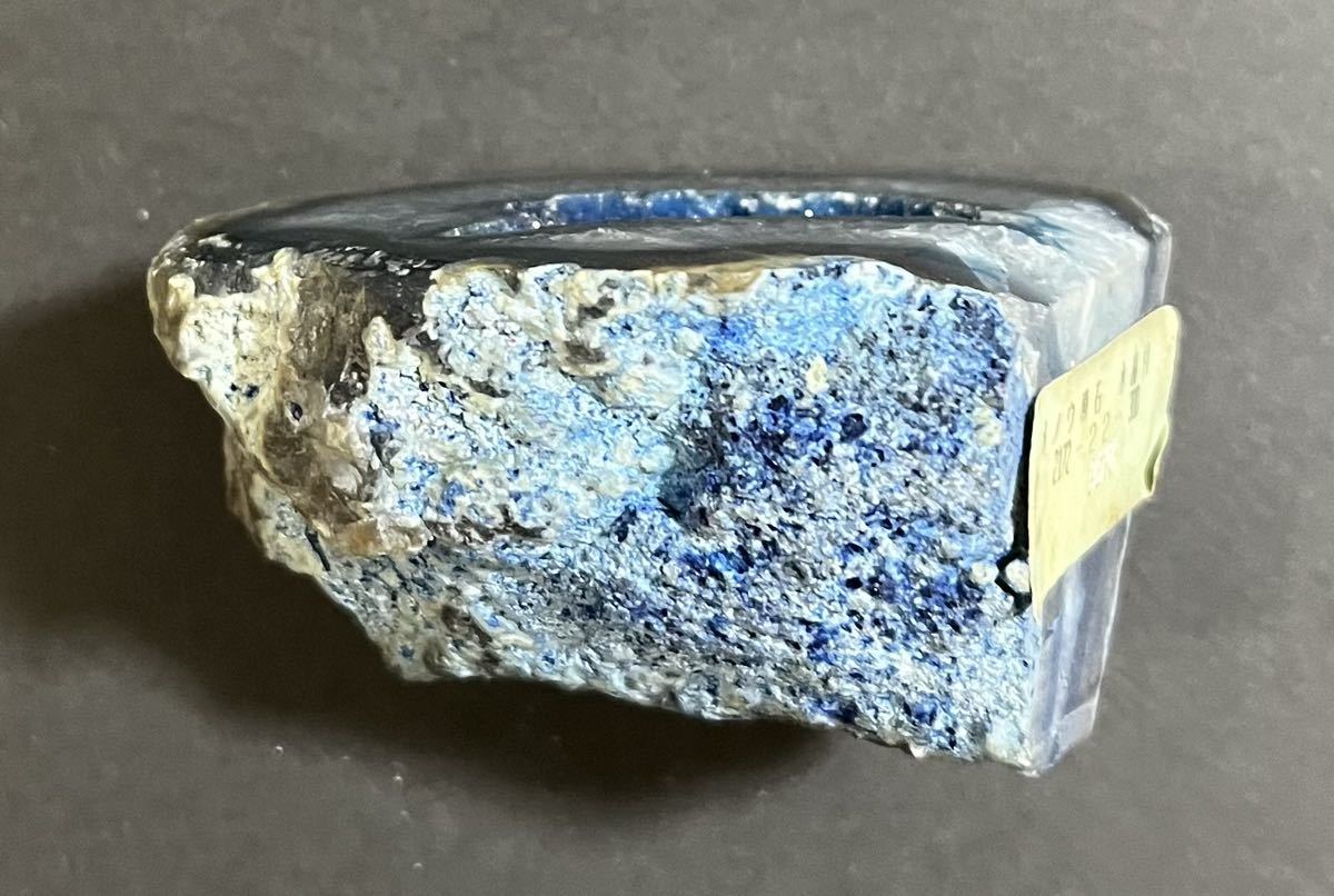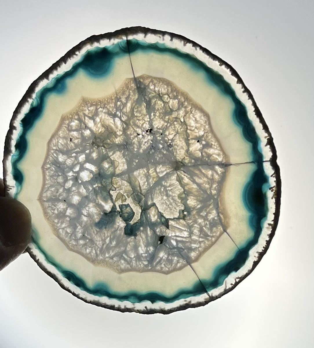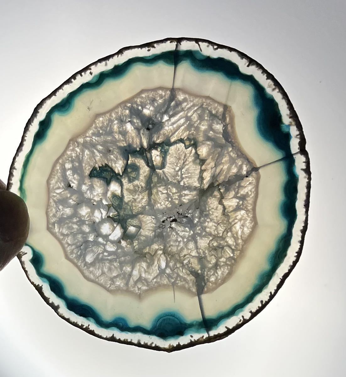 【2】「メノウ?スライス・ストーン」→同上の経緯の古物ですが、詳しく無いもので石の種類がよく分かりません。Googleで調べたメノウのスライス・ストーンや上記の原石によく似ているので「メノウ?」と表記しましたが、間違えておりましたらご容赦下さい。断面にいくつかの線が走っており、それが模様であるのかヒビであるのか素人の当方ではよく分かりません。ヒビだとしても破断してバラけてしまうような感じではありませんが、あくまでもオマケ扱いの品物ですのでご了承下さい。