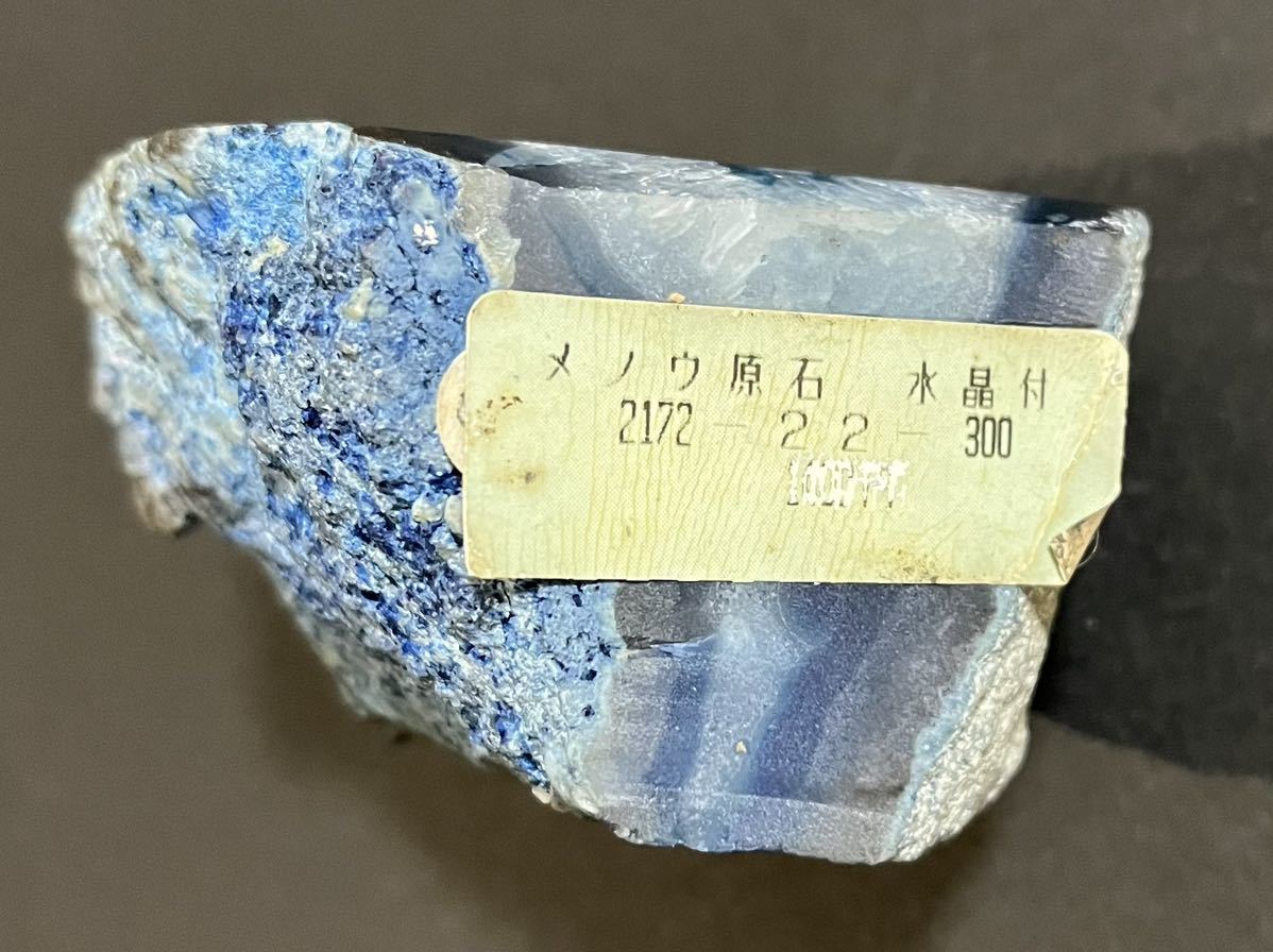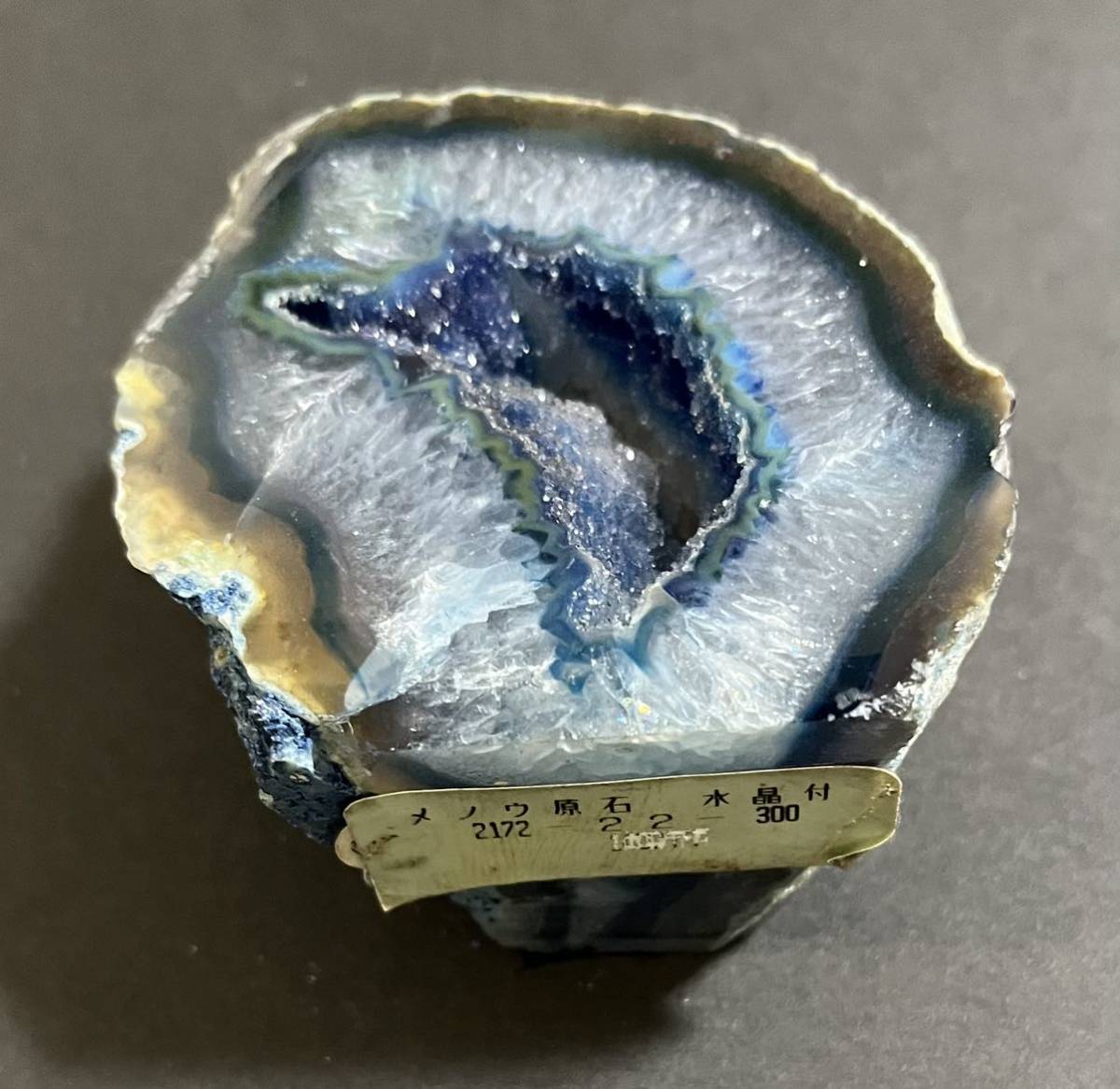 【1】「メノウ原石 水晶付」→と表記されたシールが貼ってあります。実家の押入れから出て来た古物ですので細かな傷や汚れが見られますが、経年を考慮すればそれほど状態は悪く無いと個人的には思います。重量感があり、とても綺麗な原石ではないかと思います。