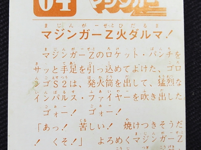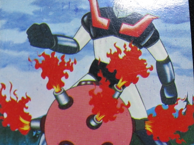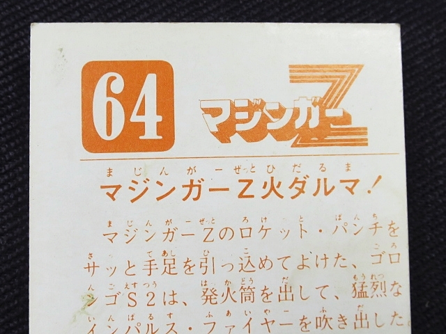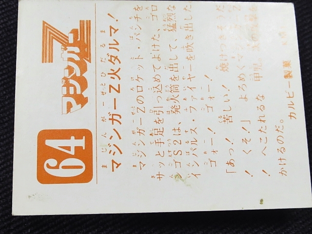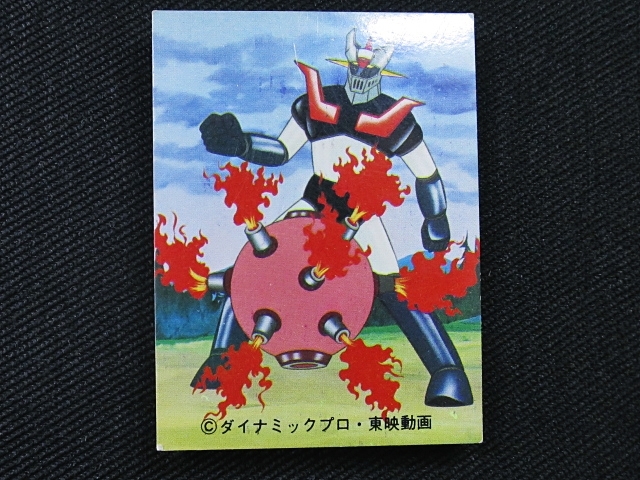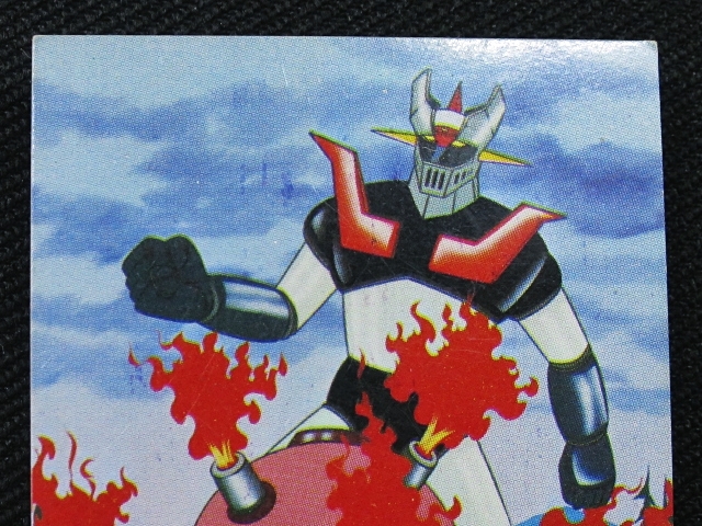 マジンガーZ ミニカード カルビースナックカード 70年代 バラ売り(1枚) ・メーカー:カルビー ・サイズ:6.6 cm x 5.1 cm ・製造・販売:1973年~ カルビースナックのおまけカード ・構成・001-306番 ・同梱発送可能(複数落札の場合、送料が変わる場合があります。) 〓参考項目〓 ・原作:永井豪とダイナミックプロ ・キャラクターデザイン:羽根章悦→森下圭介 ・音楽:渡辺宙明 ・アニメーション制作:東映動画 ・製作:東映動画、旭通信社 ・放送局:フジテレビ ・放送期間:1972年12月3日-1974年9月1日 ・話数:全92話 ※ 声優 ・兜甲児:石丸博也 ・弓さやか:松島みのり ・兜シロー:沢田和子 ・弓教授:八奈見乗児 ・あしゅら男爵(男):柴田秀勝 ・あしゅら男爵(女):北浜晴子 | ||