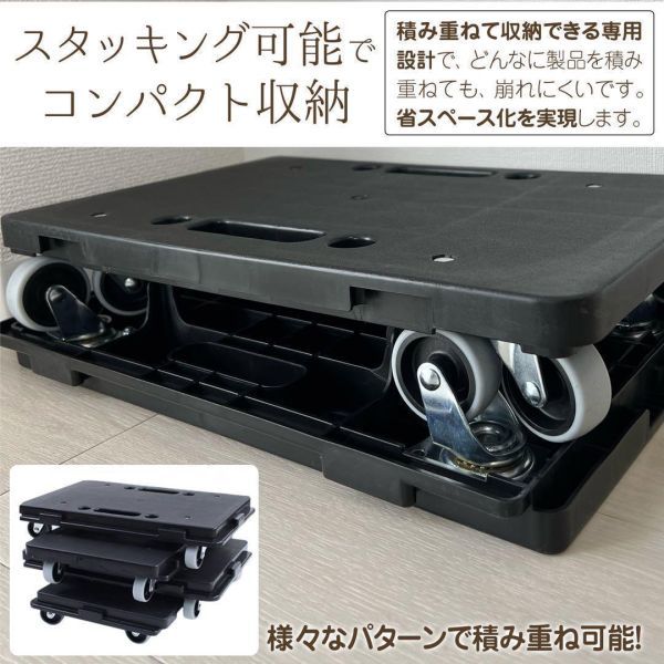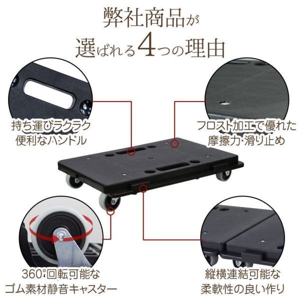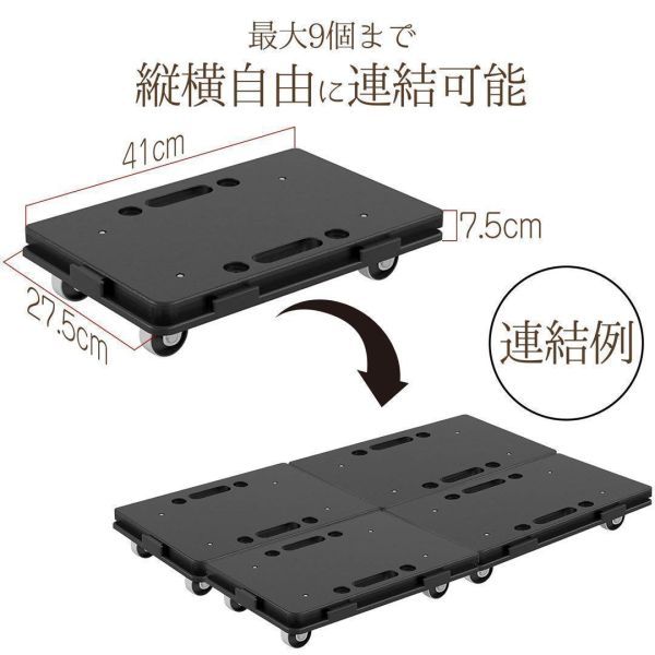 ご家庭では家電、衣装ケース、米びつ、飲料ケース等の移動をスムーズに行えます。オフィスではコピー用紙、配達物。 工場では機械類。 アウトドアではクーラーボックス、コンテナボックス等 様々な場面であらゆるものを載せて運ぶことができます。台車の高さが地上高7.5cmと非常に低く設計されているため簡単に積載できます。