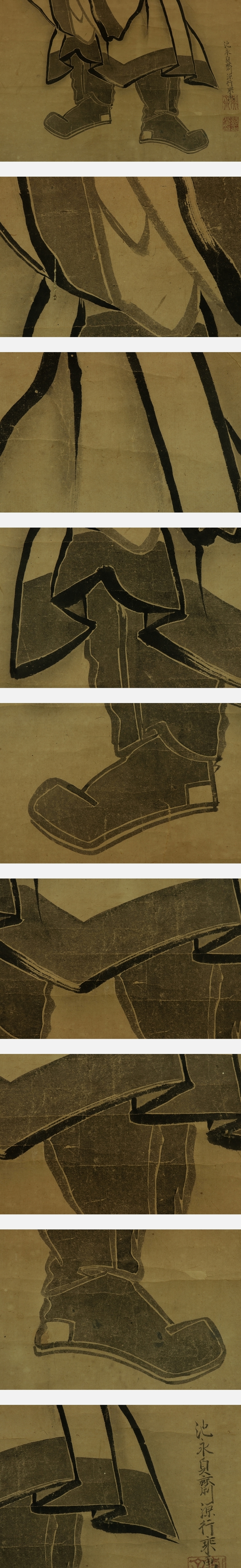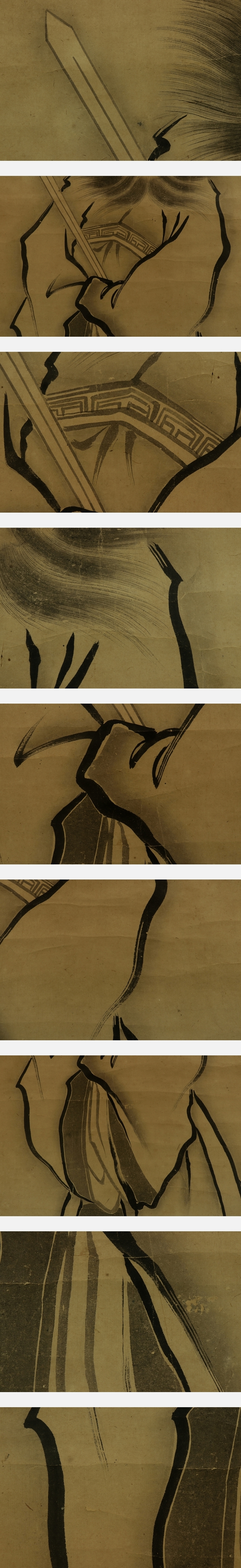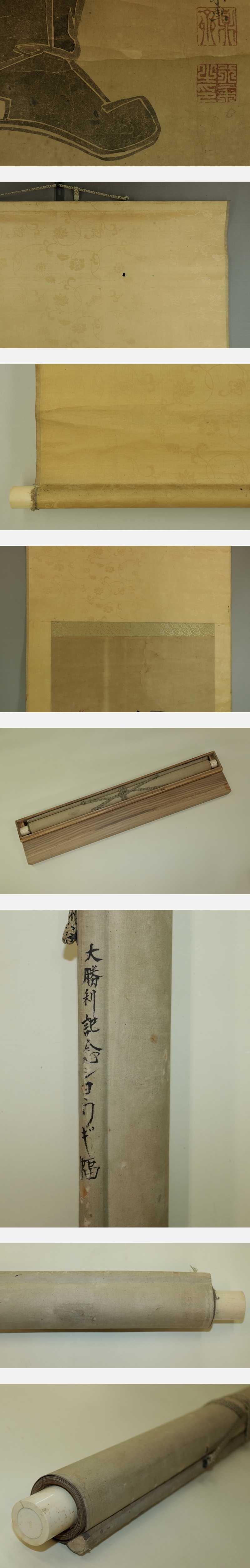 古画【鍾馗】 本紙は、染み、汚れ、強い折れ、皺、虫食い、破れ、擦れ、ヤケがあります。 表装は、染み、汚れ、強い折れ、皺、虫食い、破れ、ほつれ、剥れ、くすみ、 軸先に汚れとヒビがあります。 【サイズ】 作品 横約53.5cm×縦約113cm 表装 横約66.5cm×縦約186cm |