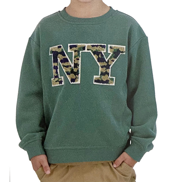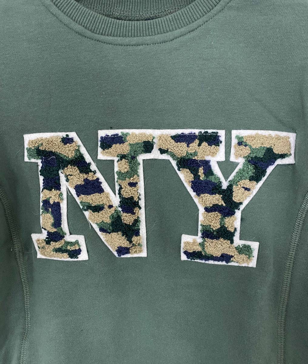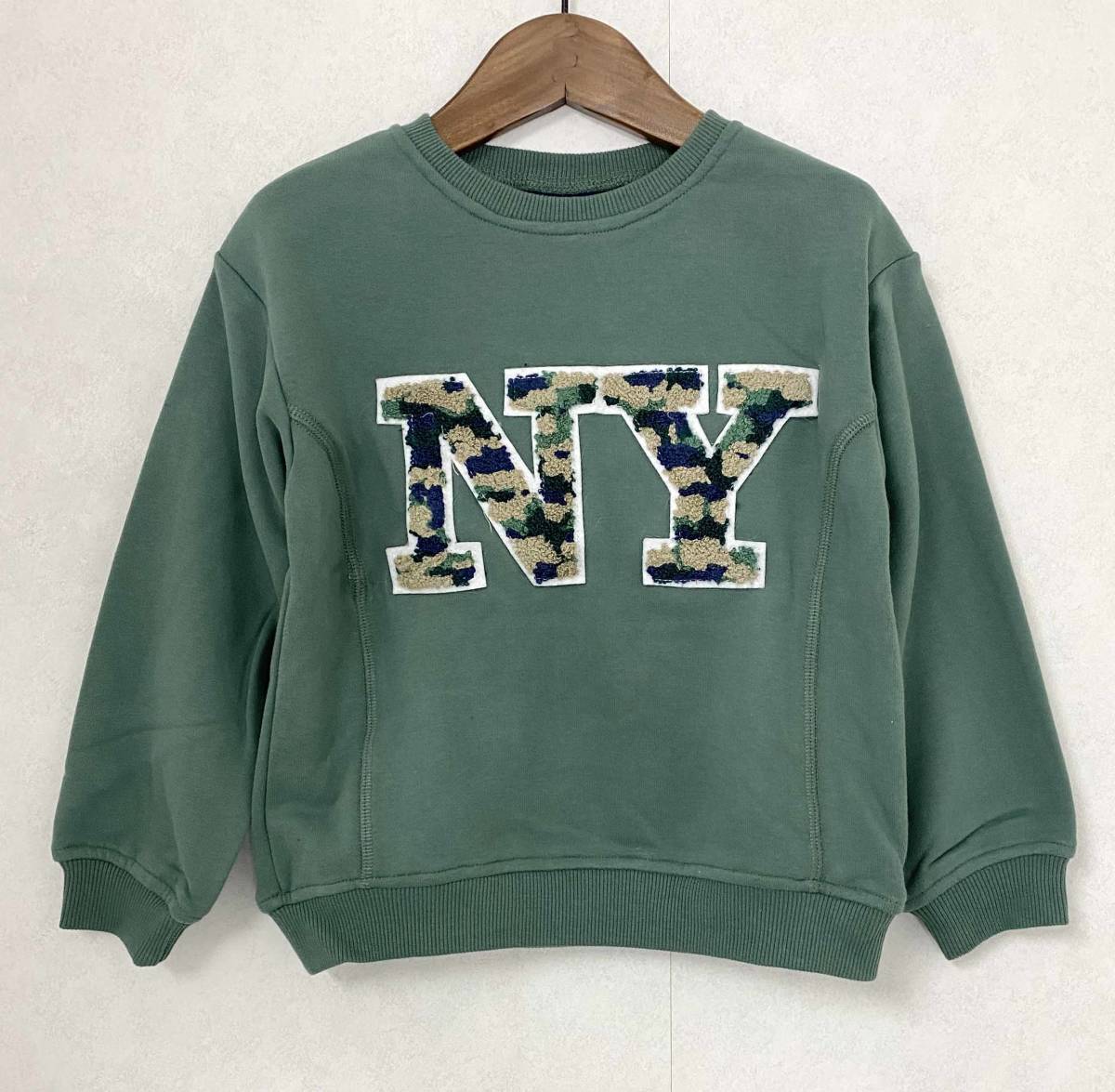 新品 110 ★ コストコ ANDY&EVAN キッズ トレーナー グリーン NY 裏毛 4T スウェット シャツ ビッグワッペン 子供用 ボーイズ ガールズ