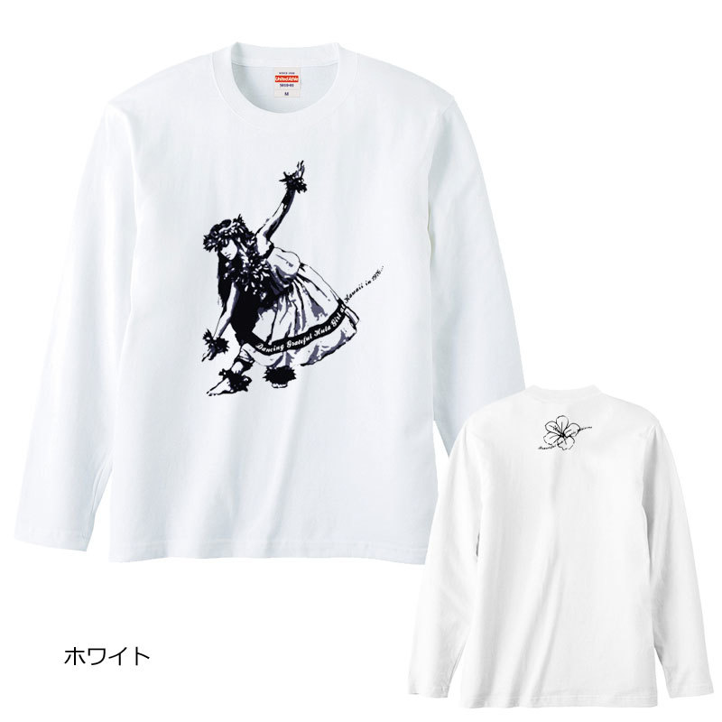 レディースM対応(タグ表記男女兼用S)/ホワイト*ダークネイビー絵画風フラガール&ハイビ*長袖Tシャツフラダンス/ハワイ/送料無料【tl093】