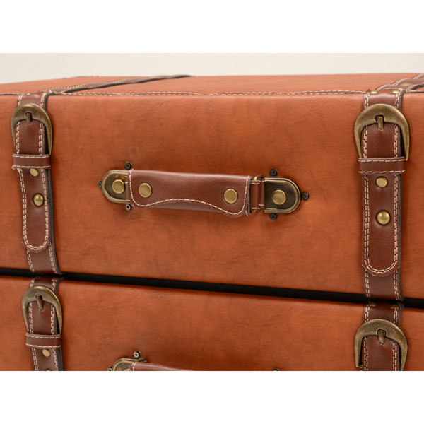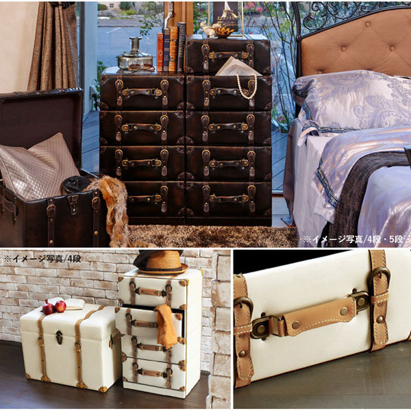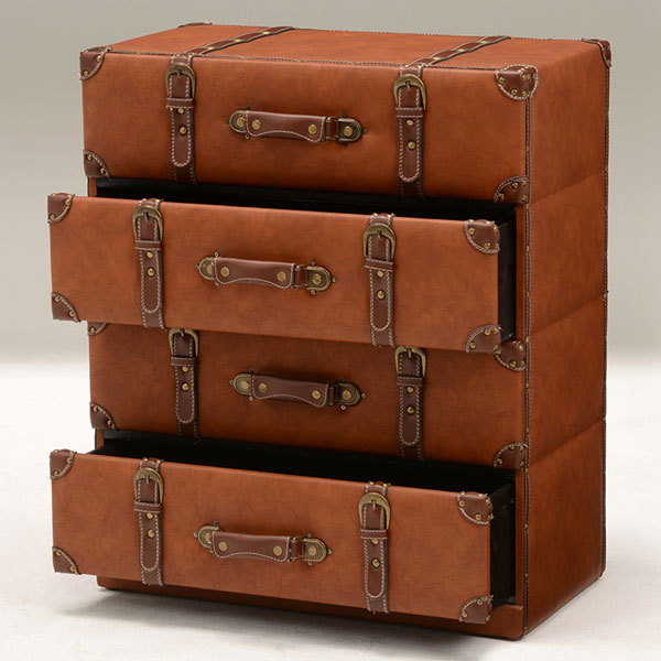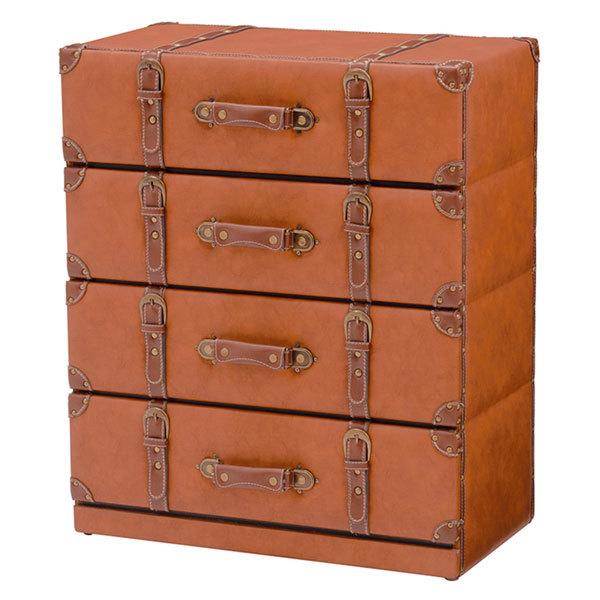 トランク風チェスト 引出し付き収納 ライトブラウン色 61センチ幅 4段引出し ワイド幅 完成品古いトランクをモチーフにした遊び心溢れるワイド幅のチェストです。リアルな質感と本格的なデザインがお部屋の中で存在感を発揮します。古い宝箱のような味わいのある合皮レザーと使い込んだような金具のデザインがポイント。細部のパーツひとつひとつの質感やデザインにこだわり、リアルさを追求しました。奥行がたっぷりあるので衣類や小物、本やCD等が収納可能。布張りなので大切なものの収納にもぴったりです。◇サイズ:幅61×奥行32×高さ72センチ◇主材:繊維板、合成皮革◇完成品☆落札、ご入金確認後 1~2日にて発送いたします 追加納期のかかるものは商品ページに記載いたしております よろしくお願いいたします。