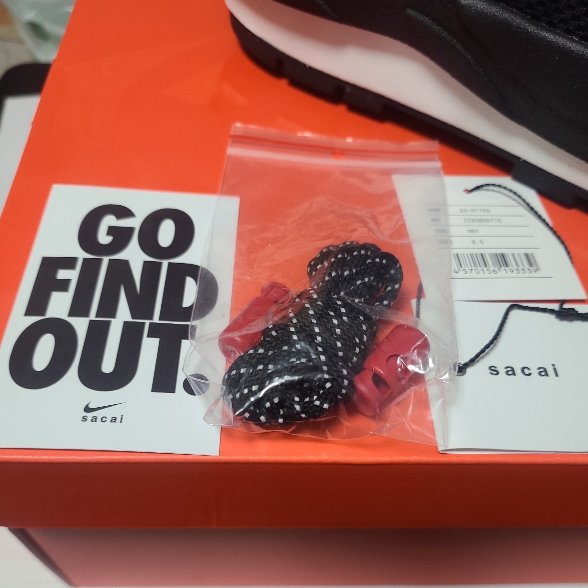 変えの紐と黒タグ、sacaiタグ、ミニステッカーが付属します。
