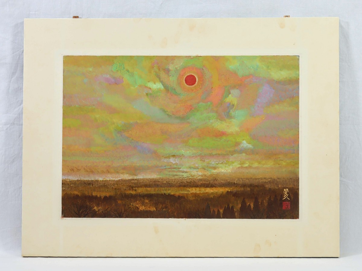 真作 三輪晃久 日本画「そら」画寸41.5cm×28cm 6号 京都府出身 日展評議員 東丘社代表 堂本印象に師事 豊かな色彩感覚で描く空と大地 8047