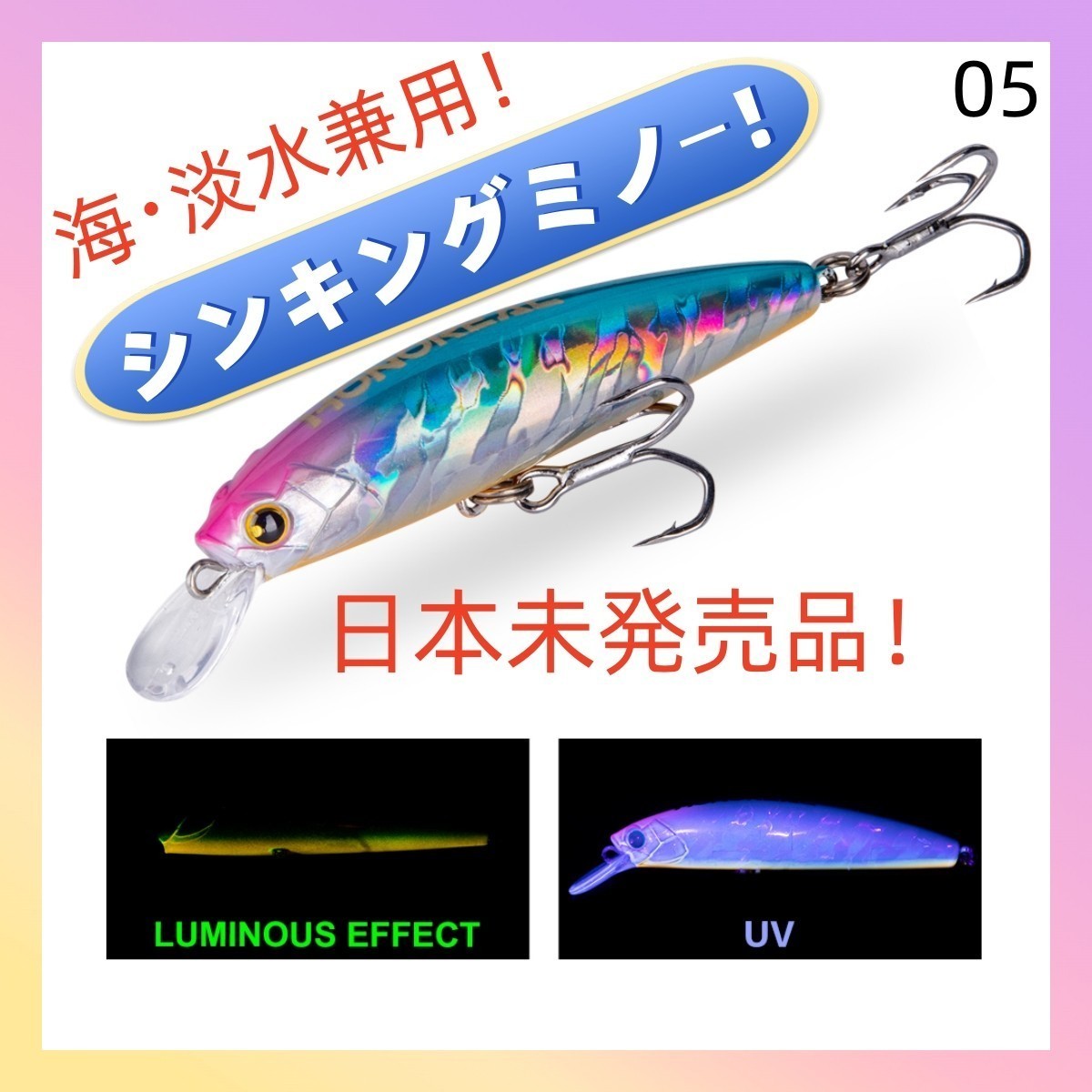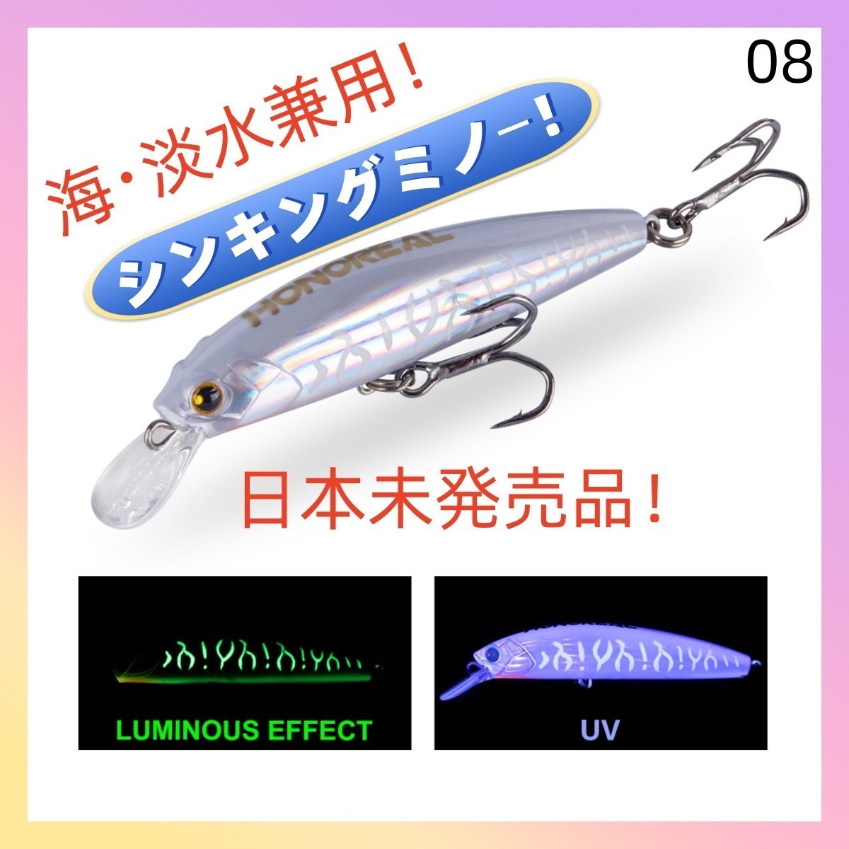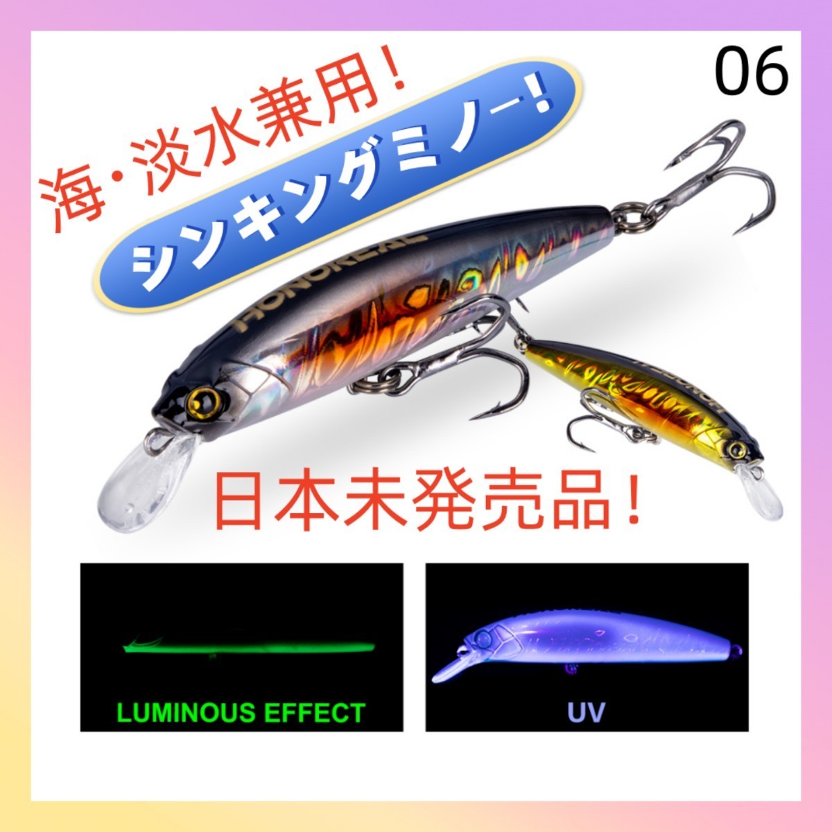 ・グロー加工※写真参照(紫外線により光を蓄え自ら発光。夜釣りなどでとても重宝します。)