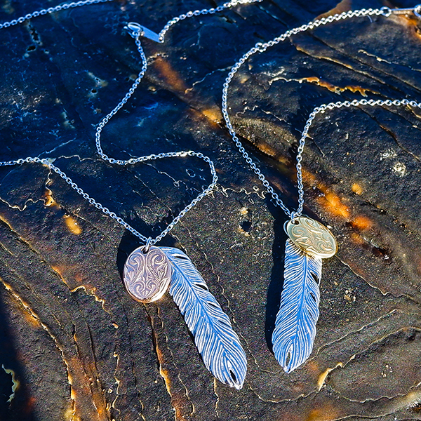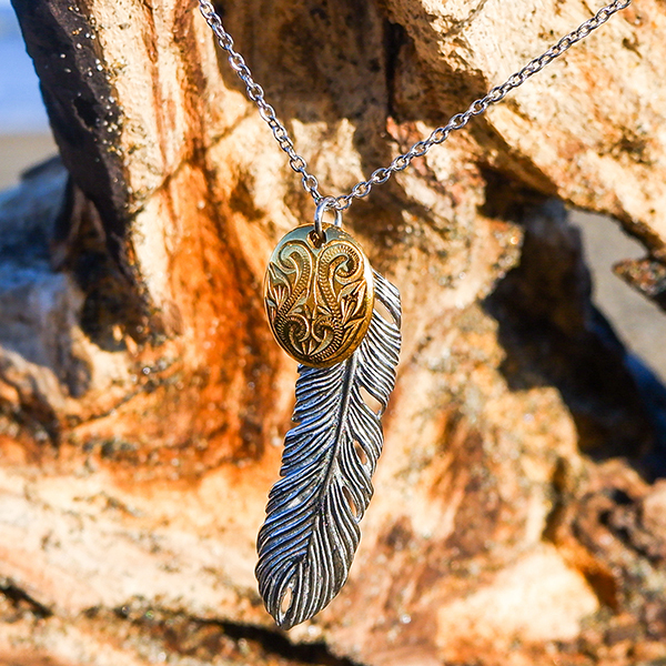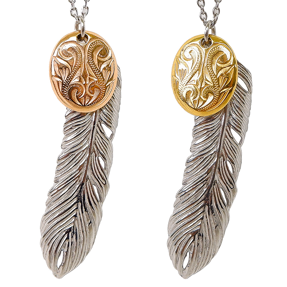 ステンレスネックレス フェザー羽&エッグコイン型チャーム