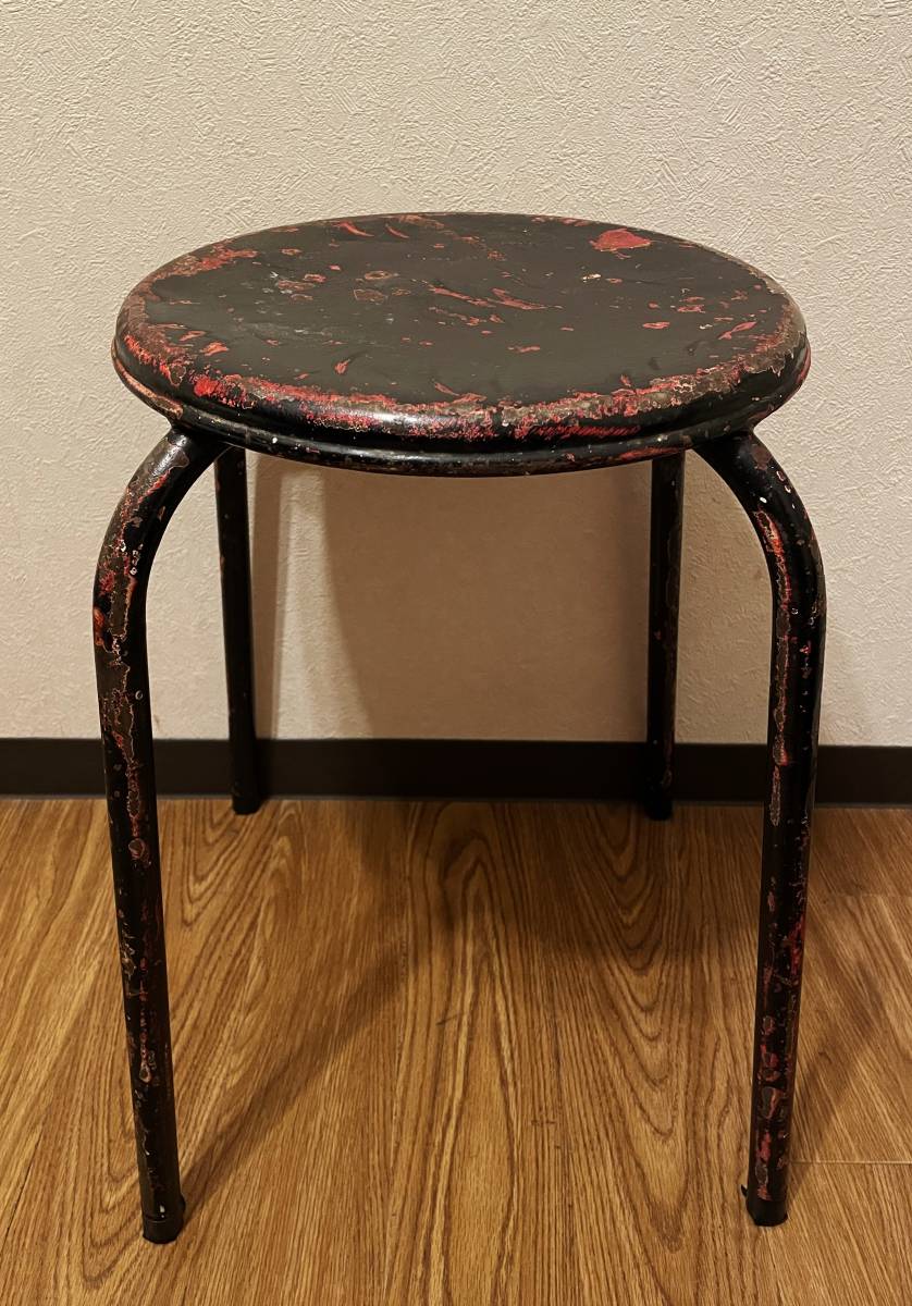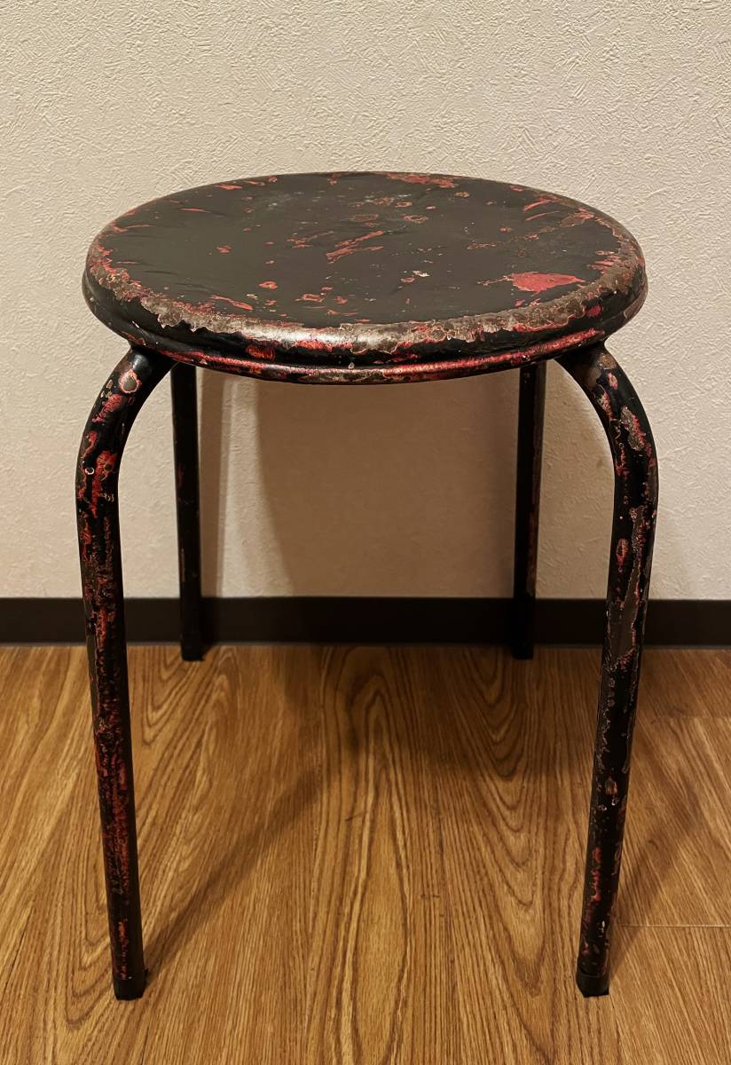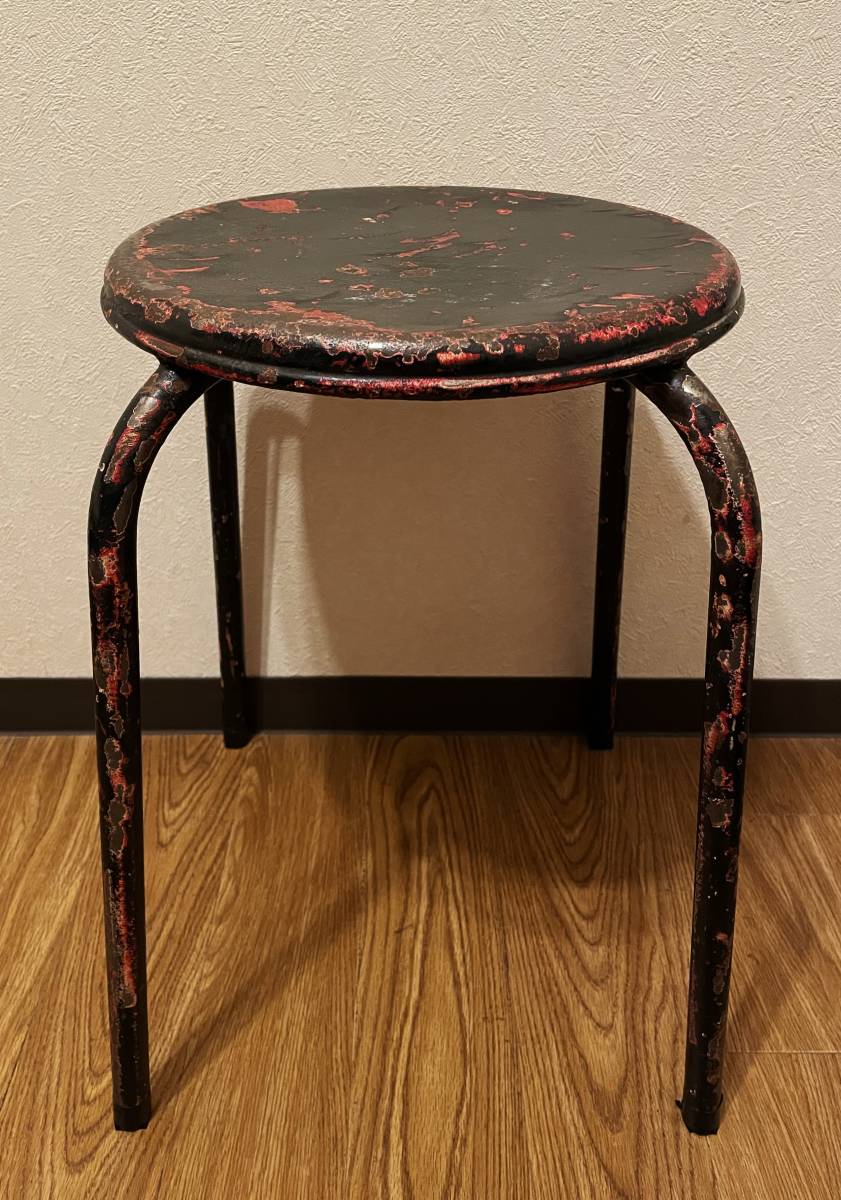 雰囲気◎黒塗り赤アンティーク丸椅子スツール鉄アイアン製シャビー錆味インダストリアル古美ブロカント店舗ディスプレイ演出ビンテージ什器