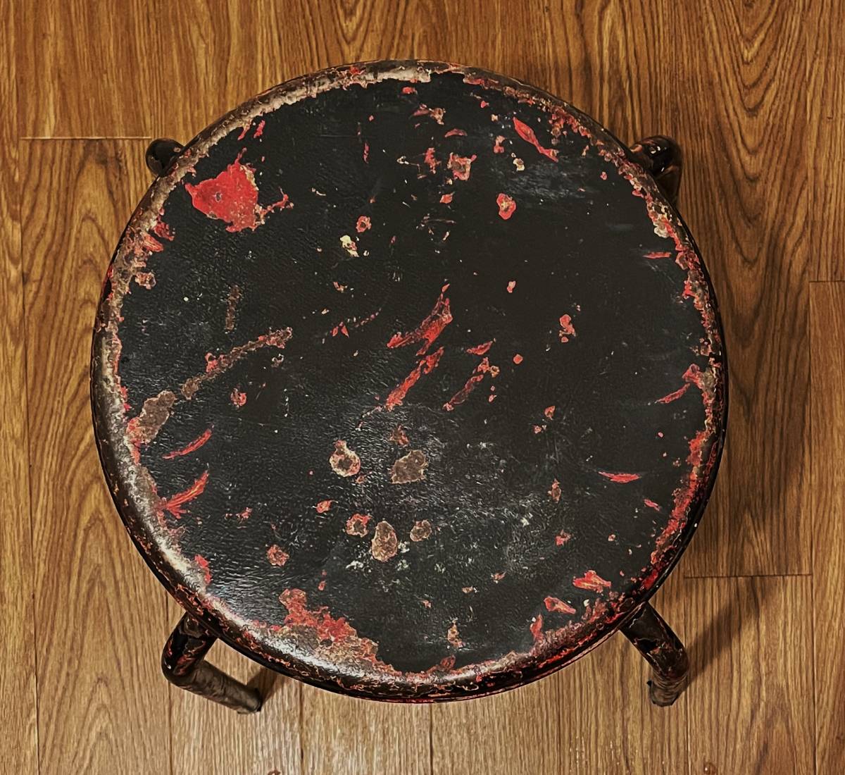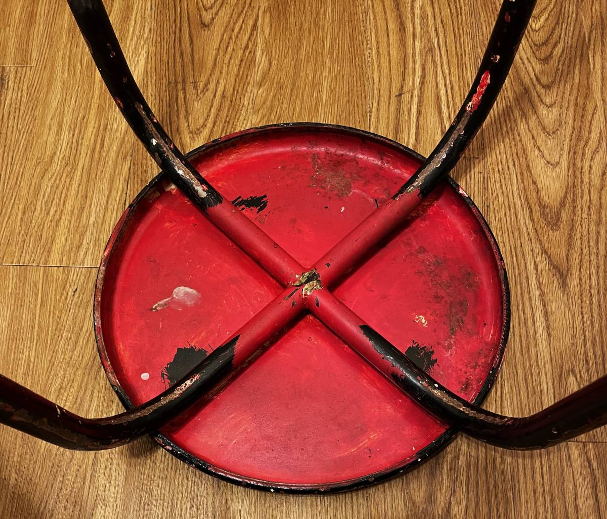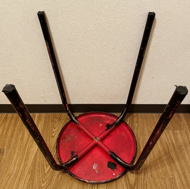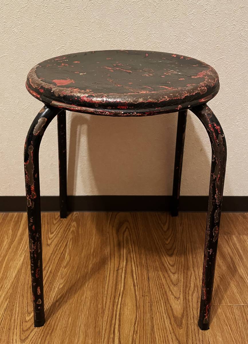 雰囲気◎黒塗り赤アンティーク丸椅子スツール鉄アイアン製シャビー錆味インダストリアル古美ブロカント店舗ディスプレイ演出ビンテージ什器