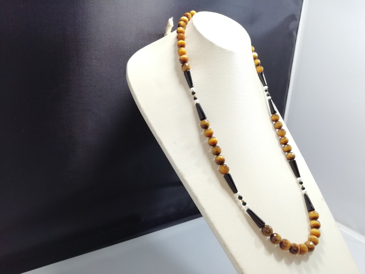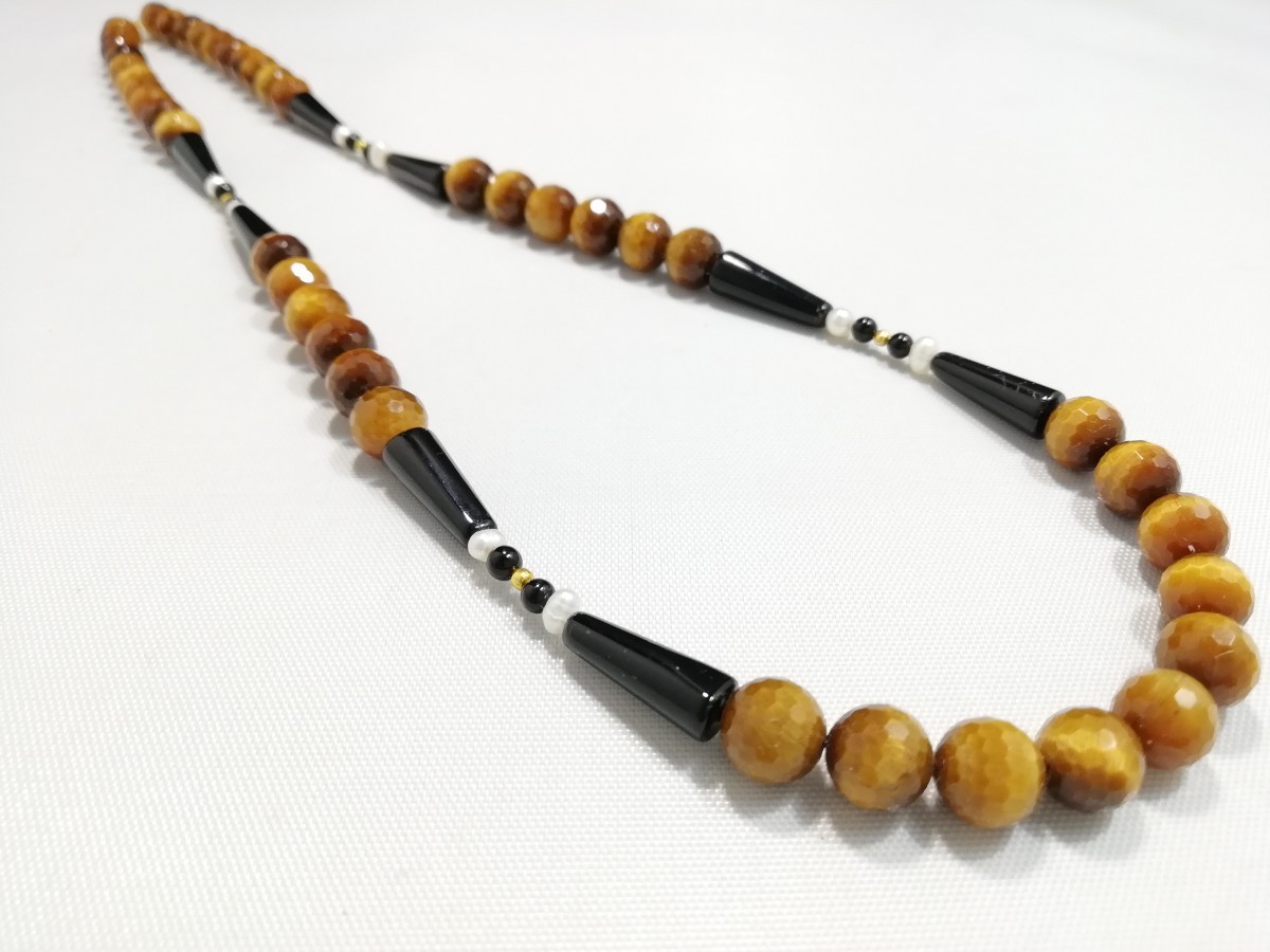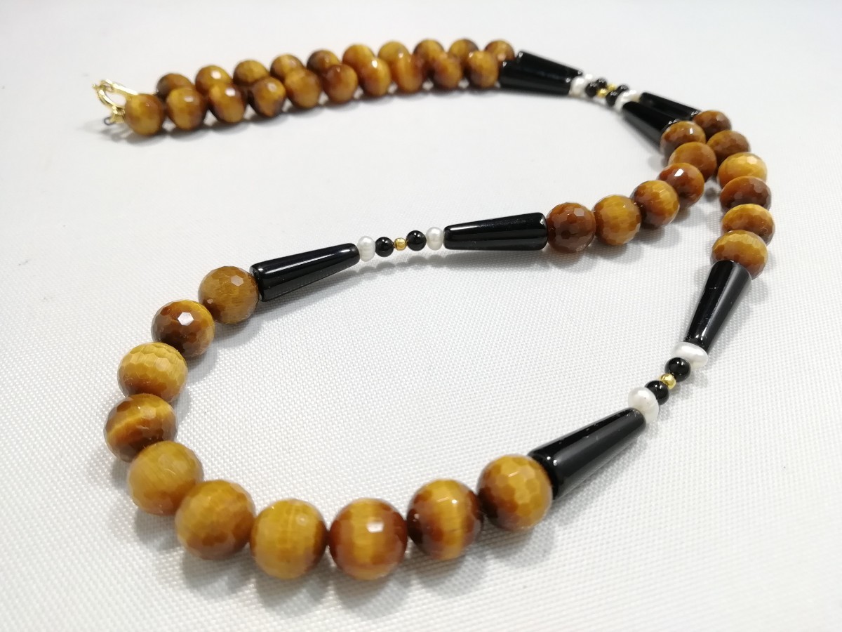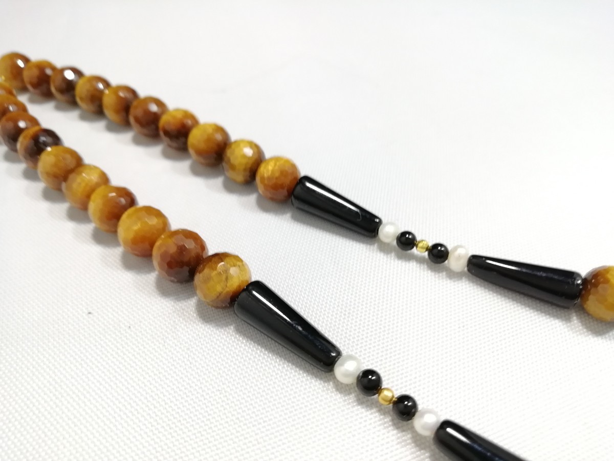 南アフリカ原産天然ハイグレードタイガアイ&オニキス&淡水パールディザインロングネックレス