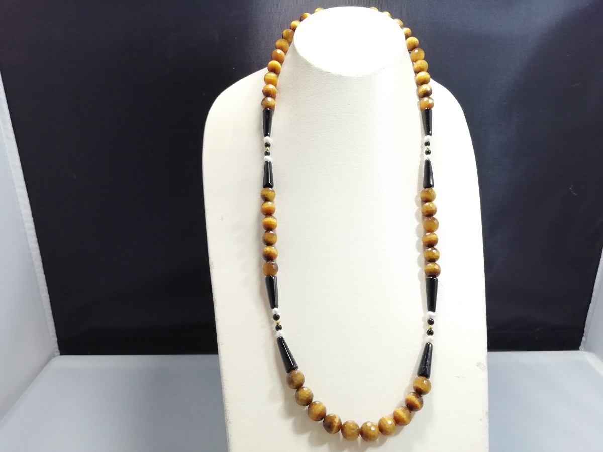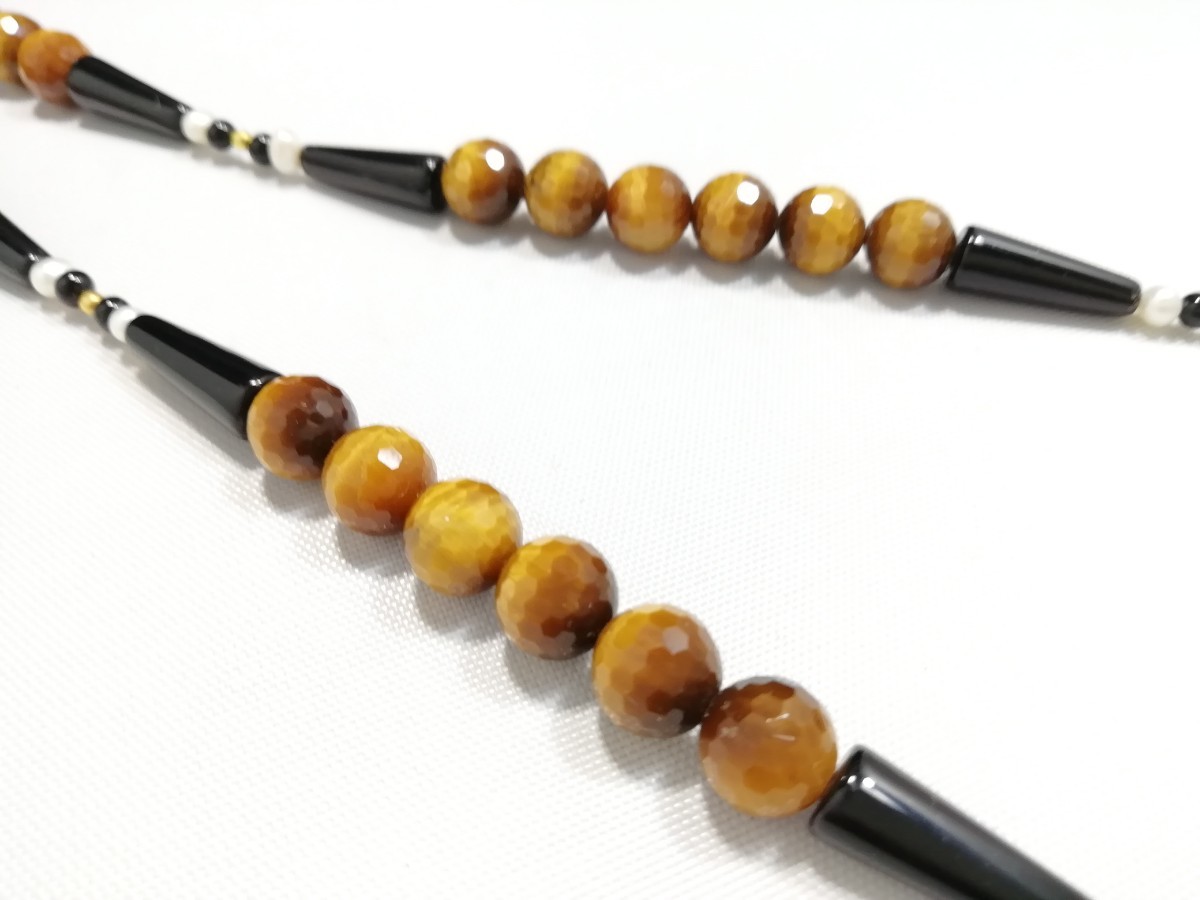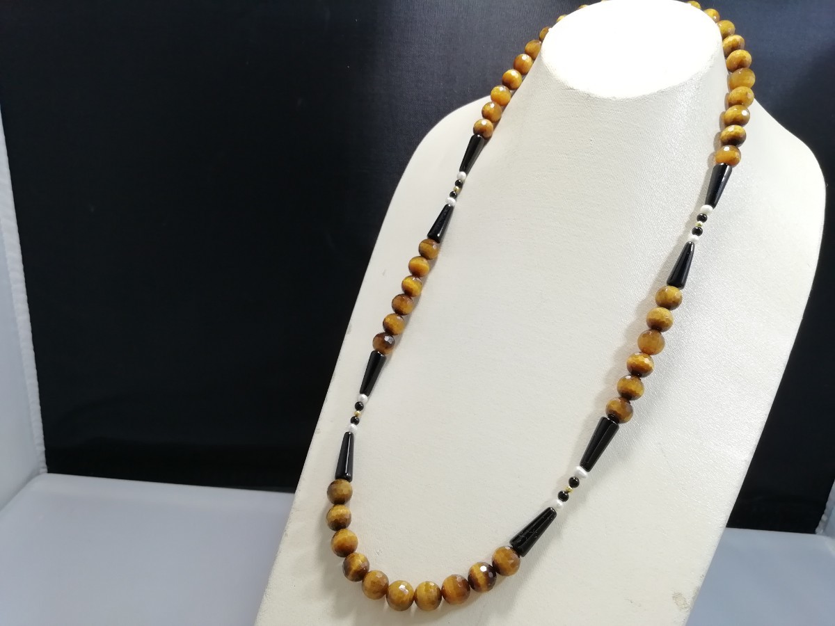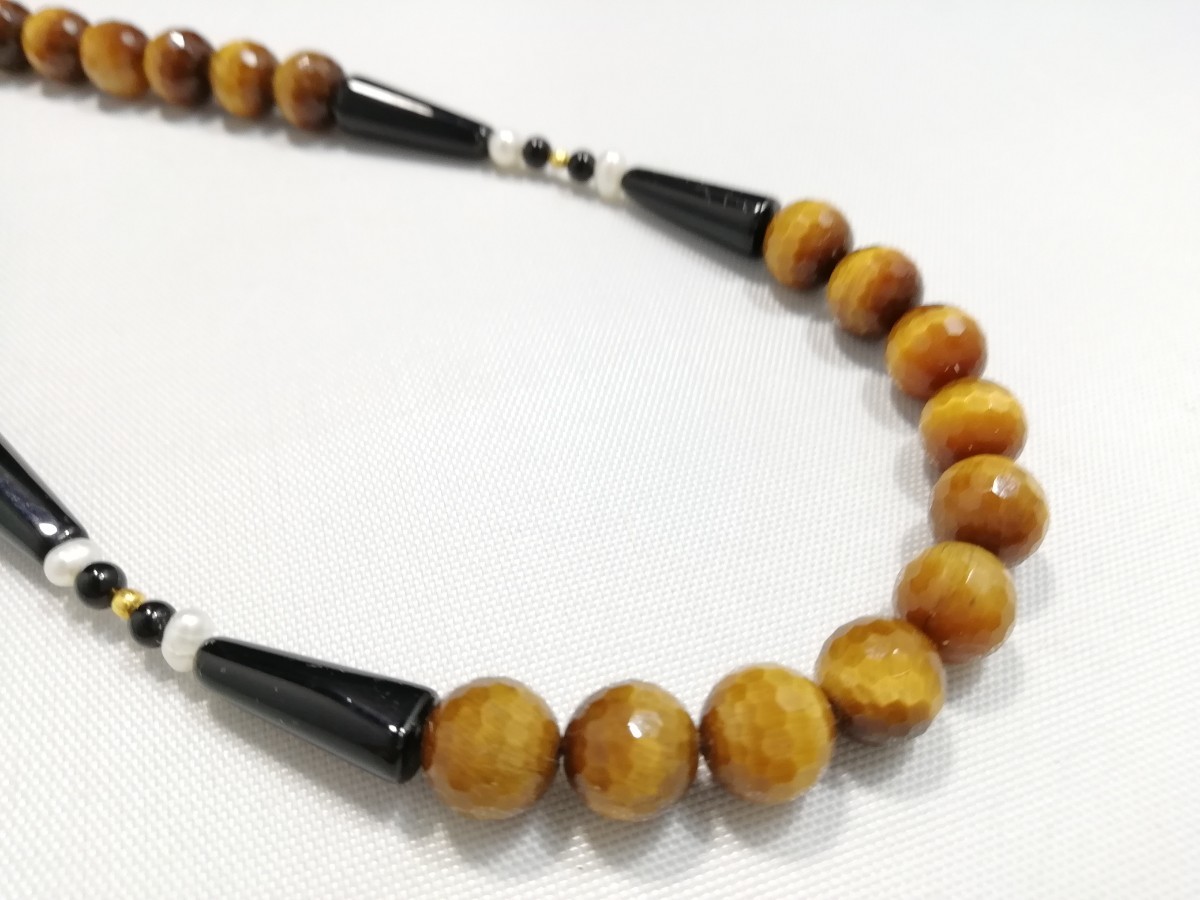 南アフリカ原産天然ハイグレードタイガアイ&オニキス&淡水パールディザインロングネックレス