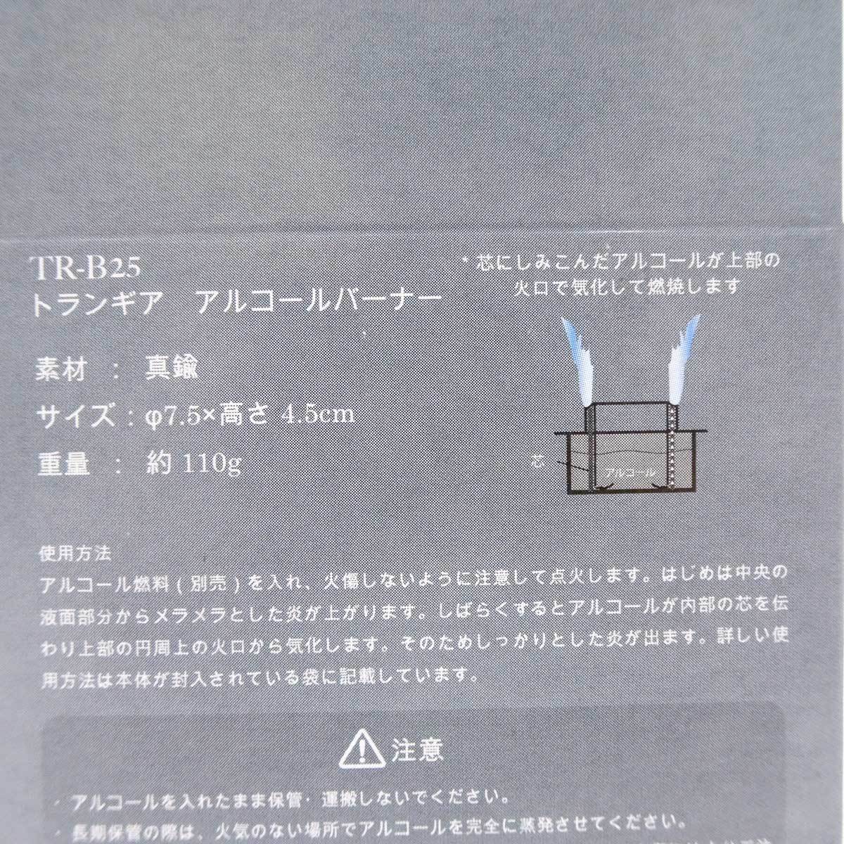 ※商品は画像にあるものがすべてとなります。 【仕様】 ブランド:トランギア タイプ:アルコールバーナー スピリットバーナー [ウィンドシールドゴトク(TR-281)付] 型番:TR-B25 重量:110g 収納時サイズ:径7.5×高さ4.5cm 材質:真鍮 |