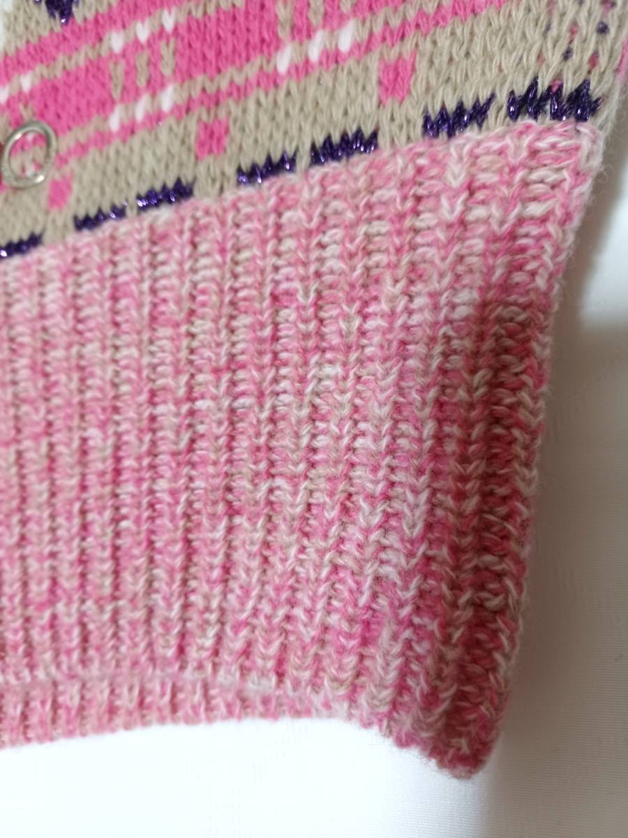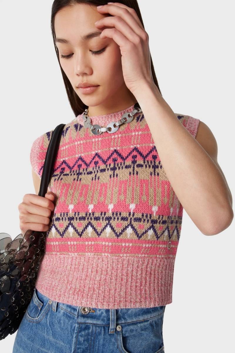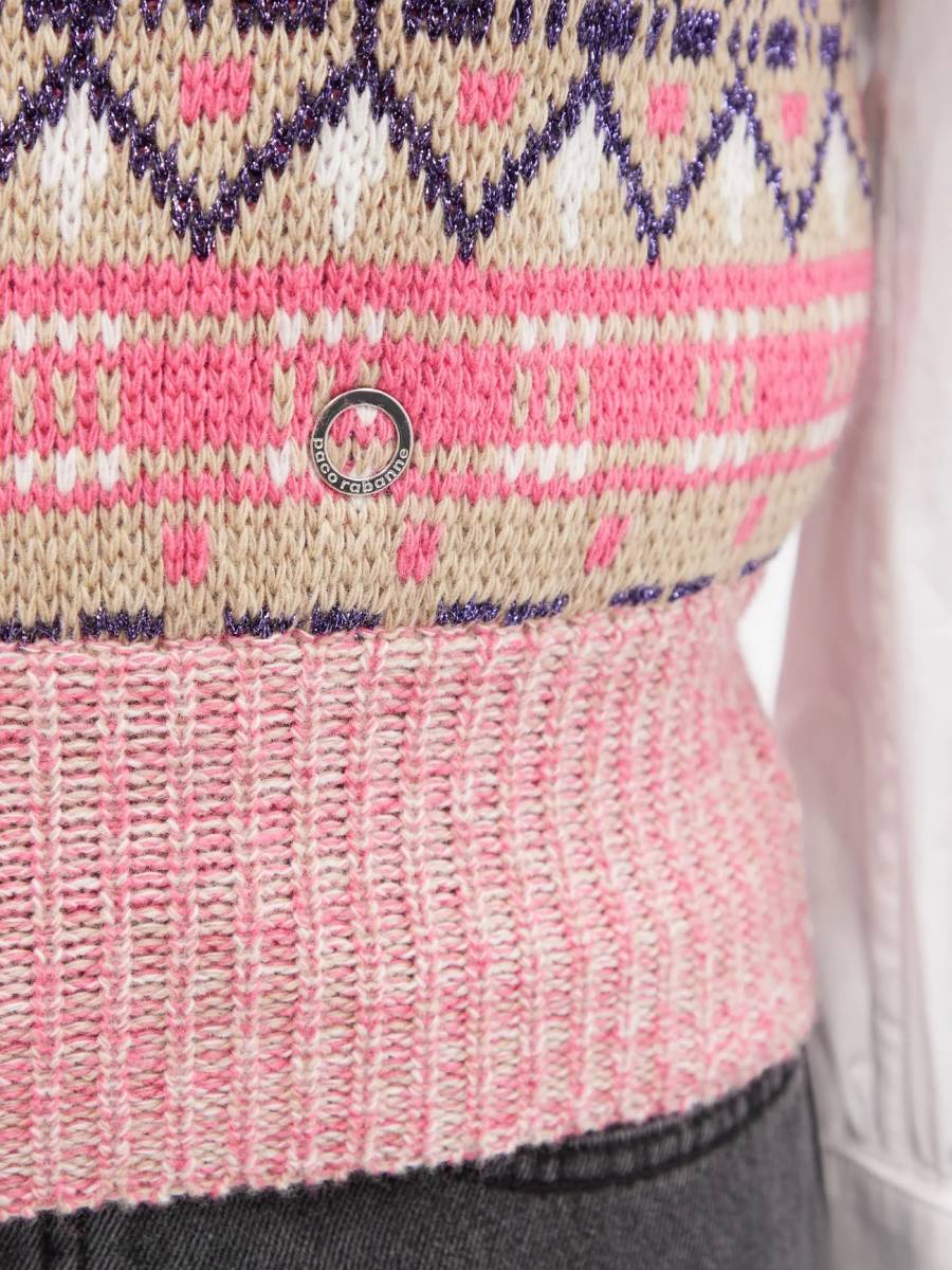 ジオメトリックなフェアアイルモチーフをあしらったデザイン。ショルダーは適度なフィット、バストとウエストはボディに沿ったフィット。
