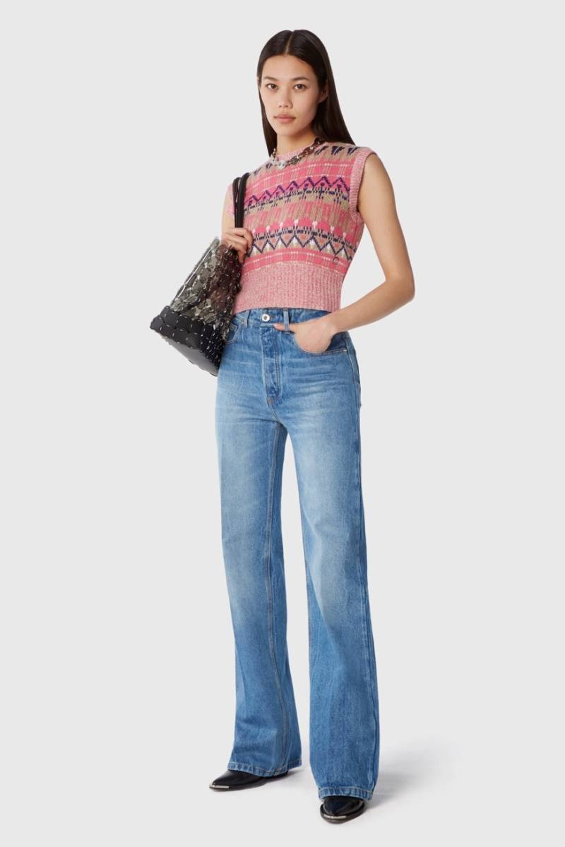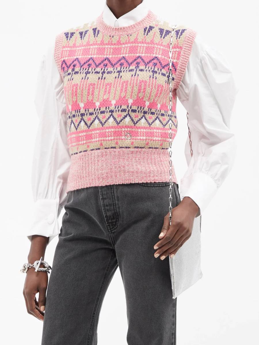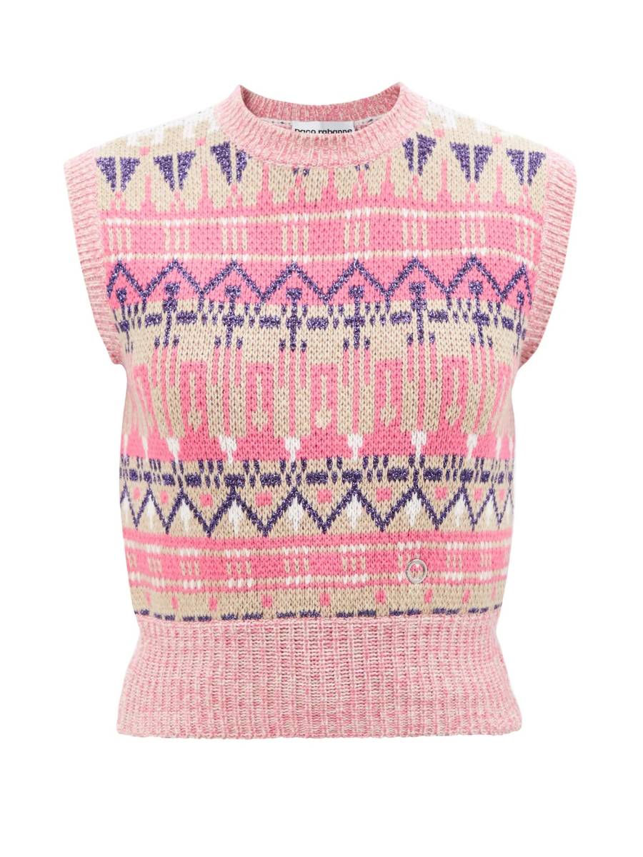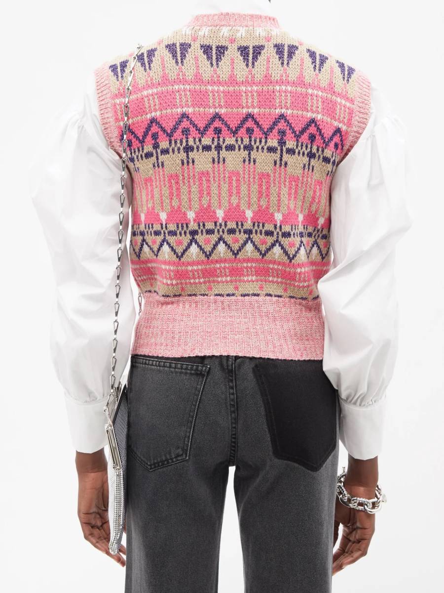 ジオメトリックなフェアアイルモチーフをあしらったデザイン。ショルダーは適度なフィット、バストとウエストはボディに沿ったフィット。