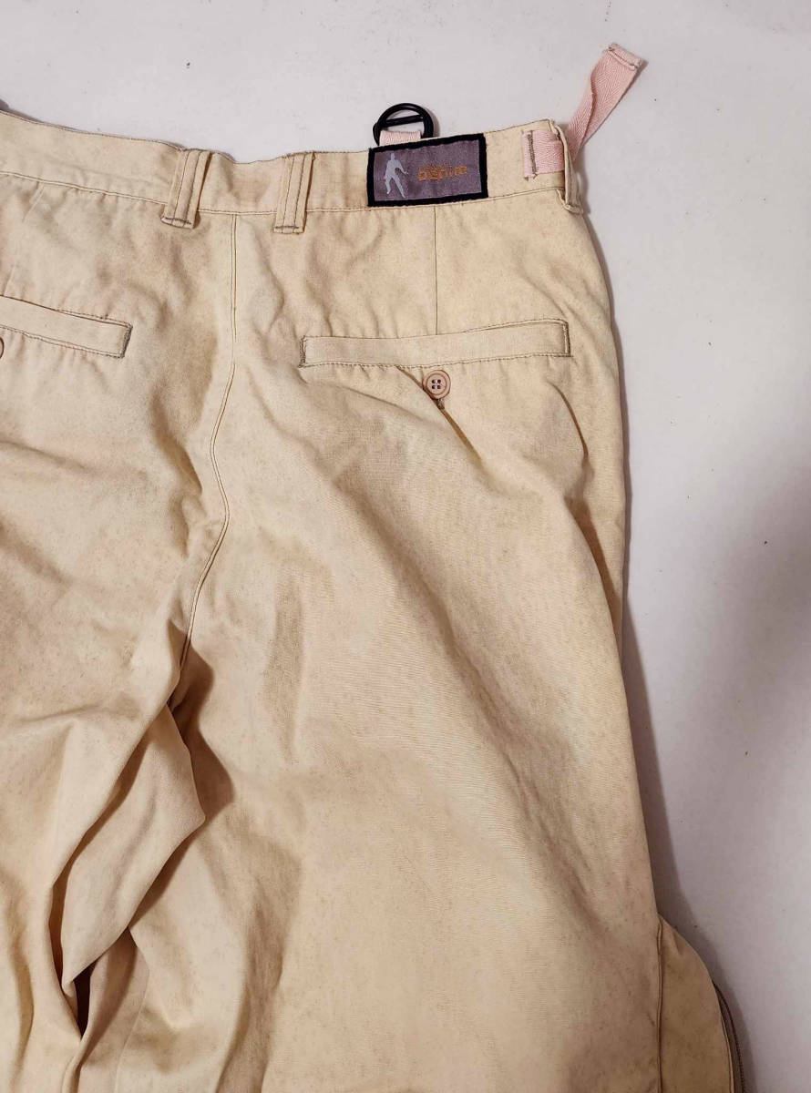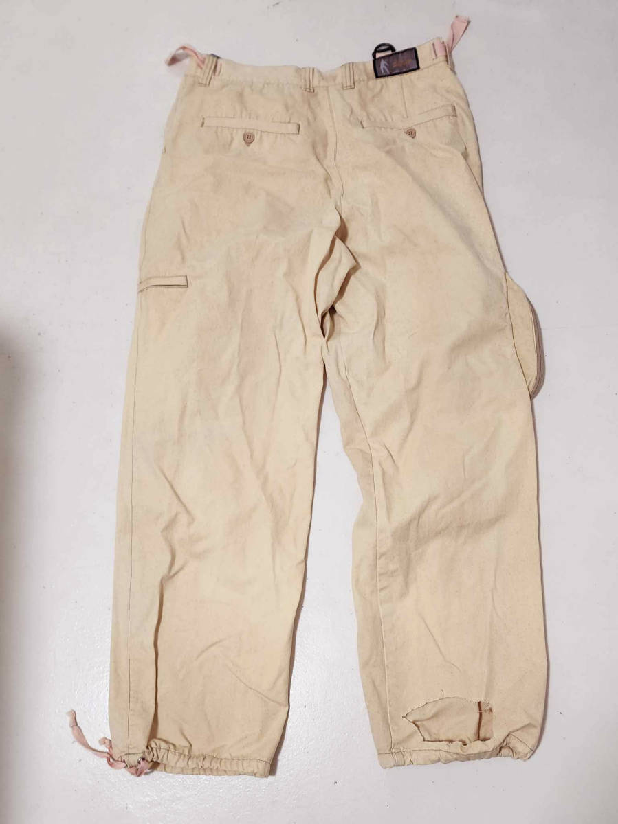 ウエスト34インチ 丈102 cm 股上26 渡り34cm 素材ピーチスキン ベルトのピンク色と生地のオレンジがかったベージュが綺麗です。右後ろ裾に破れありますが、紐で縛るタイプなので、履いて絞れば問題ありません。その他は綺麗です。