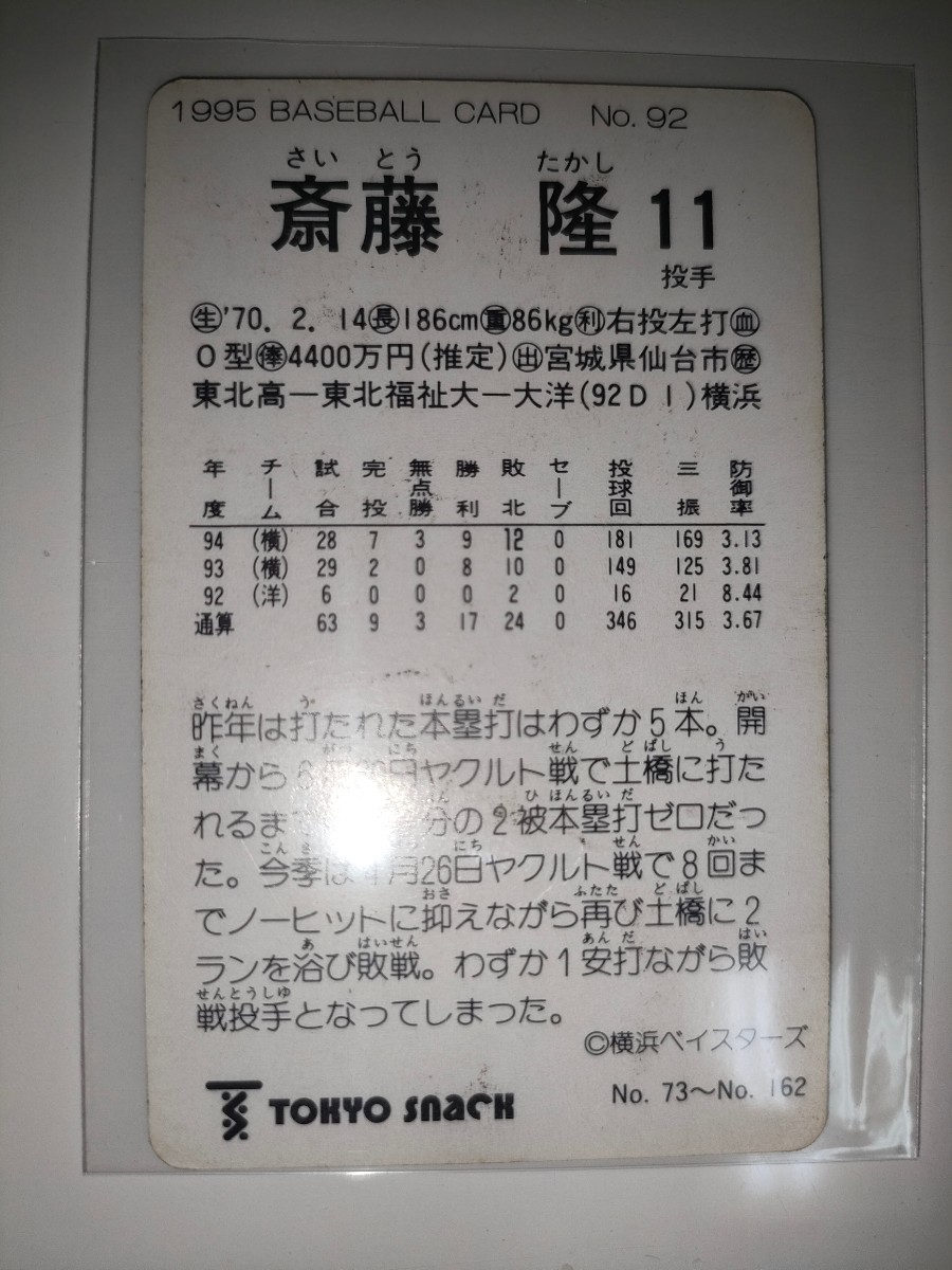 斎藤隆 95 カルビープロ野球チップス レアブロック No.92 横浜ベイスターズ