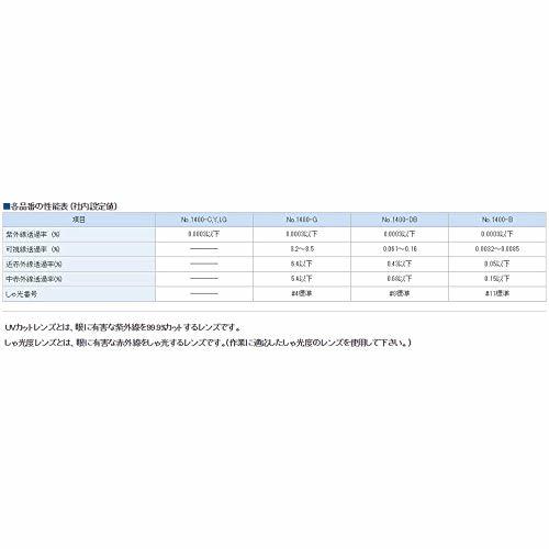 本体・ブラック NO.1400-B・・Color:ブラックStyle:本体PatternName:単品・電気溶接用・遮光度:11・種類: 単品・パッケージ重量: 0.26 pounds説明 ●ヘルメットや帽子のヒサシに差し込むだけの簡単装着。視界が広いアール形。レンズは歪みのないポリカーボネート樹脂製。特殊ハードコーティング加工で傷がつきにくい。眼鏡をあいたままでもOK。装着したままレンズの上げ下げができます。用途:電気溶接用レンズ色:ブラック遮光度:#11標準重量:85gUVカット、紫外線・カット●パッケージサイズ/縦:165mm横:180mm高さ:35mm