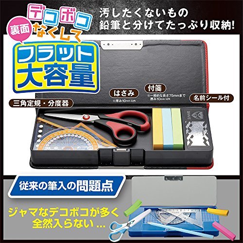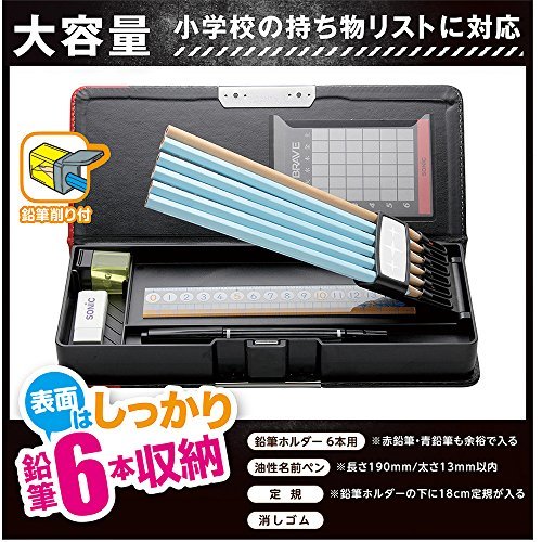 ・ブラック SK-5023-D・・Color:ブラック・こだわりと工夫を重ねた、丈夫で大容量の筆箱です。両面に文房具を分けて入れられます。・裏面のデコボコをなくしたフラット設計で、はさみや三角定規もらくらく収納できます。・【サイズ】W98xH244xD36mm・【カラー】ブラック 【主要材質】本体=ABS、PE、PU 【製造国】日本・鉛筆削りつき商品紹介 【たっぷり入る両面開きの筆入れ】 両開きでたくさん入る、丈夫な素材の筆箱です。 鉛筆の粉で汚したくないものを、鉛筆と分けて裏面に分けて収納できます。 一般的な両面筆入れは裏面にムダなデコボコがあり、あまり容量がありませんでした。 ソニックの両面筆入れは、裏面のデコボコをなくしたフラット設計で、サイズはそのままに大容量を実現しました。 裏面に三角定規(重ねて厚さ10mm以内)、はさみやふせんもラクラク入れることができます。 表面には鉛筆ホルダー(6本収納)がついています。消しゴム、油性名前ペン、直定規なども収納可能。小学校の標準的な筆入の持ち物リストに対応しています。 表側には取り外し可能な鉛筆削り、裏側にはなまえシールがついています。 外側はポリウレタン製の合皮製。縫製仕上げで、頑丈で長持ちします。 不規則エンボス加工を施したPU製合皮は、キズが目立ちにくく、弾性、靭性、耐摩耗性に優れています。 ソニックの「こだわり筆入」は、素材とデザインにとことんこだわった、小学生が使いやすい丈夫な筆箱。 高品質の日本製です。 カラー・デザインの種類も豊富。お子様のお好みに合わせてお選びください。 商品名:ソニック ペンケース 両面筆入 フラット ブレイブ カーボン調 ブラック SK-5023-D 本商品内部の底部分の線はヒビ割れではなく、製造上の樹脂の模様です。通常使用で割れる事はございません。