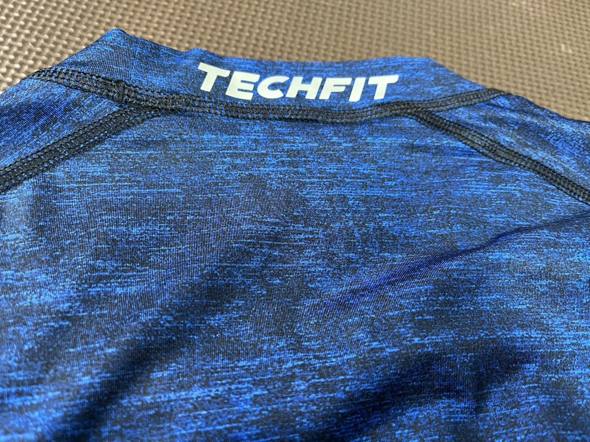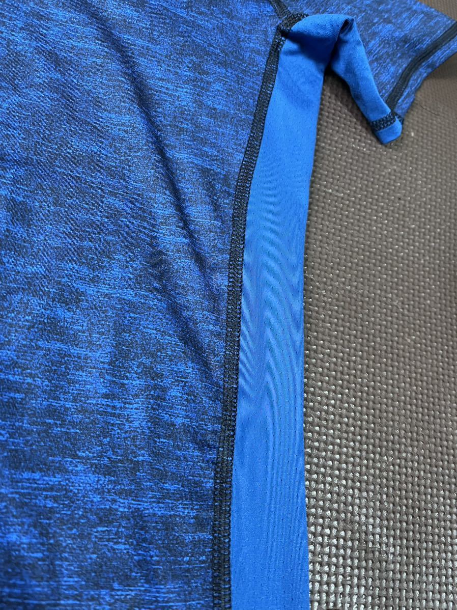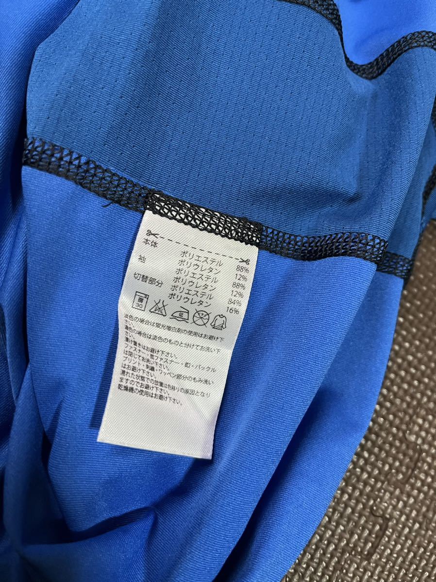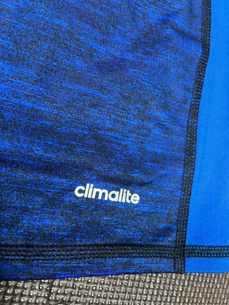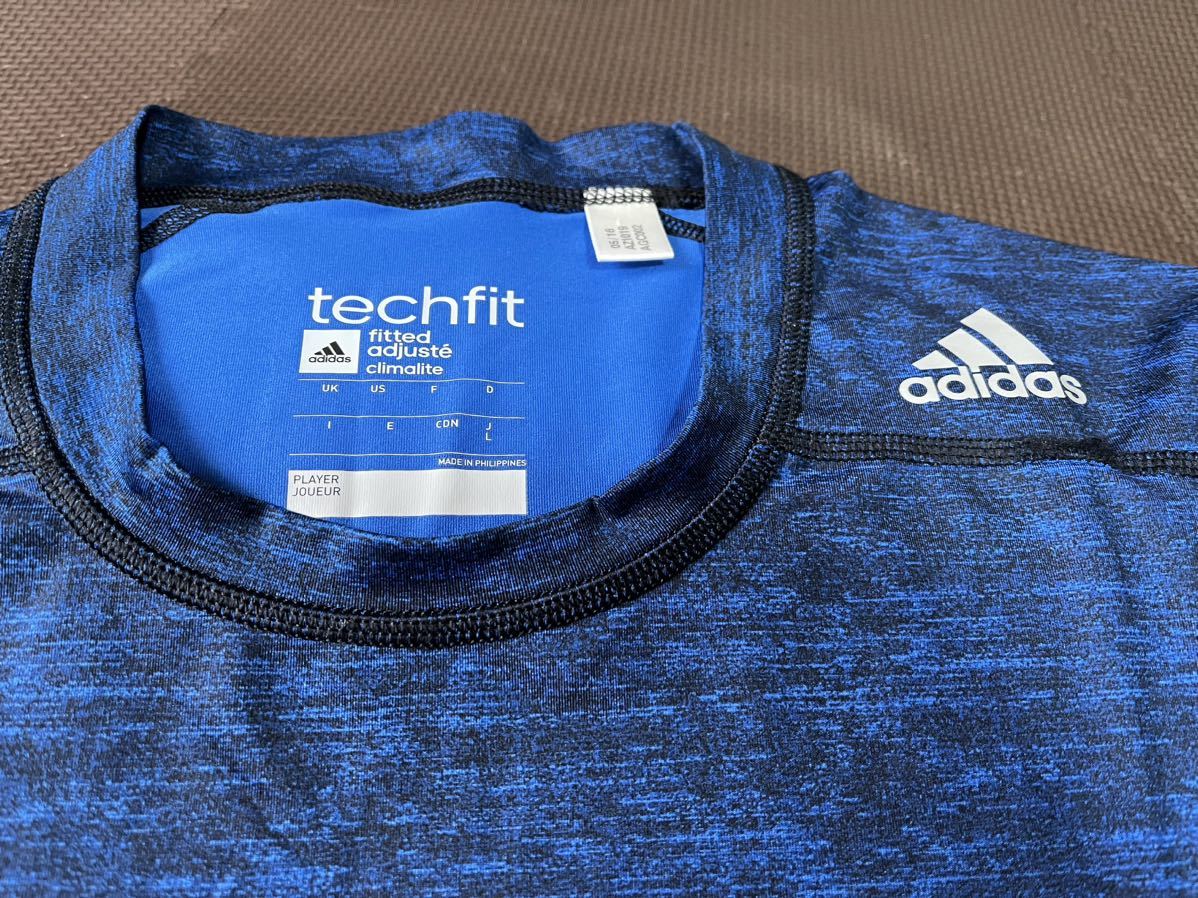 美品adidas青、黒柄入り、ロゴシルバー半袖ストレッチトップス