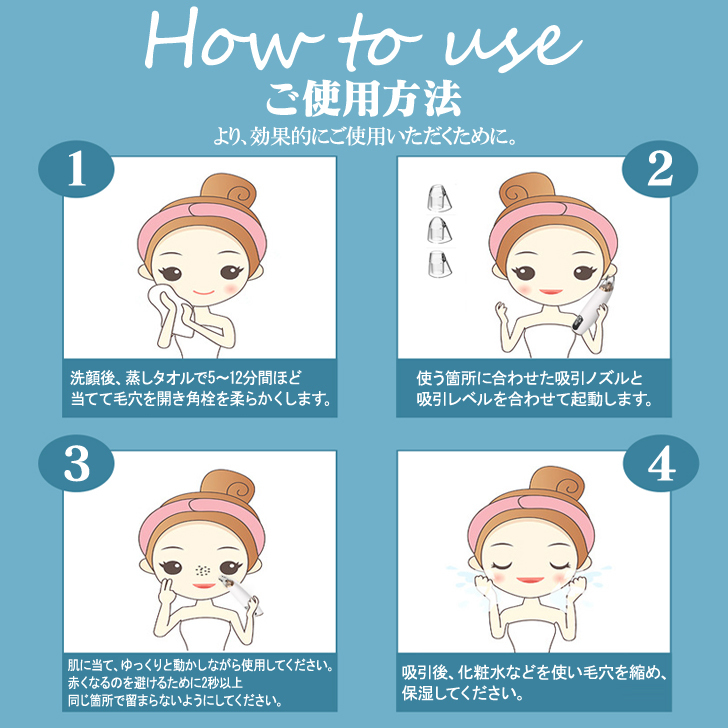 吸引力の強弱を3段階調節、角栓・黒ずみ・ニキビを集中的にしっかり吸引できます。