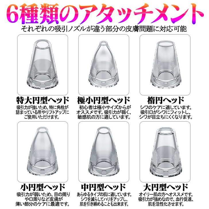 充実の6種類!様々なタイプの吸引ノズルが、いろいろなお肌の問題に対応します。