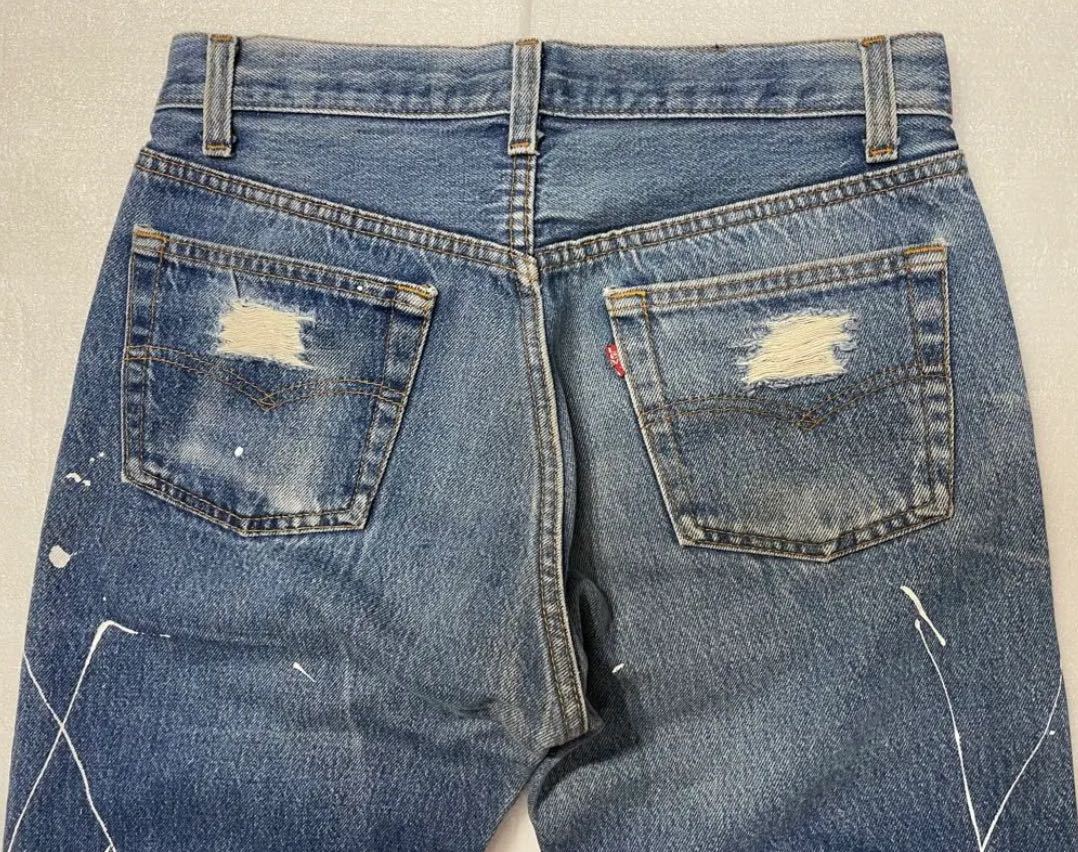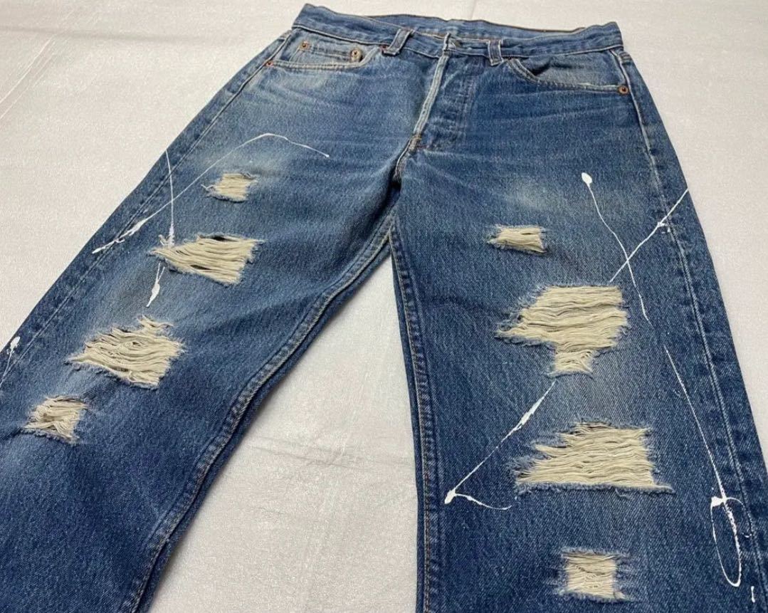経年変化による風合いと横糸を残したクラッシュ加工、さらにランダムに飛び散ったペンキが絶妙に雰囲気を醸し出しています。