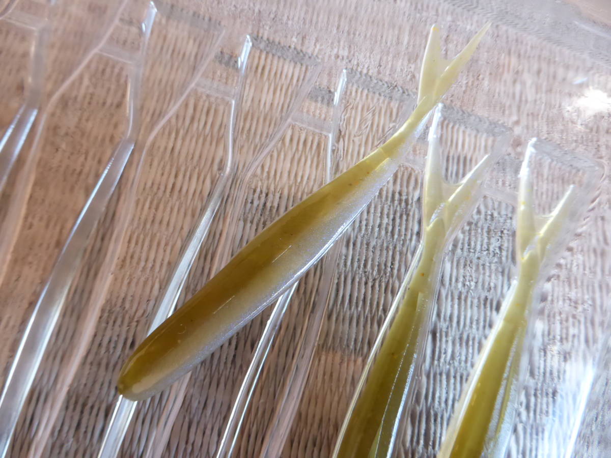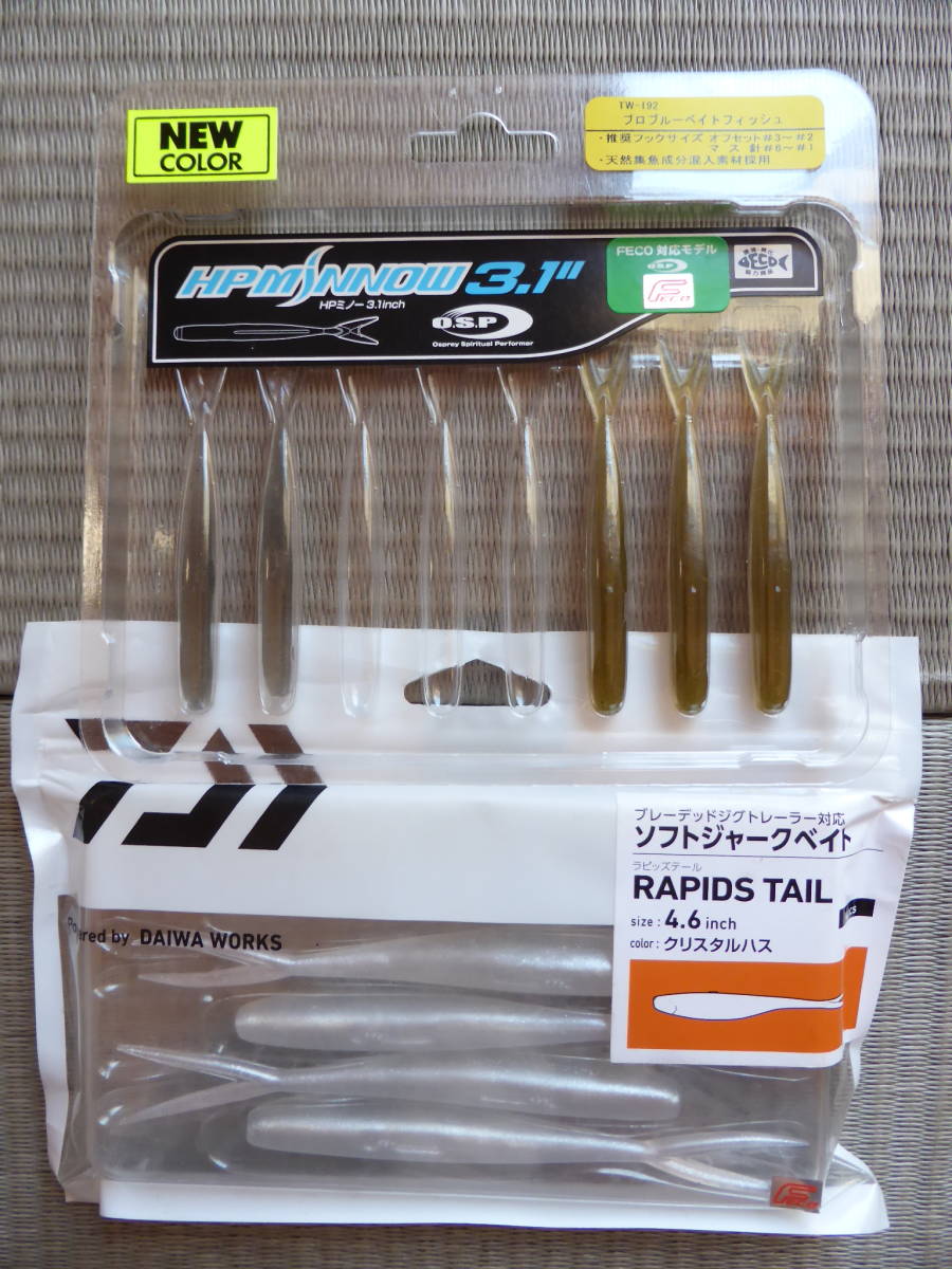 ●OSP_HPミノー3.1 HP MiNNOW3.1はリグへの幅広い適応性と、あたかも本物のベイトフィッシュかのごとくアクションするスーパーマルチミノーワームである。 フィーディングのバスのみならず、ニュートラルなバスに捕食スイッチを入れバイトさせるために必要なことはルアーを本物のベイトだと思わせること。 ボディー形状を追求し、動かしたい部分だけが艶かしく動き、動かしたくない部分が不自然に動くことを徹底排除。 ノーシンカーリグによるi字アクションでは不自然なふらつきを抑え、またサスペンドしているバスにも視界にルアーをとどめられるようマテリアルを吟味しスーパースローシンキングに設定。 ボディをくねらせながらのキレのあるダートアクションや細かなシェイクにも追従して動くVテール、ただ巻きでは後方ボディを波打つよう震わせながら泳ぐさまは、まさにリアルアクション。 バスがルアーを見切る要素を削ぎ落したHP MiNNOWはミノーワームの次世代スタンダードとなる。 カラー:プロブルーベイトフィッシュ_3本 カラー:ソフトシェルスモーク_2本 長さ:3.1インチ_約79mm ○DAIWA_ソフトジャークベイト4.6 ラピッズテールは数あるソフトジャーキングベイトの中でも非常に固めの素材が使用されているワームとなっています。 ボディー自体が硬めの素材で作られているので、ジャーク時に発生する水押しが非常に強くなり、高いアピール力を出すことが出来る設計となっています。 高いアピール力を活かして広大なフィールドでテンポよくバスをキャッチすることに長けているワームなので、サーチベイトとしてもおすすめです。 ソフトジャークベイトとしても、チャターやスピナーベイトのトレーラーとしてもおすすめの一品です。 チャターのトレーラーとして開発されたソフトジャークベイト。 硬めのマテリアル設定で、強い水押しを発生しバスにアピール。 深めのスリットはトレーラーを真っ直ぐ刺しやすく、扱い易い。 ノーシンカーではソフトジャークベイトとして機能。逃げ惑う小魚を演出する。 2層構造マテリアル ボディ上部はノンソルトマテリアル。 ボディ下部には高比重ソルトインマテリアルを採用。 ノーシンカーで使用したときもバランスを崩しにくく、安定してアクションしてくれます。 カラー:クリスタルハス_4本 長さ:4.6インチ_約117mm ワームは全て未使用品です。 パッケージにはダメージございます。 ワームの特性上、確認はしておりますが、もし差し後がありましてもご容赦ください。 神経質な方は入札をご遠慮ください。 他にも多数出品しておりますので是非、ご覧ください。 同梱包で送料もお得です。 宜しくお願い致します。 | ||||