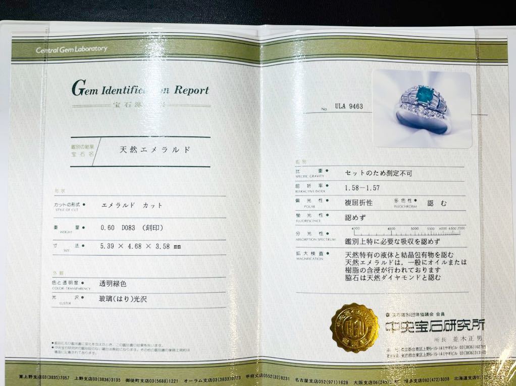 こちらは、Pt900台にエメラルドカット1石&テーパーダイヤ14石&ダイヤ14石付きリングです。