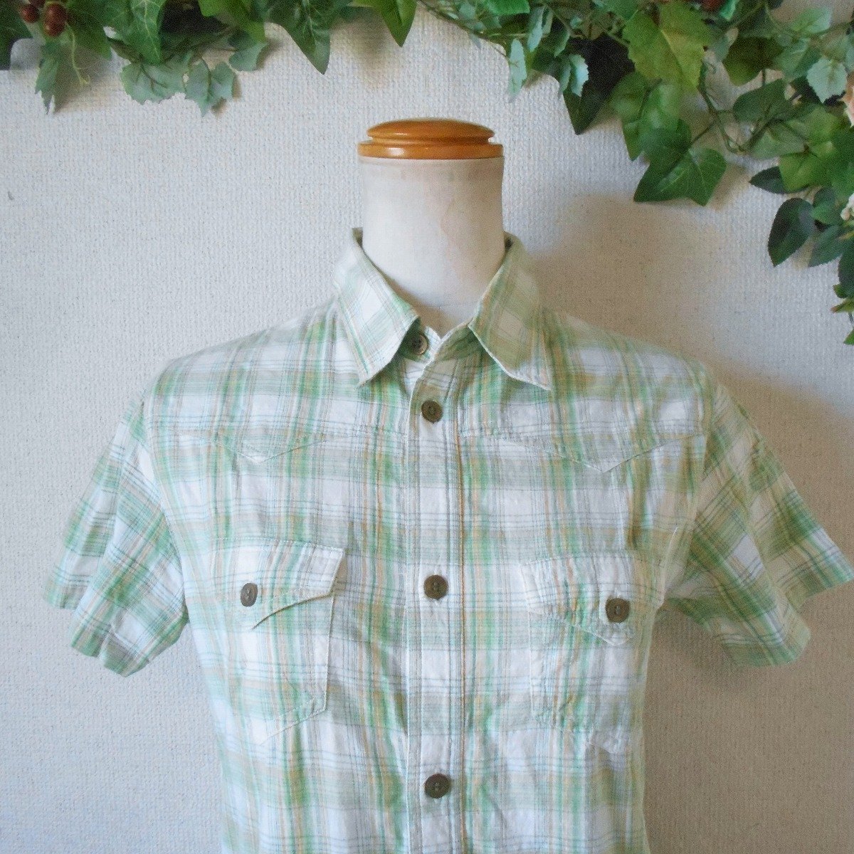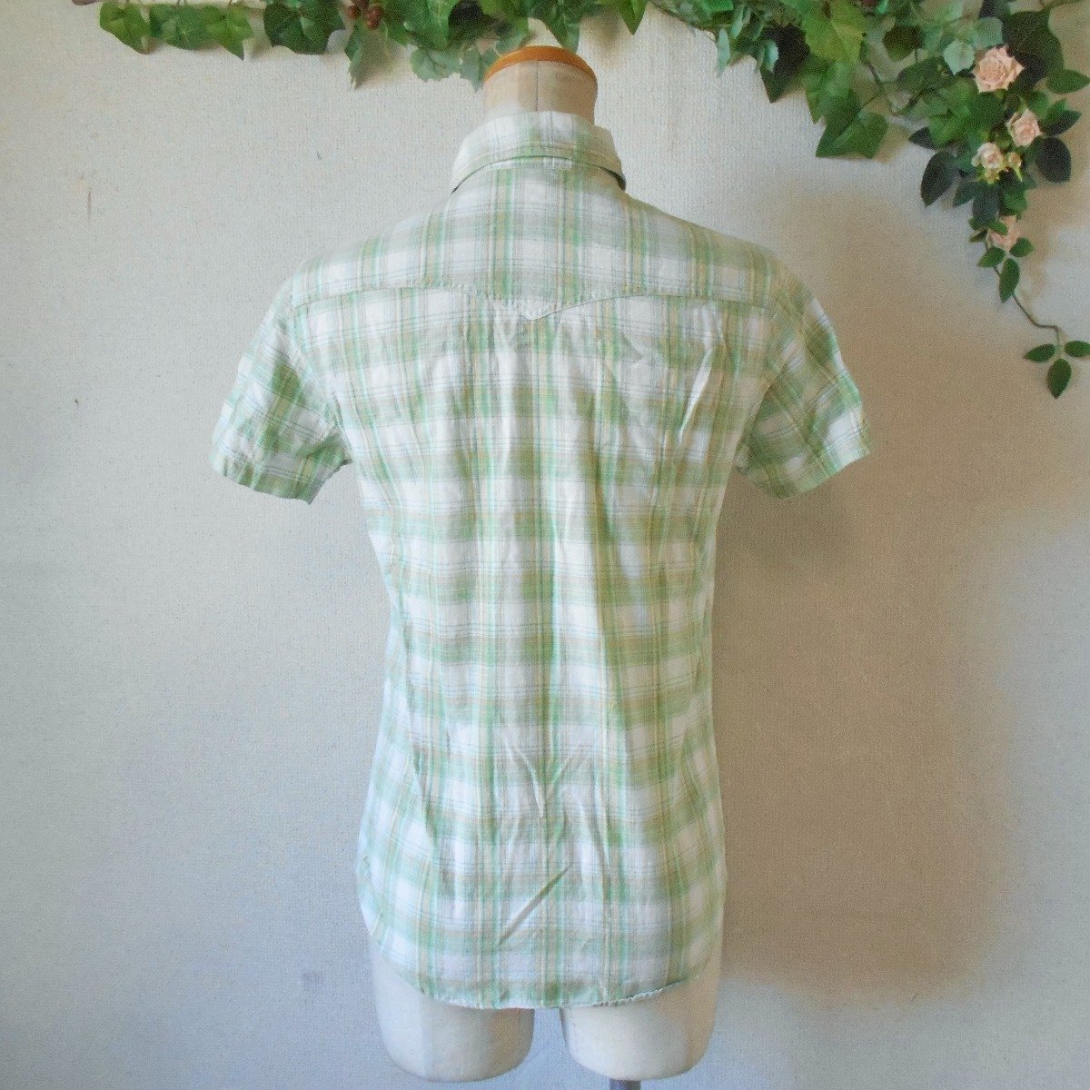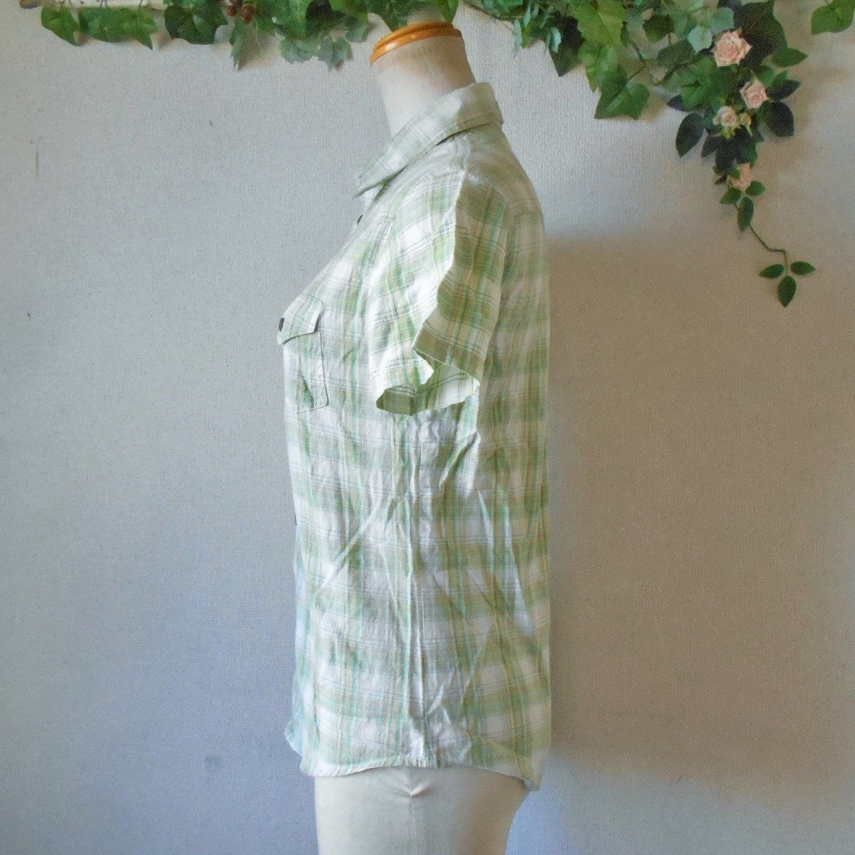 【ポイント】マウジーのレディース用半袖シャツになります。お色は薄いグリーン系のチェック柄で夏を中心に着ていただけるお品です。カジュアルな雰囲気で普段から使いやすい一着です。