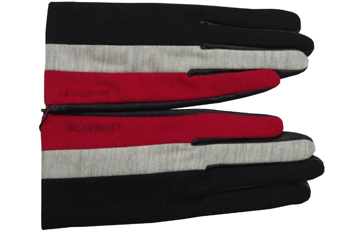 ■CK カルバンクライン CK CALVIN KLEINの女性用手袋、新品です。サイズは21cm(手囲い)、中指先端から手首部分までの全長は約22.5cm、Lサイズの感じです。ロゴマークの刺繍入り。素材は掌部羊革、甲部はウール100%。色は黒×ライトグレー×赤。正規ライセンス会社扱い品です。