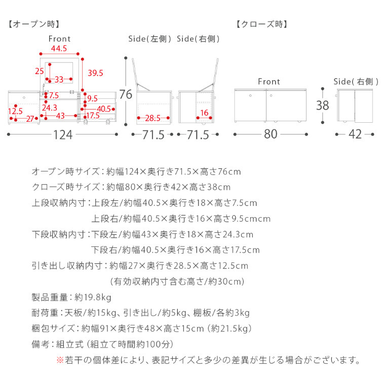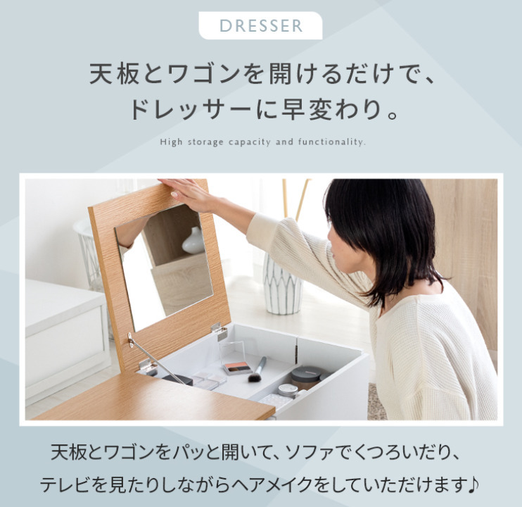 普段はコンパクトなテーブルに、天板とワゴンを開ければドレッサーに早変わりするドレッサーテーブル
