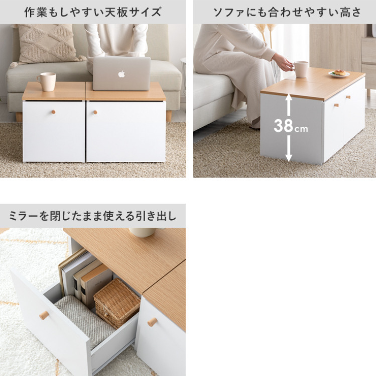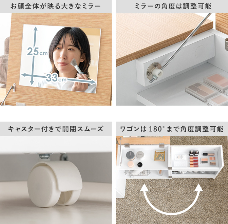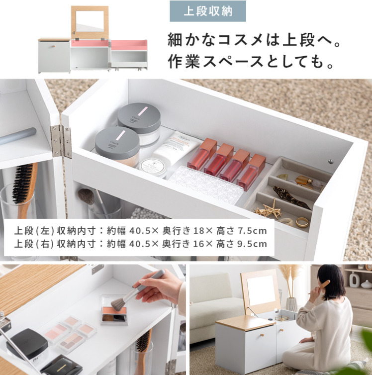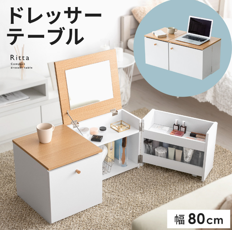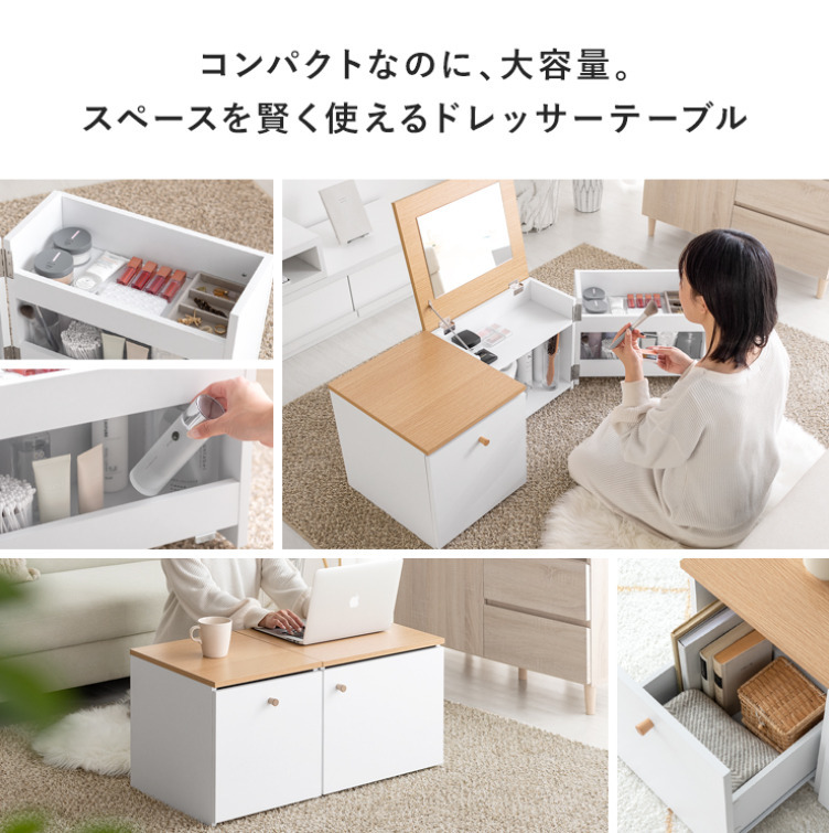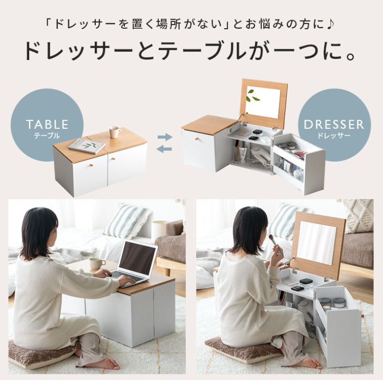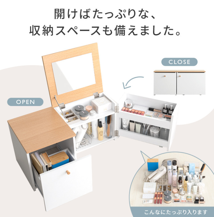 テーブル1つ分のスペースに置ける1台2役の省スペースデザインで、ワンルームにも理想のメイク空間をおつくりいただけます♪