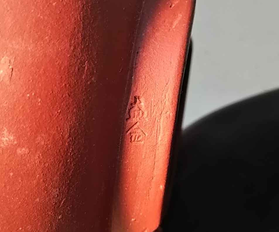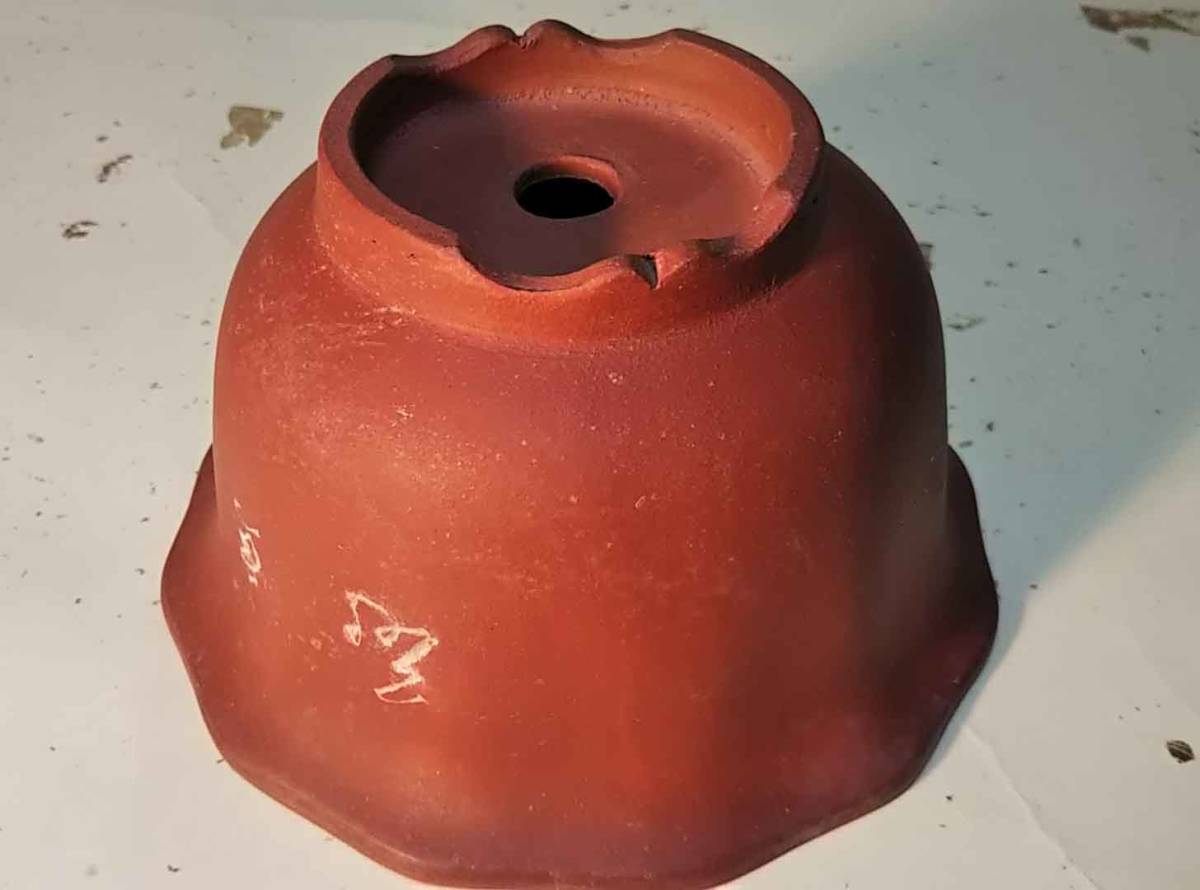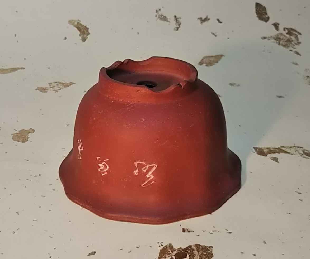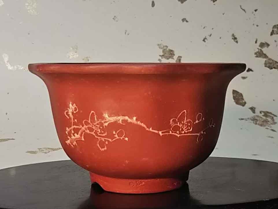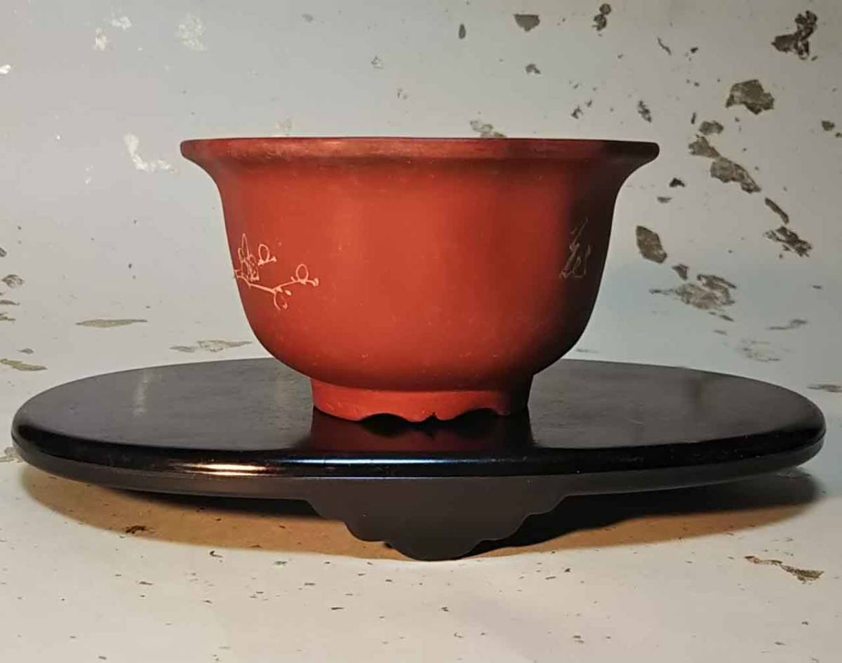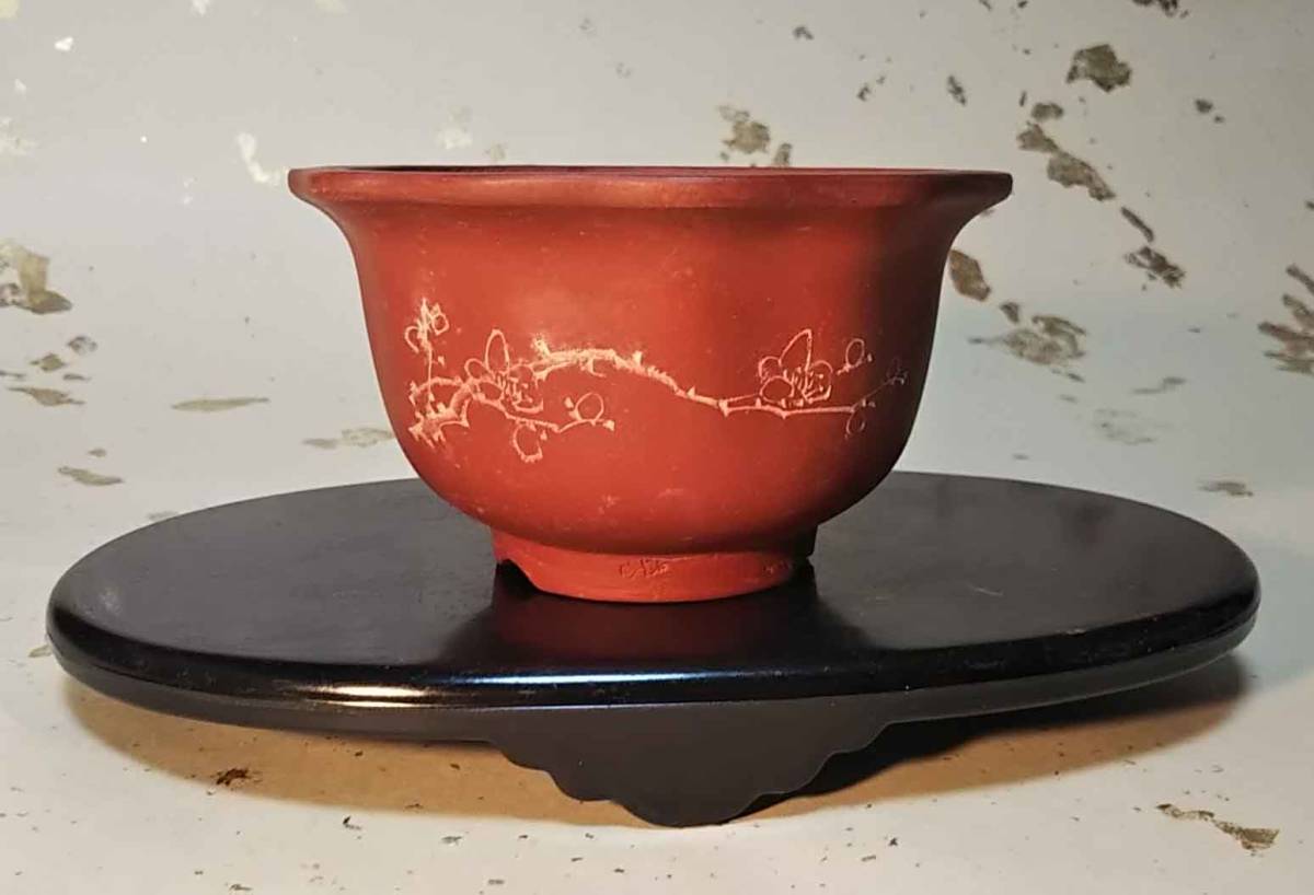 盆栽鉢  中国鉢「落款:盃金?」 1970年代入荷 ※ 朱泥輪花外苑釘彫段足鉢 ≒φ133mm x 高さ75mm(足含む)