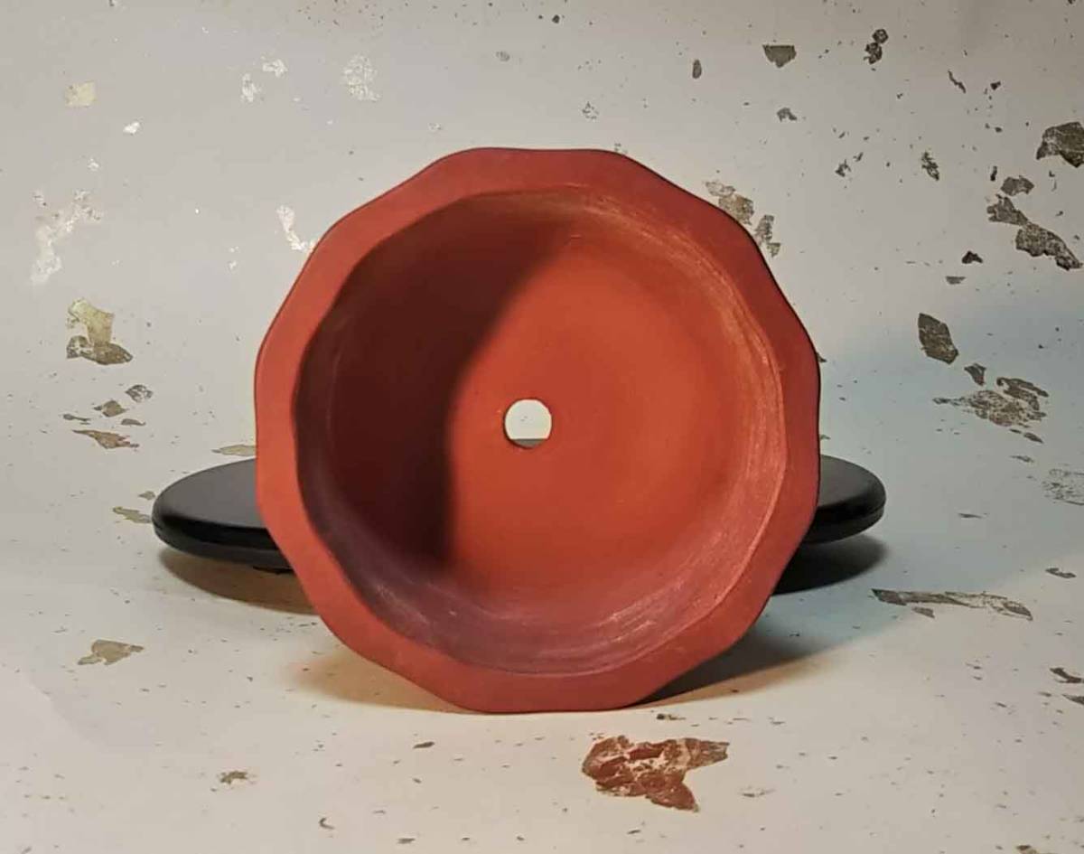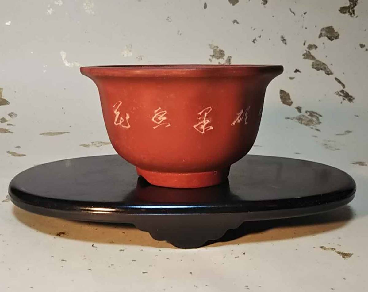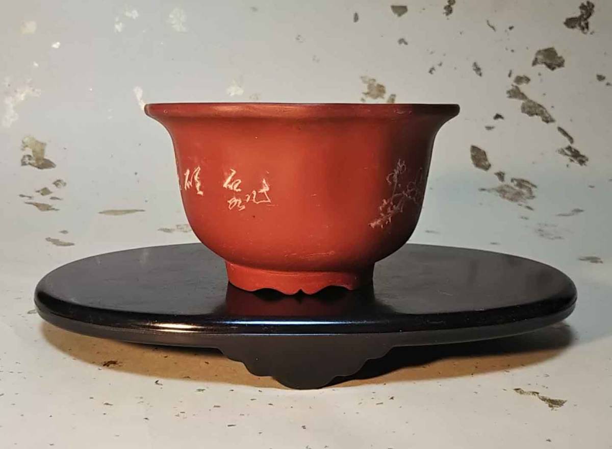盆栽鉢 中国鉢「落款:盃金?」 1970年代入荷 ※ 朱泥輪花外苑釘彫段足鉢 ≒φ133mm x 高さ75mm(足含む)