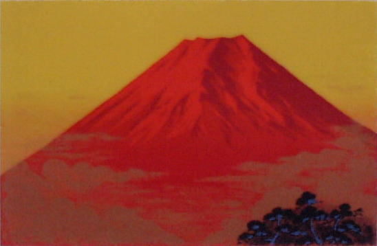 | ここがポイント! | 朝の光に赤く染まる赤富士は、出世飛躍の象徴とされています。山吹色の空と金色に輝く雲は、金運を招きくといわれています。 |