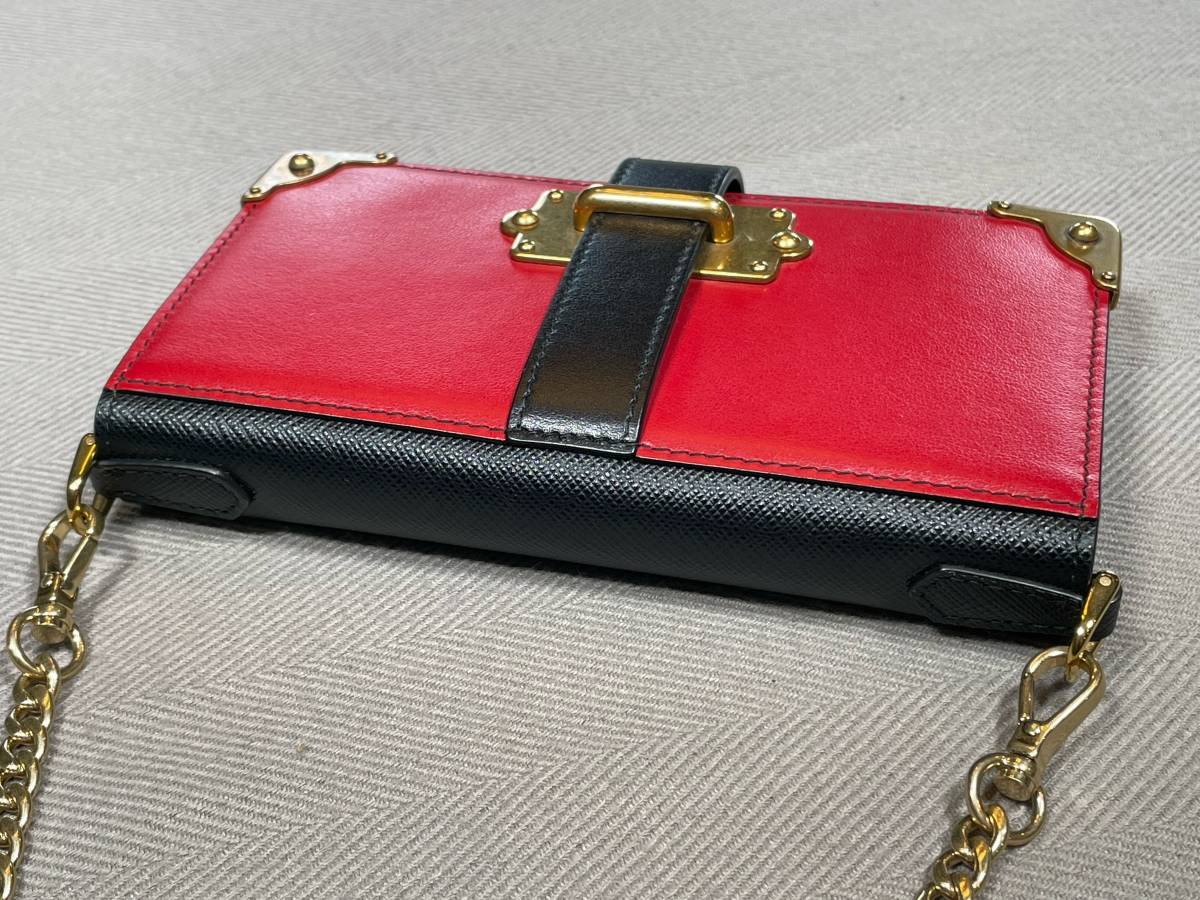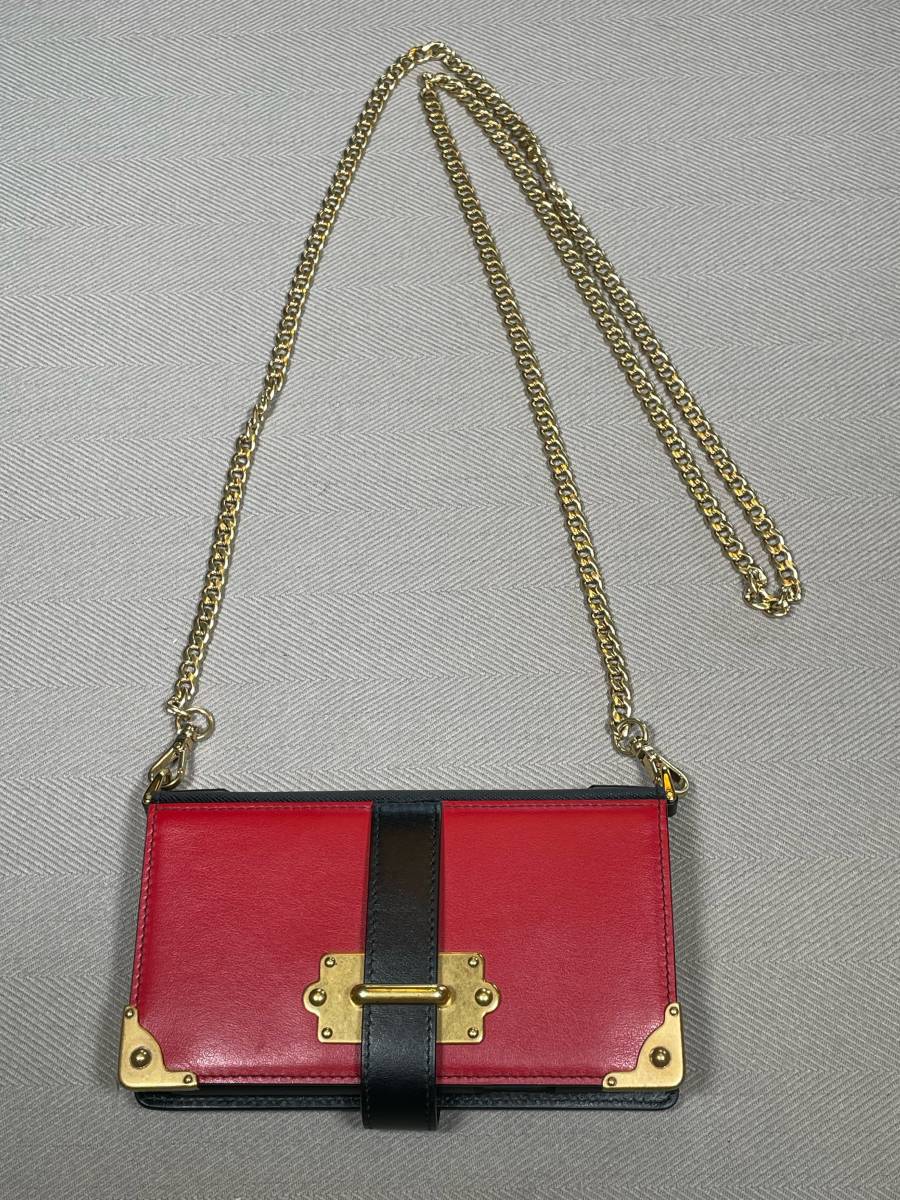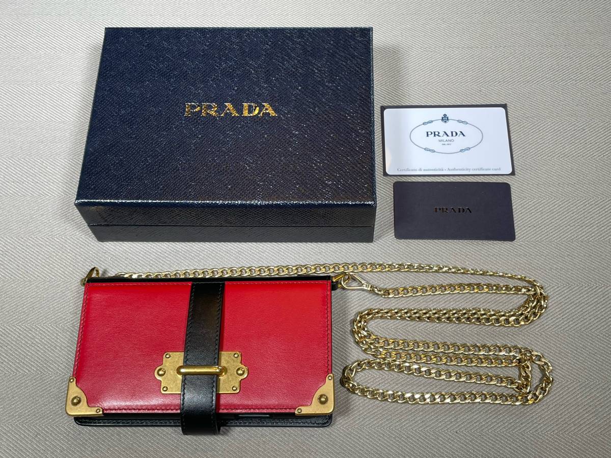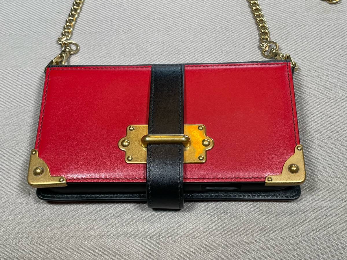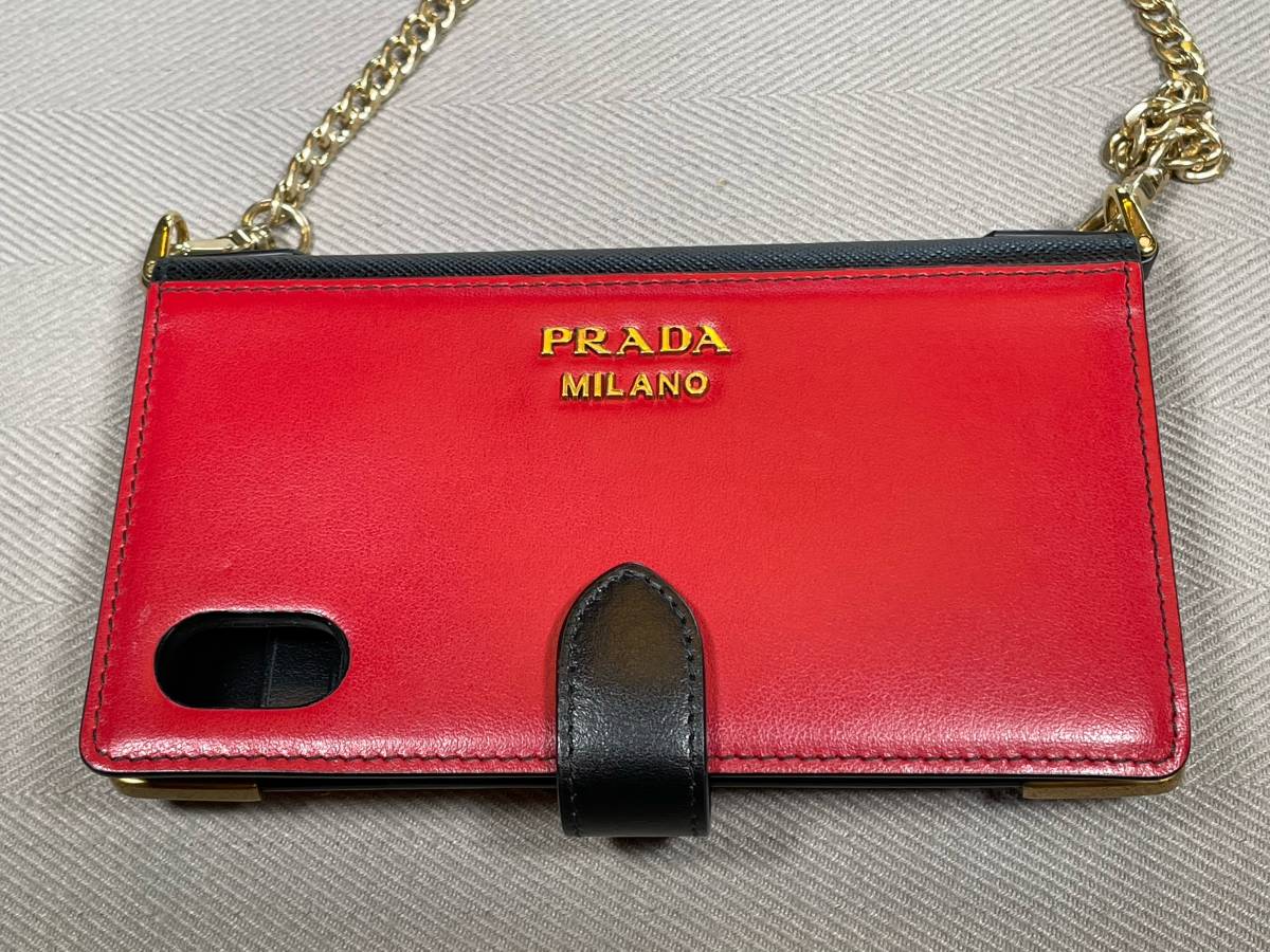 新品 未使用 PRADA iPhone X XS スマホ ケース iPhoneケース プラダ ロゴ ⑲B レッド 赤 チェーン付き カード入れ レザー 革