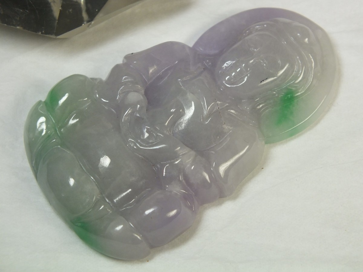 ★商品説明★ | サイズ:57×35×厚8mm 重さ:29g 淡紫色が綺麗なミャンマー翡翠。縁起柄の観音様が彫り込まれています。石コレクションやお守りに。上部に貫通穴が有るのでペンダントトップや下げ飾り等にもなります。(浸含処理石) |