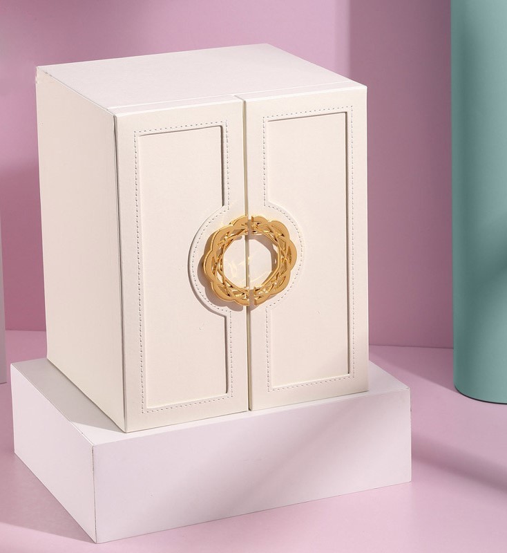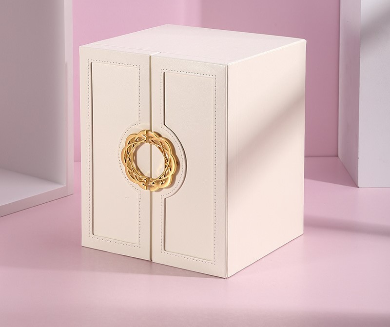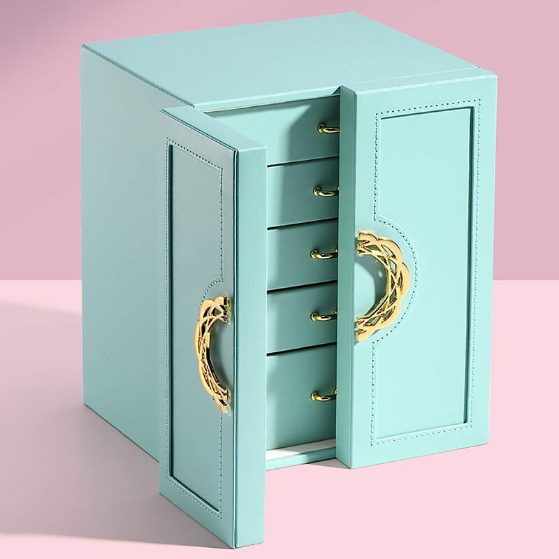 この両開きのジュエリーボックスは、多数の収納スペースと洗練されたデザインが特徴です。