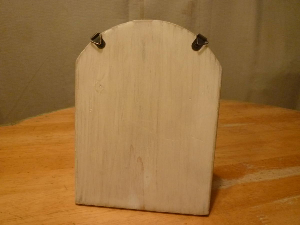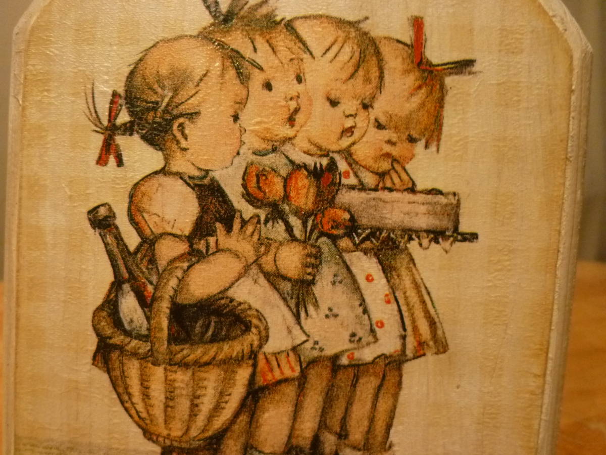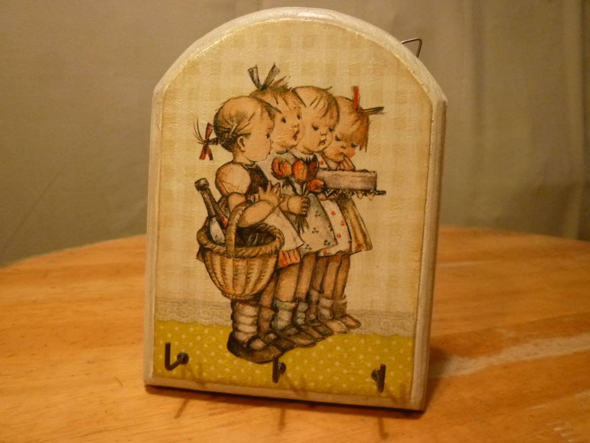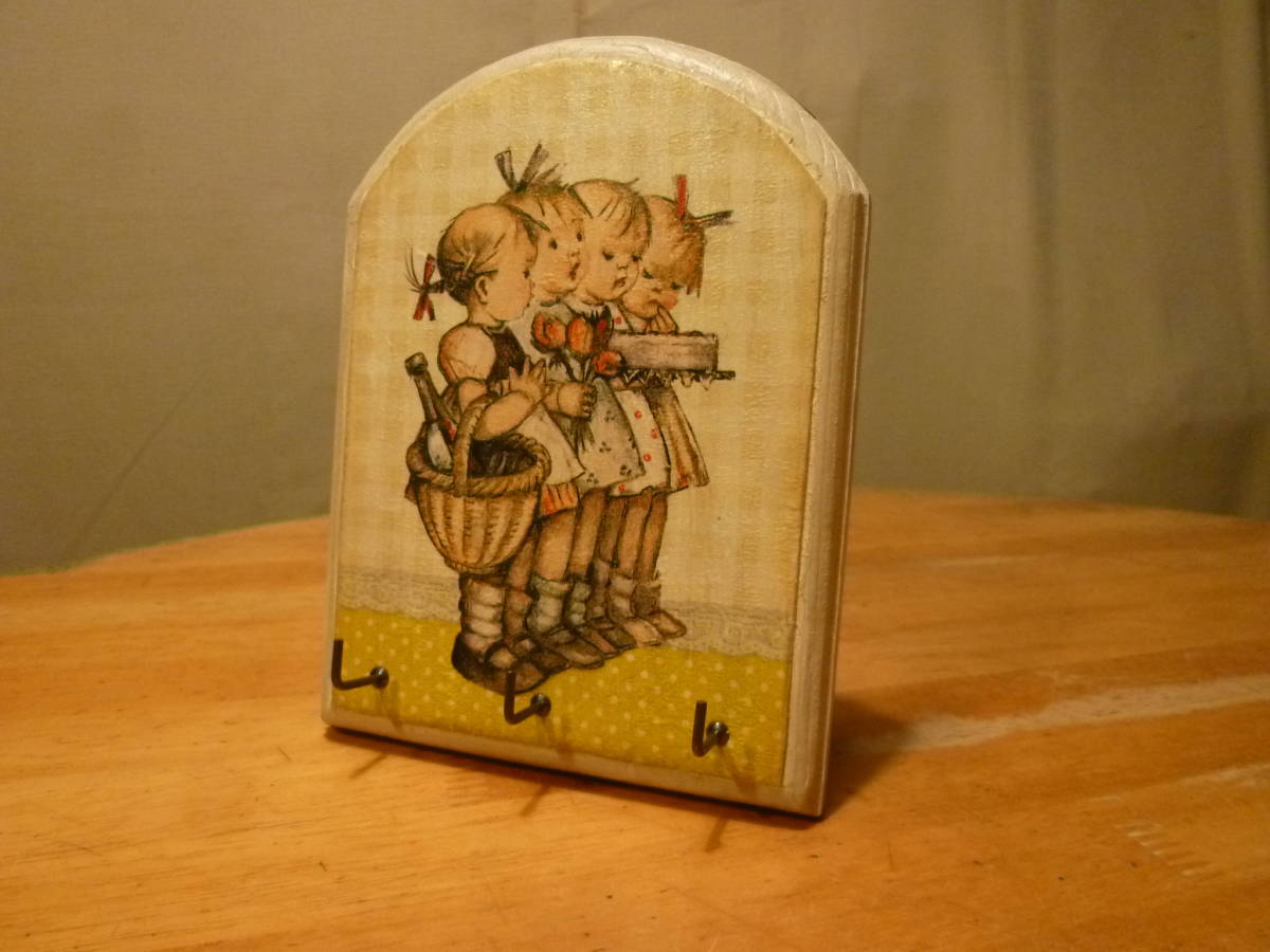 こちらは木製の女の子達のイラスト画入りの壁掛け式キーホルダー?の様です。女の子たちは外国のカントリー風な感じで、リボンを可愛らしく結び一列に並び 何か食べ物をつまんでいる様な表情に見えます。上部裏に壁掛け用のフックが付いて、前面には小さ目なL型キーホルダーが3個付いたものです。