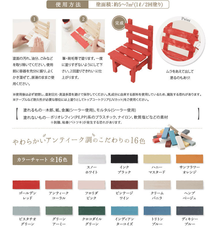 ミルクペイントの特徴のアーリーアメリカンを再現する柔らかな色合い、初心者でも手軽に塗れるのびの良さ、絵の具のように手軽に手が出しやすい手軽なプライスなど・・・・さすが日本のメーカーだわと思わせてくれる完成度で発売され、今やDIY女子たちにも大人気の塗料になりました!