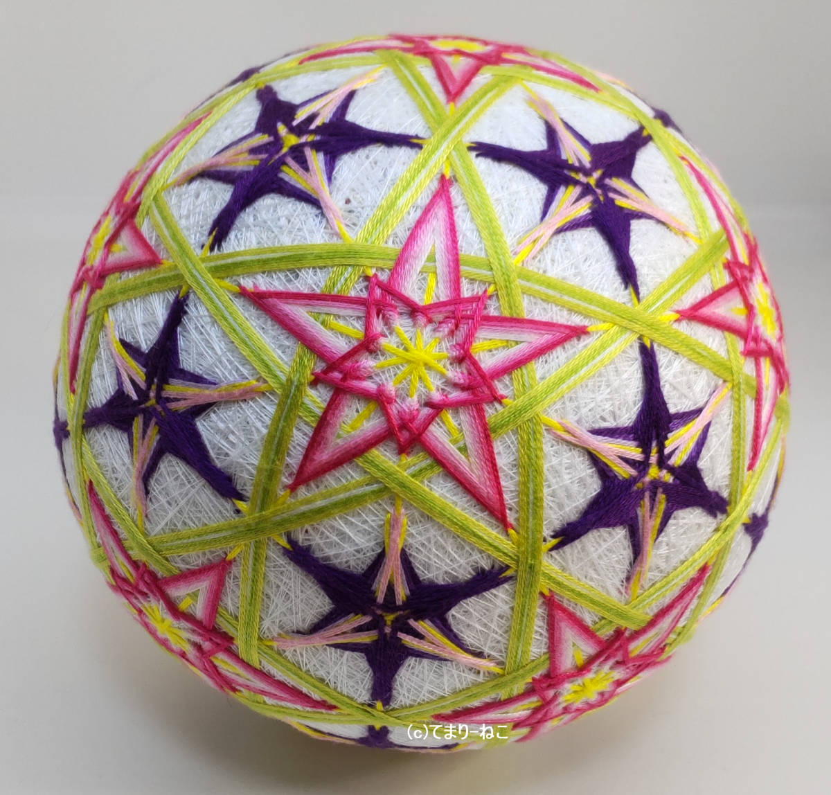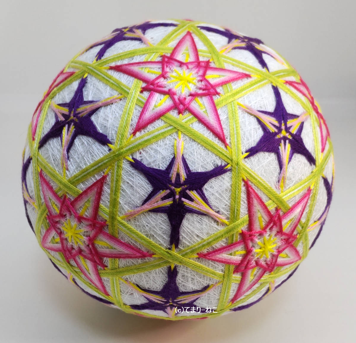 私の手作り品です。 最近作られる多くのてまりが、スチロールボールの土台になってしまいました。 私のてまりは昔ながらに土台の芯にビニール袋に入れた籾殻を使い 毛糸や、ミシン糸で形を整えて 糸を巻いたりステッチをしたりして作品を作っています。 この作品はバウンドしません。 飾り物として模様等を楽しむのが一般的ですが、 手の中で転がして手触りなどを楽しんだり、 室内で宙に投げ模様の変化を楽しんでください。 籾殻は電子レンジで加熱殺菌していますので 内部からの虫の発生はありません。 ですが、天然素材のため虫食いの可能性もあります。 防虫剤の使用をお勧めします。 もみ殻の匂い消しをかねて香木を刻んだものが入っています。 お線香のような匂いがします。 気になる方は風通しの良い日の当たらない場所に置いてください。 |