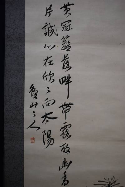 【参考】 作者不詳 菊画賛 もみ表装 【作品状態】 本紙は紙本肉筆です。 本紙は薄汚れ・多少の巻シワがあります。 表装はもみ紙表装で概ね良好です。 桐合箱付 軸丈 縦 192㎝×幅 50㎝ 写真で状態をご判断の上、宜しくお願い致します。